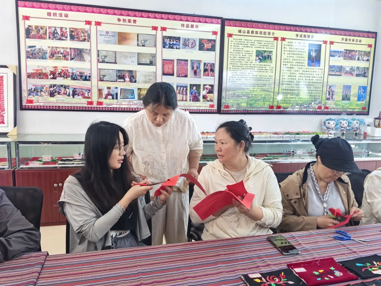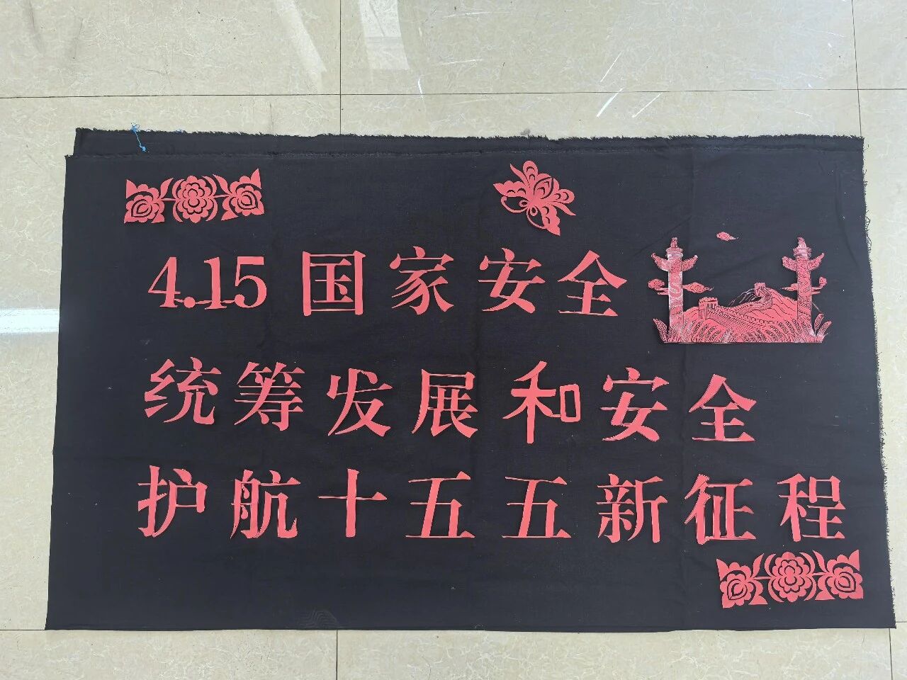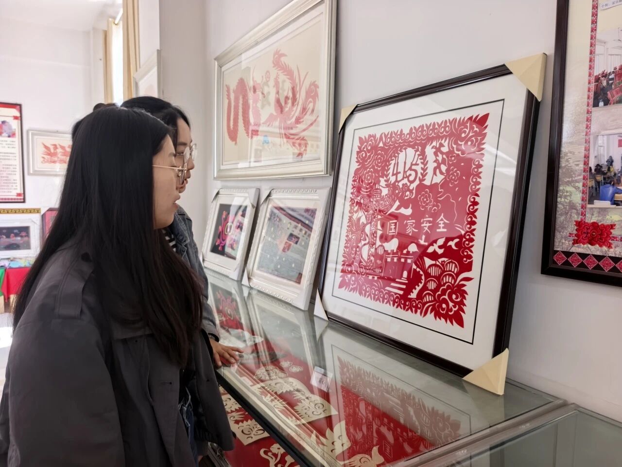 彝绣传承室内,红纸铺展、剪刀轻扬。“剪纸不仅是手艺,更是一种文化表达,把国家安全剪进作品里,就是把责任记在心上。”钱映花老师在现场分享道。在她的耐心指导下,干部职工们凝神静气、细心裁剪,一刀一线勾勒家国情怀,一折一剪镌刻安全使命。一幅幅主题鲜明、构思精巧的剪纸作品陆续呈现,既有庄重的“国安”字样,也有寓意平安的民族纹样,生动展现了大家守护国家安全、共建和谐家园的真挚情感。