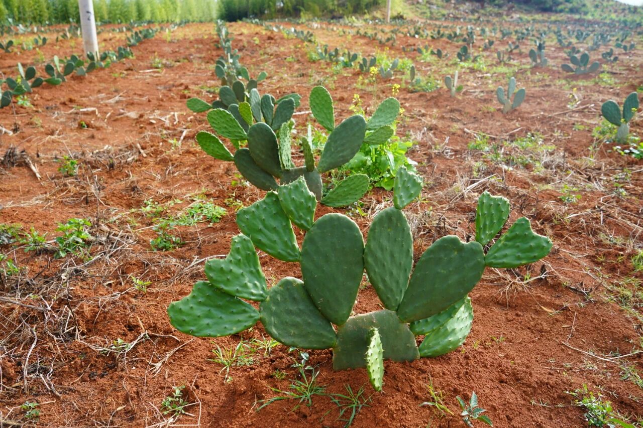 “从安宁引进的84亩仙人掌试种成功后,8月又流转三台坡和小街街道土地扩大种植,目前总面积已达300多亩。” 基地负责人郝继文蹲在田垄边,轻抚着厚实的掌片介绍,当前仙人掌正处于旺盛生长期,预计明年4月进入挂果期,7至8月即可迎来首次采收。作为耐旱易活的“懒庄稼”,基地种植的云钻、滇红、宝塔三个仙人掌品种尽显产业优势:一次种植可终身受益,成活率高且管护简便,契合本地种植条件。