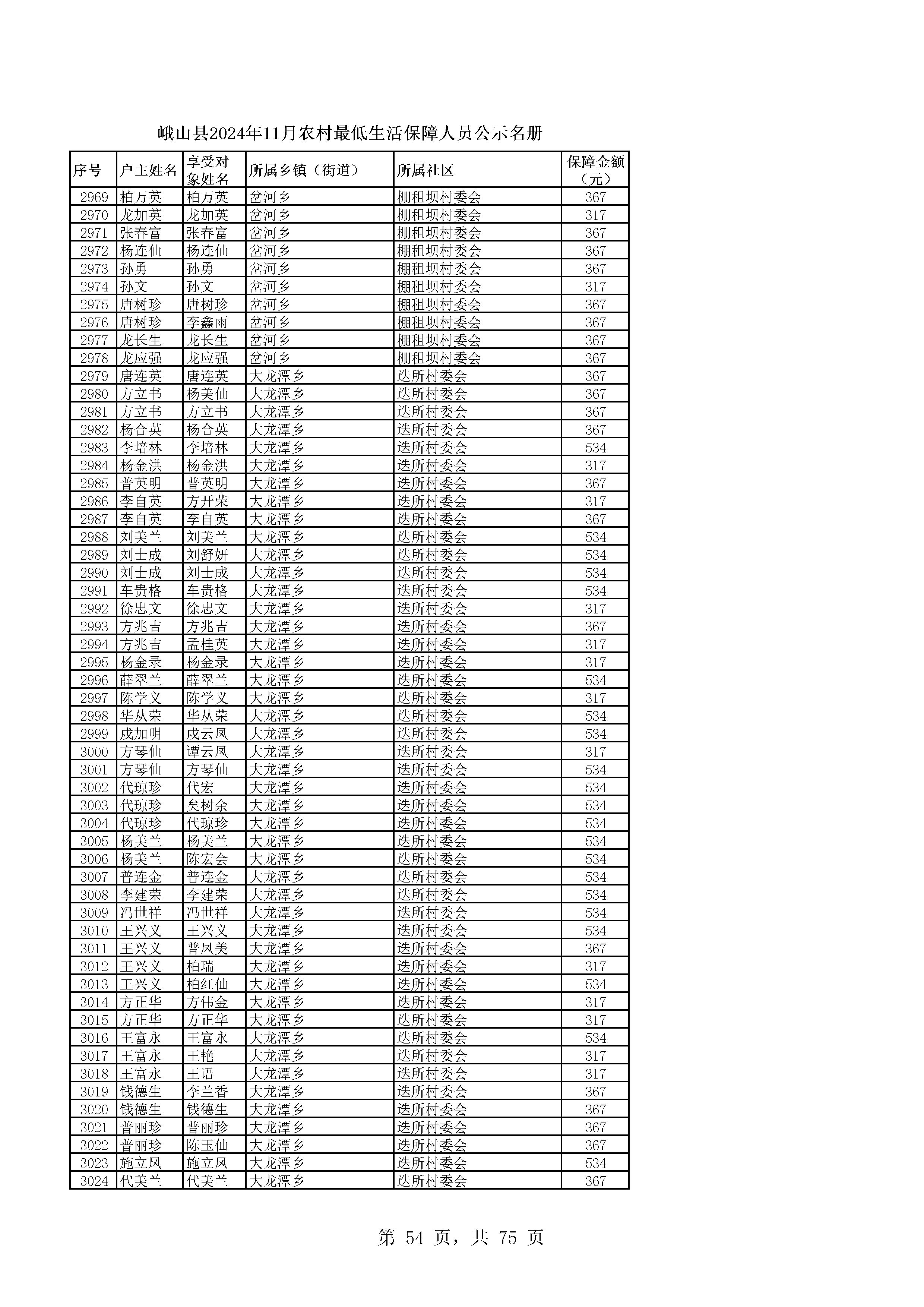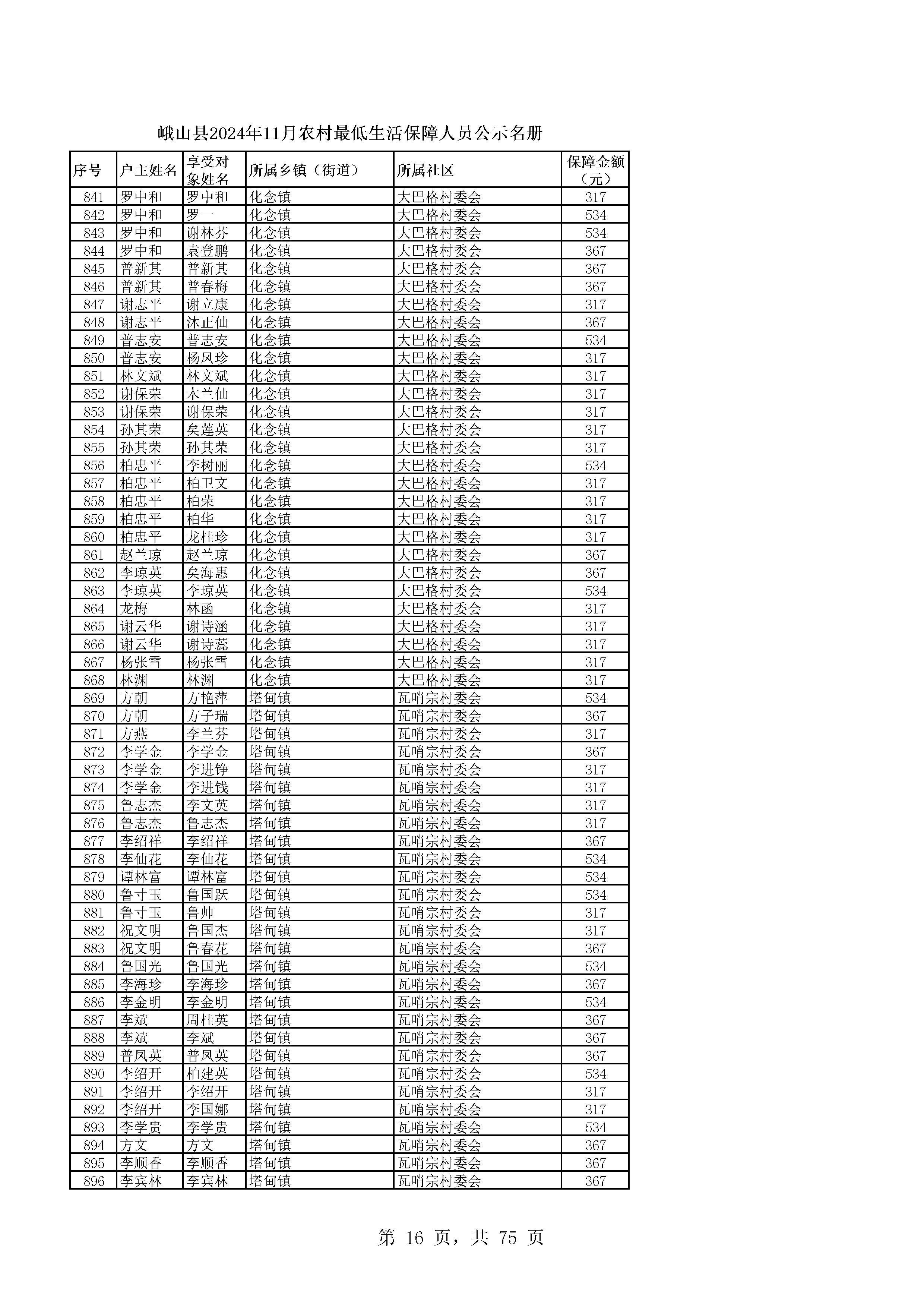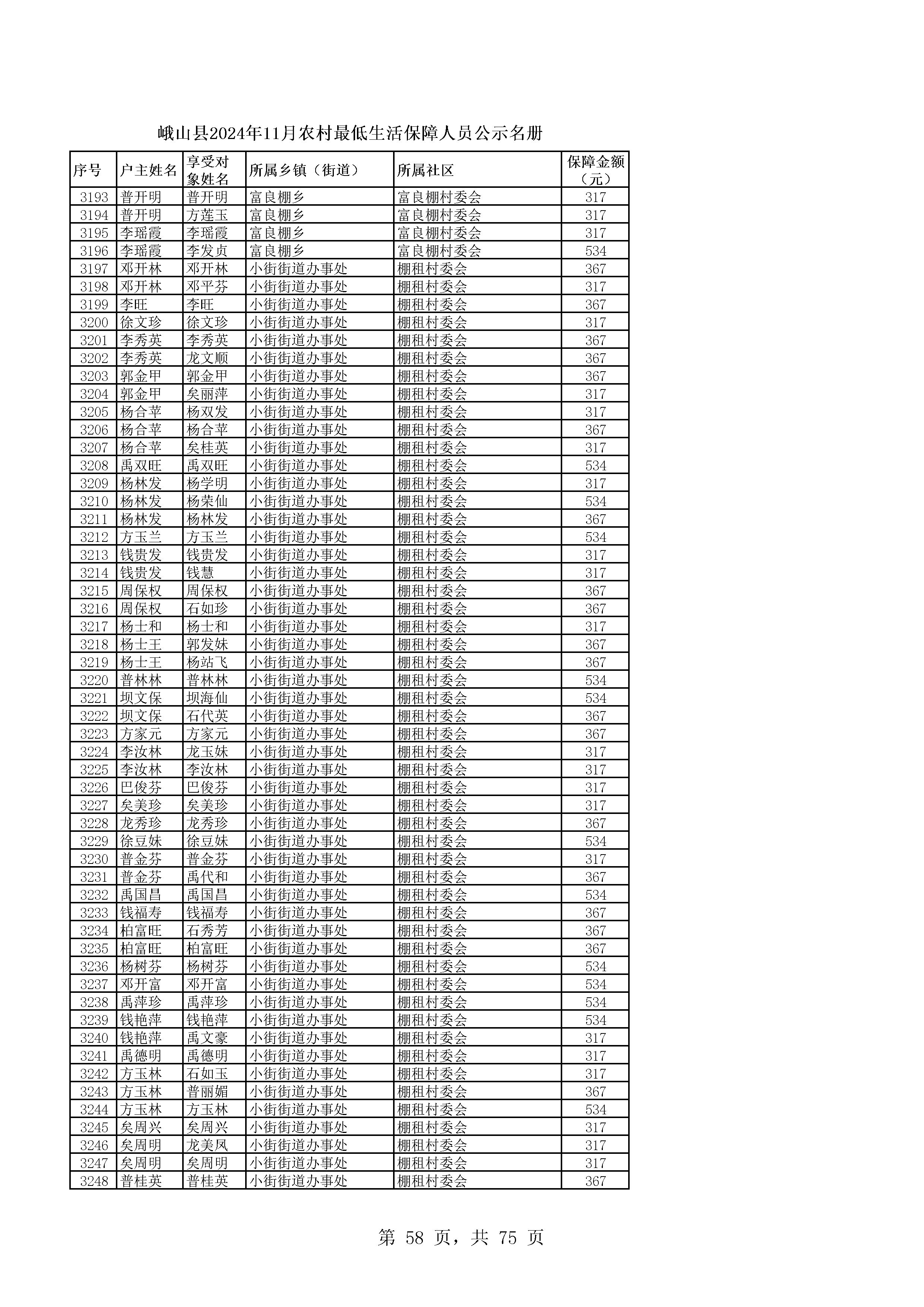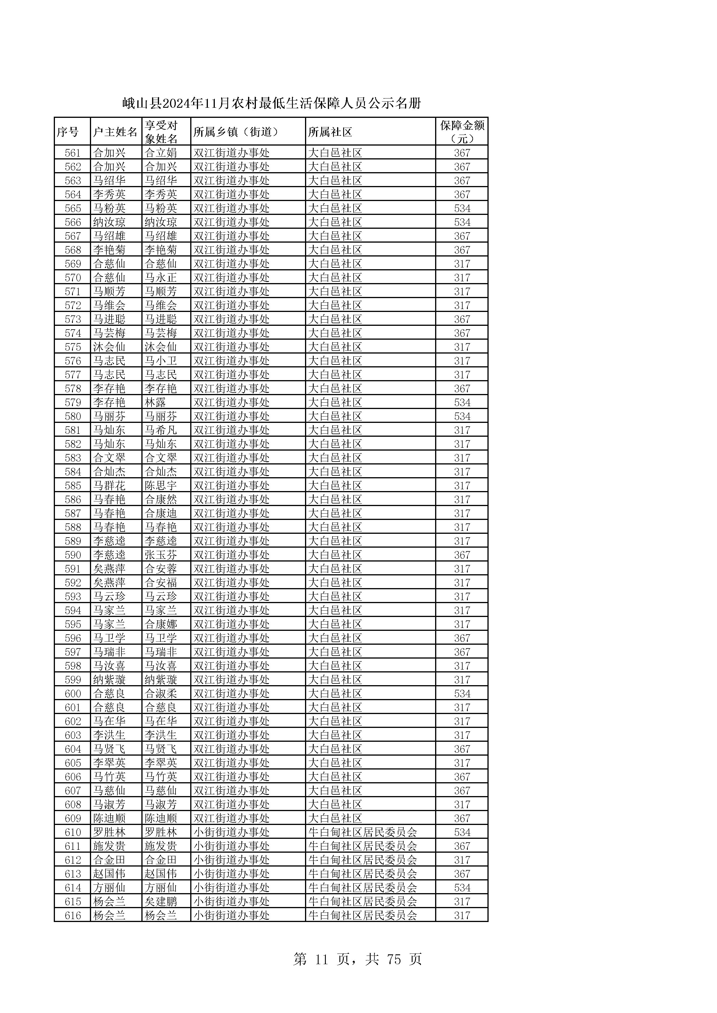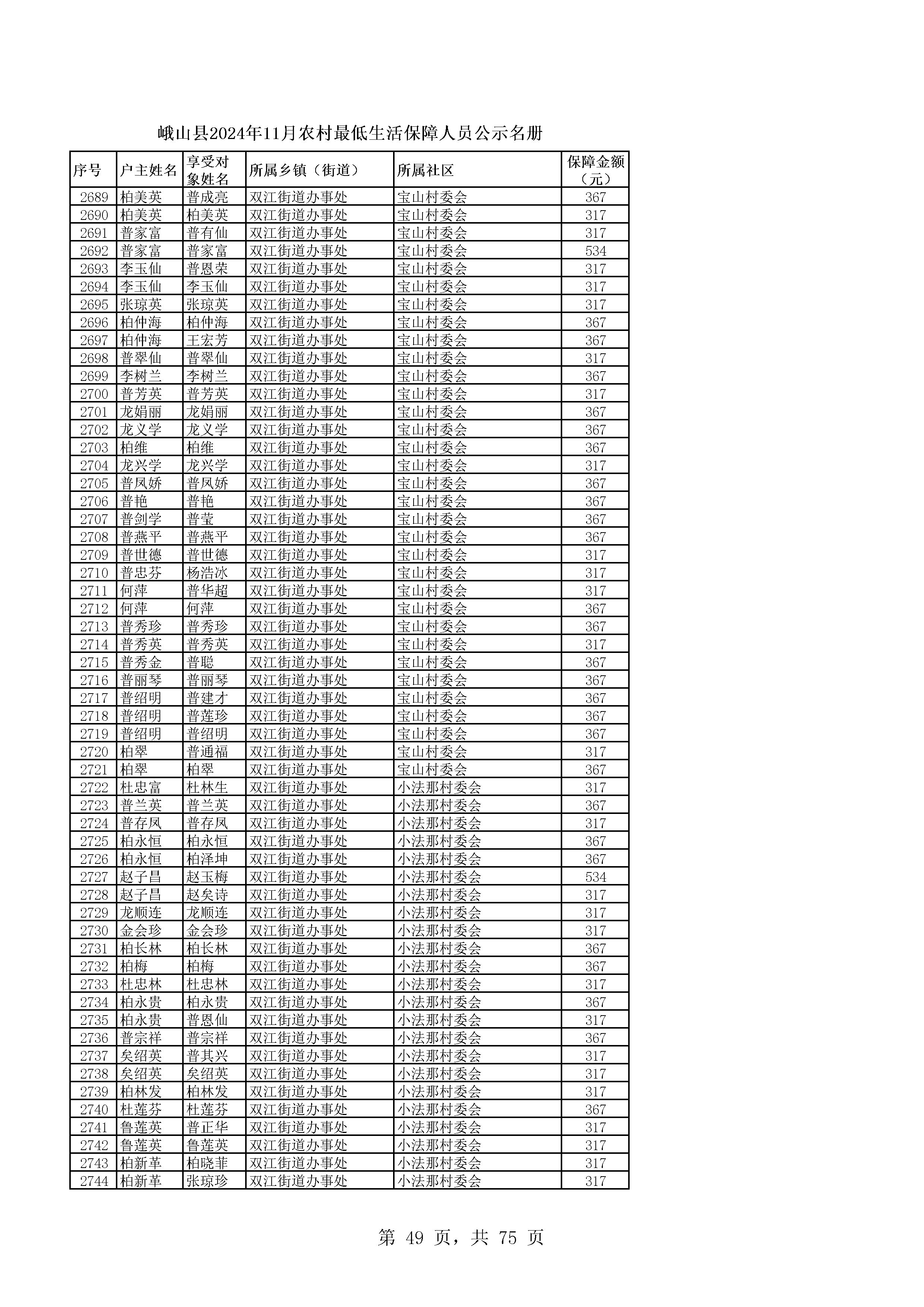 峨山县2024年11月农村最低生活保障人员公示名册