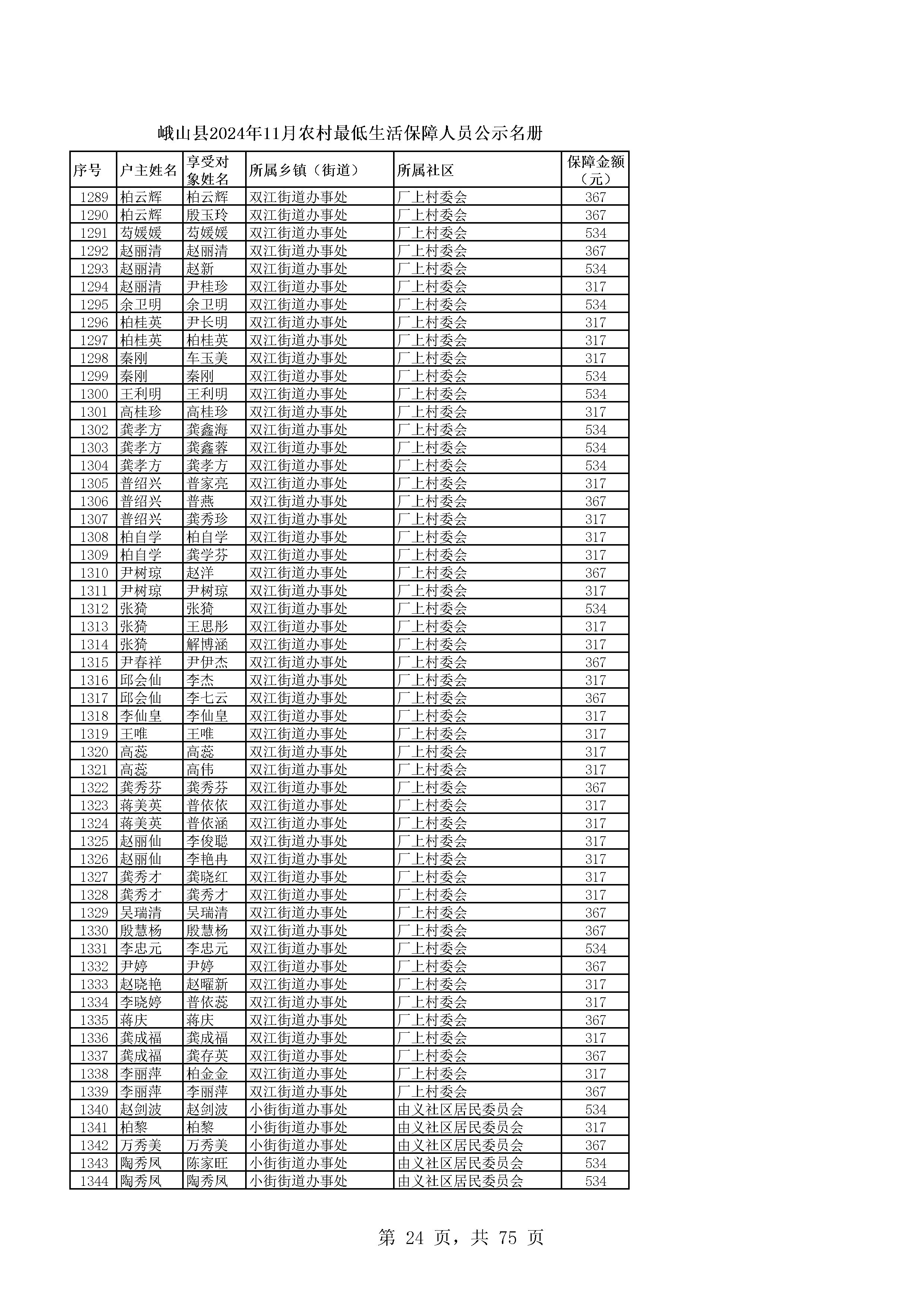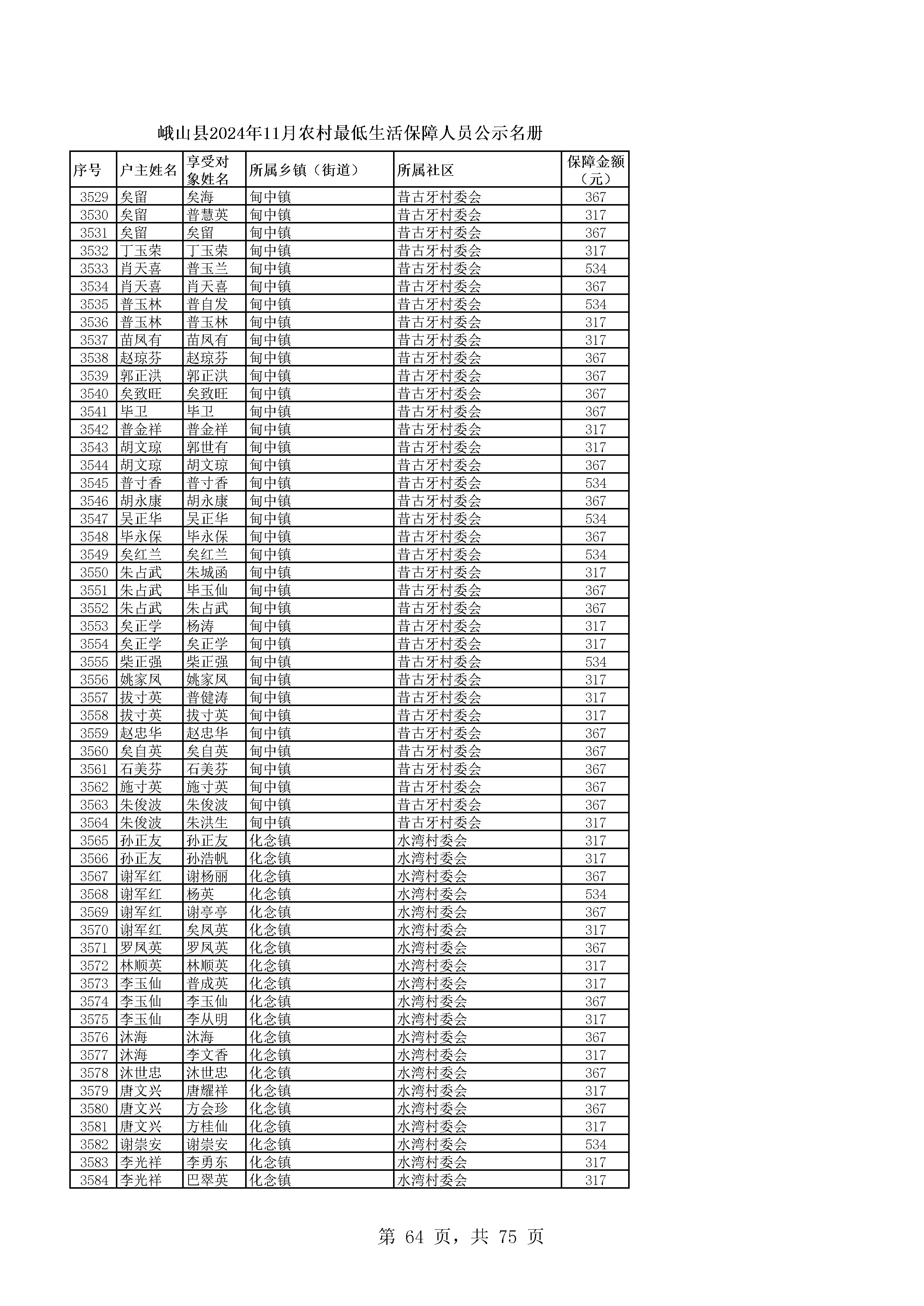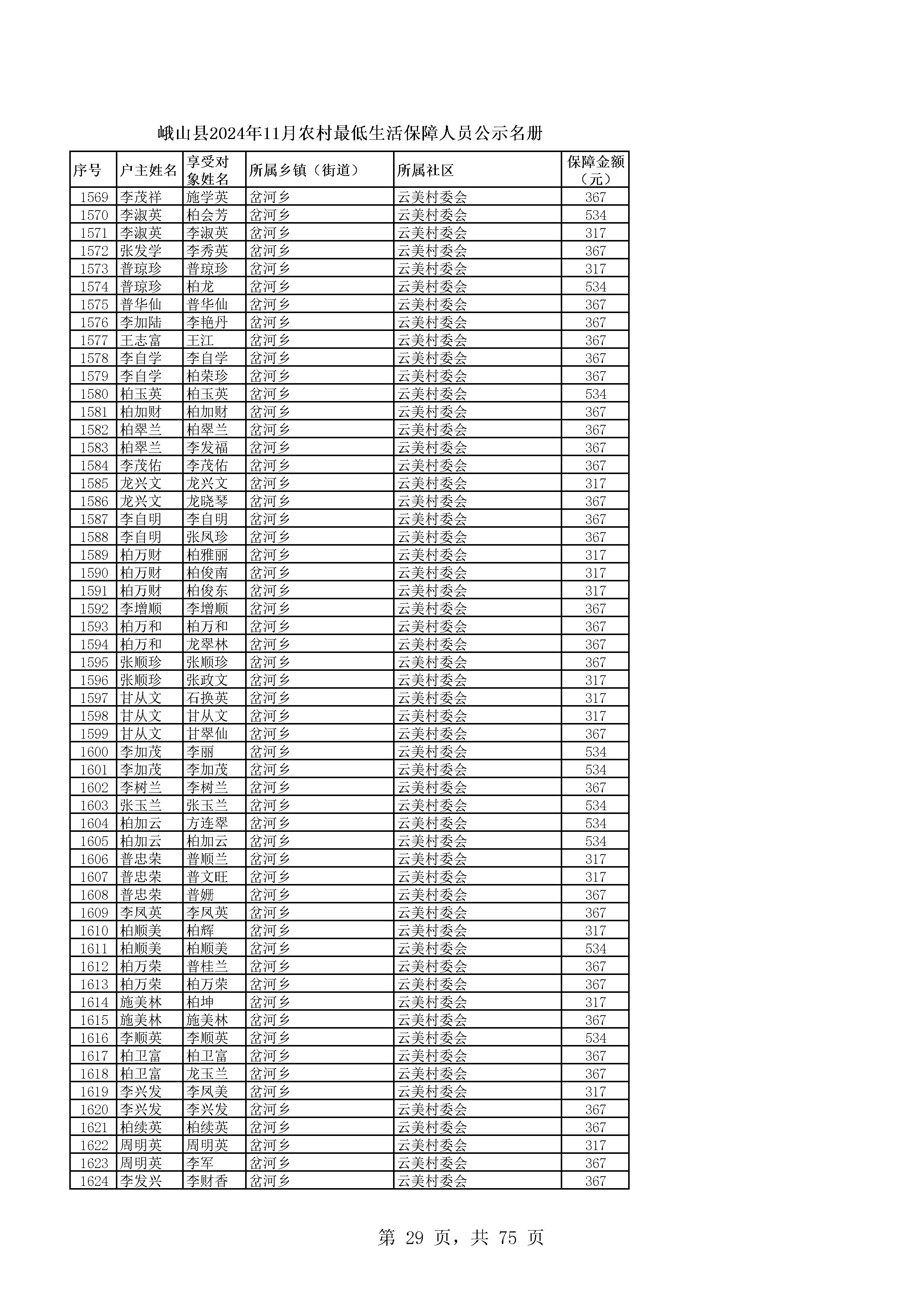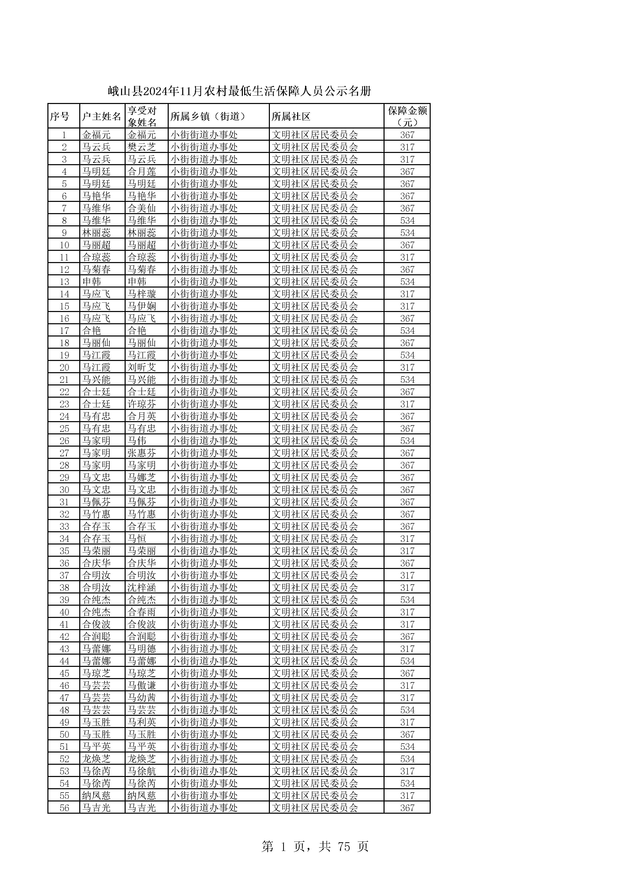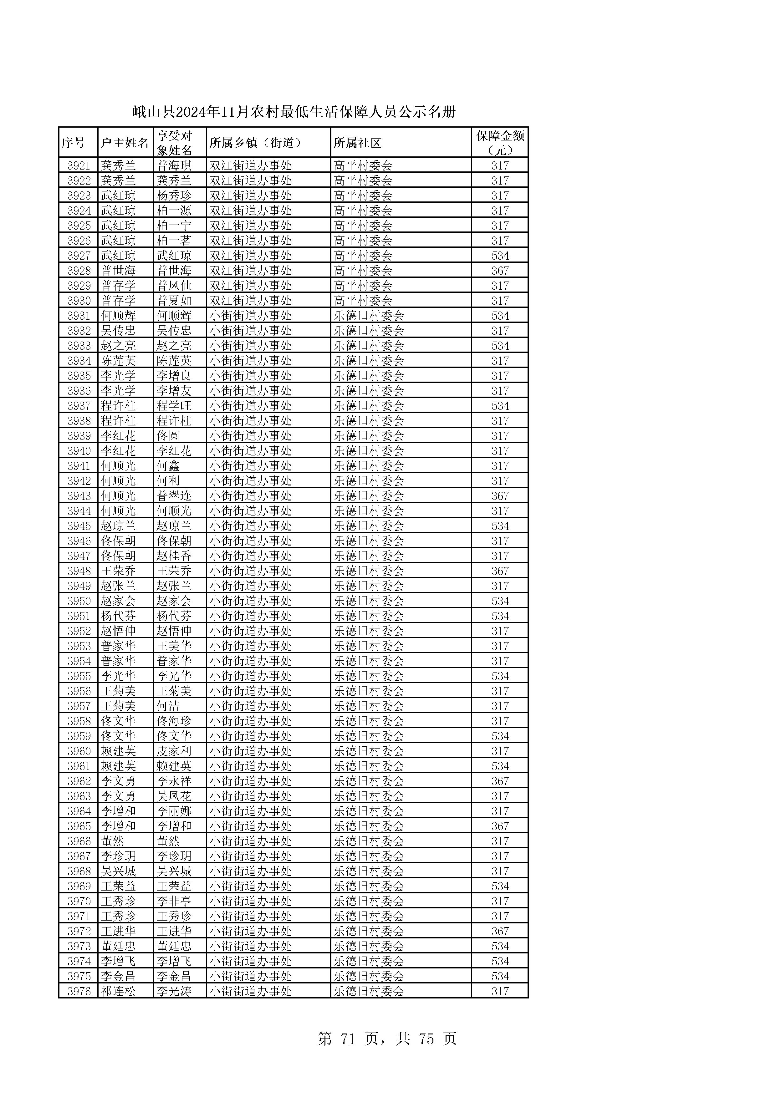 峨山县2024年11月农村最低生活保障人员公示名册