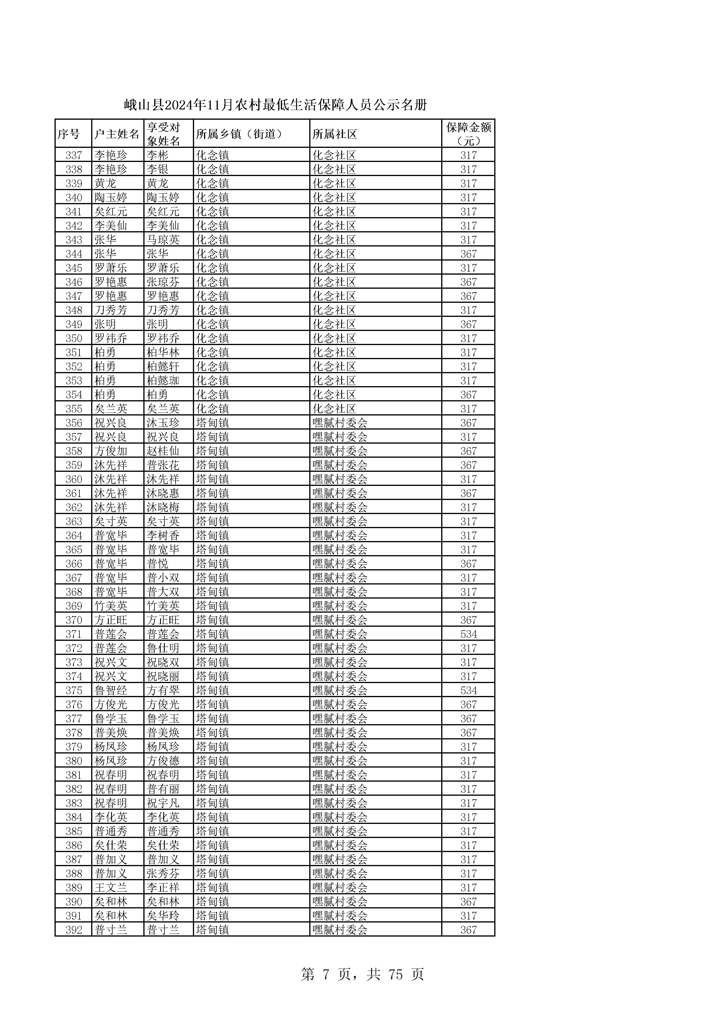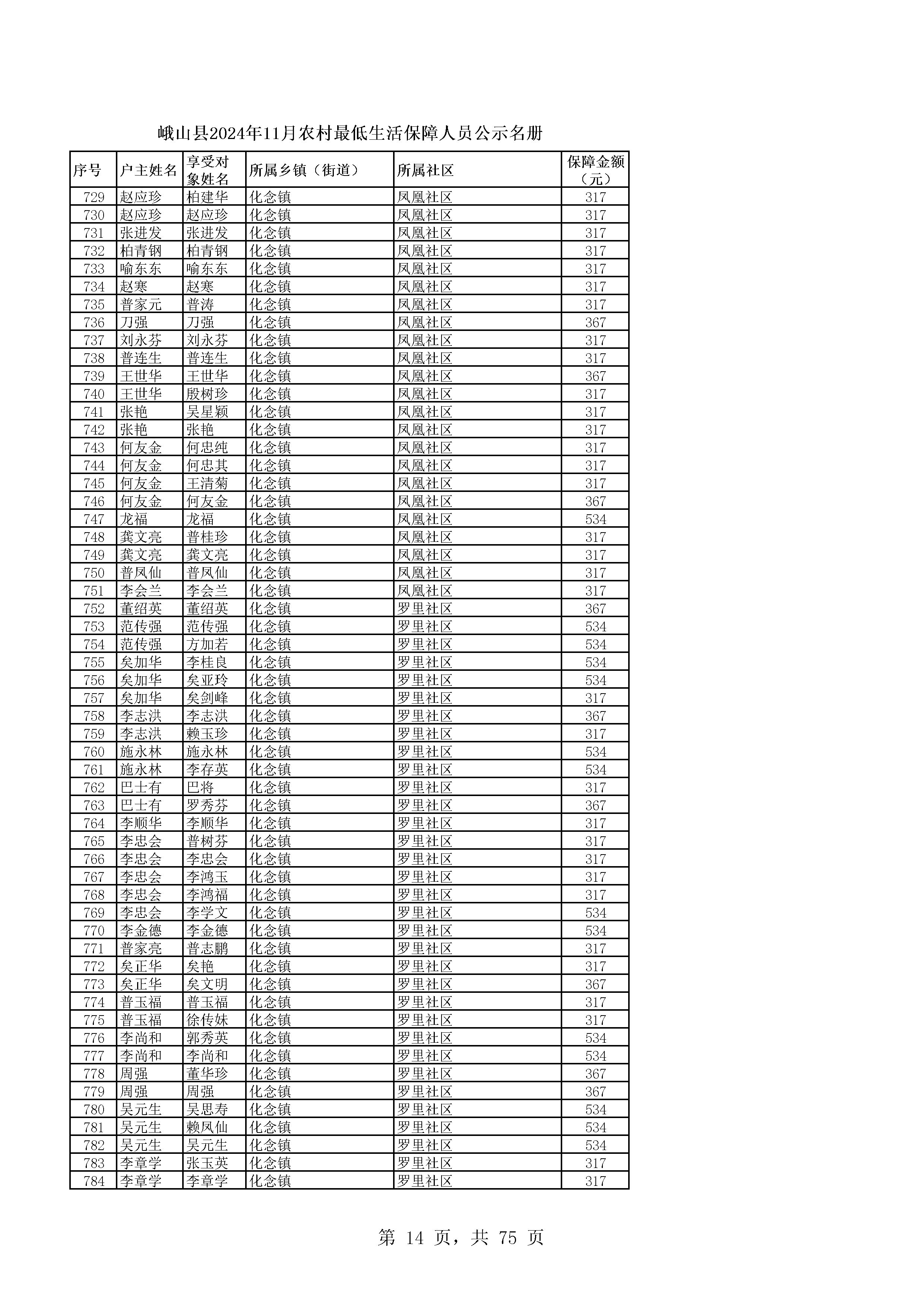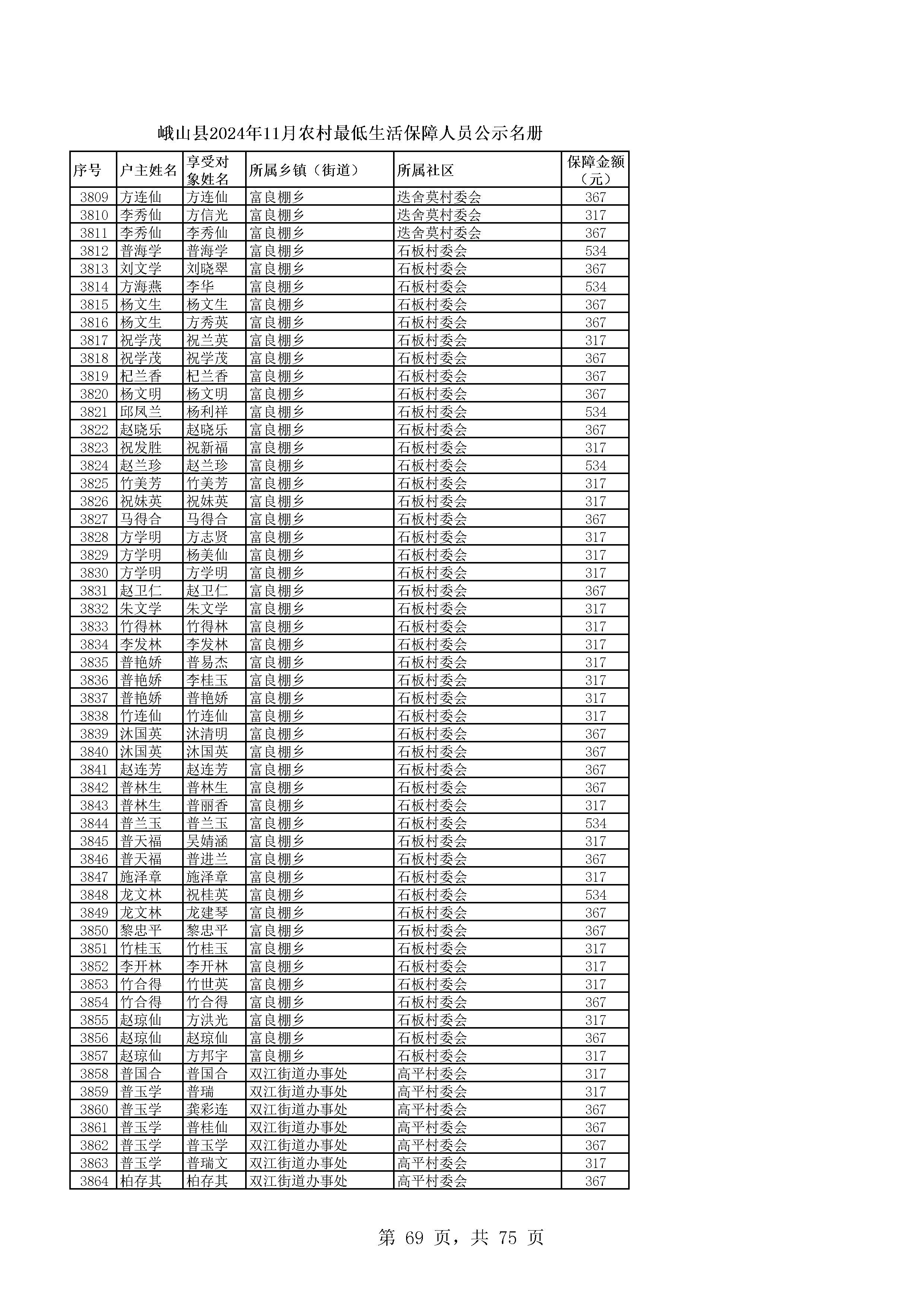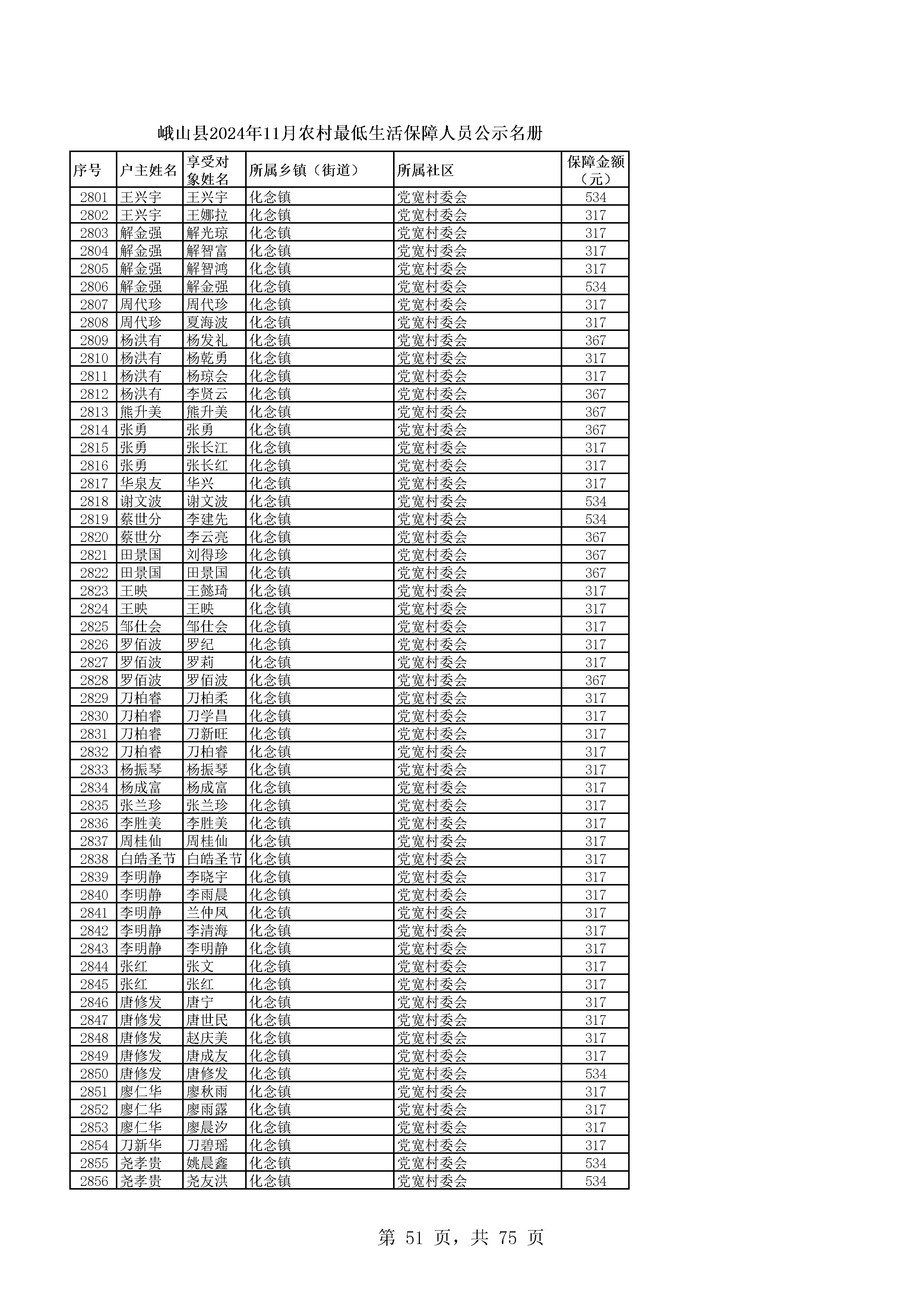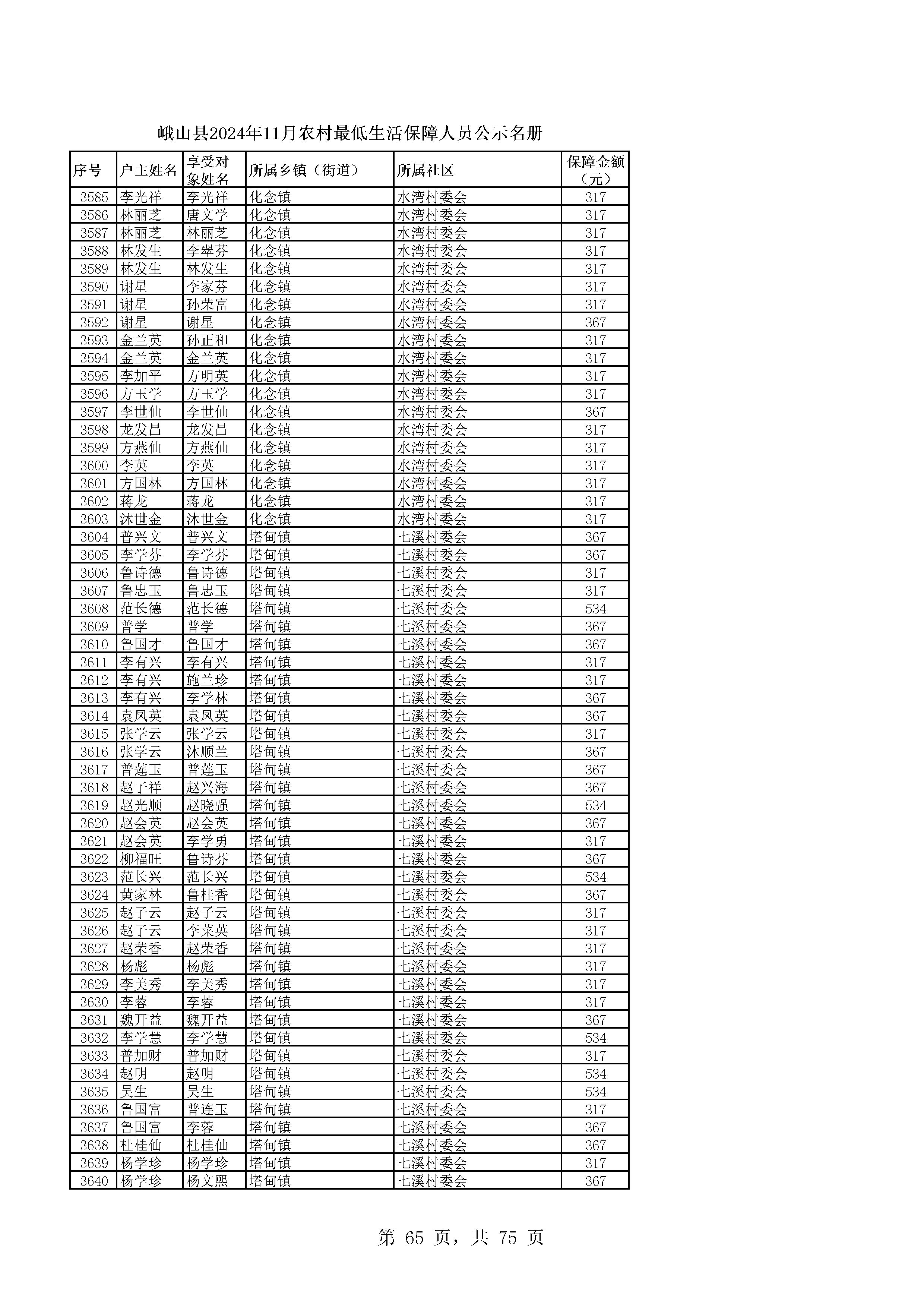 峨山县2024年11月农村最低生活保障人员公示名册