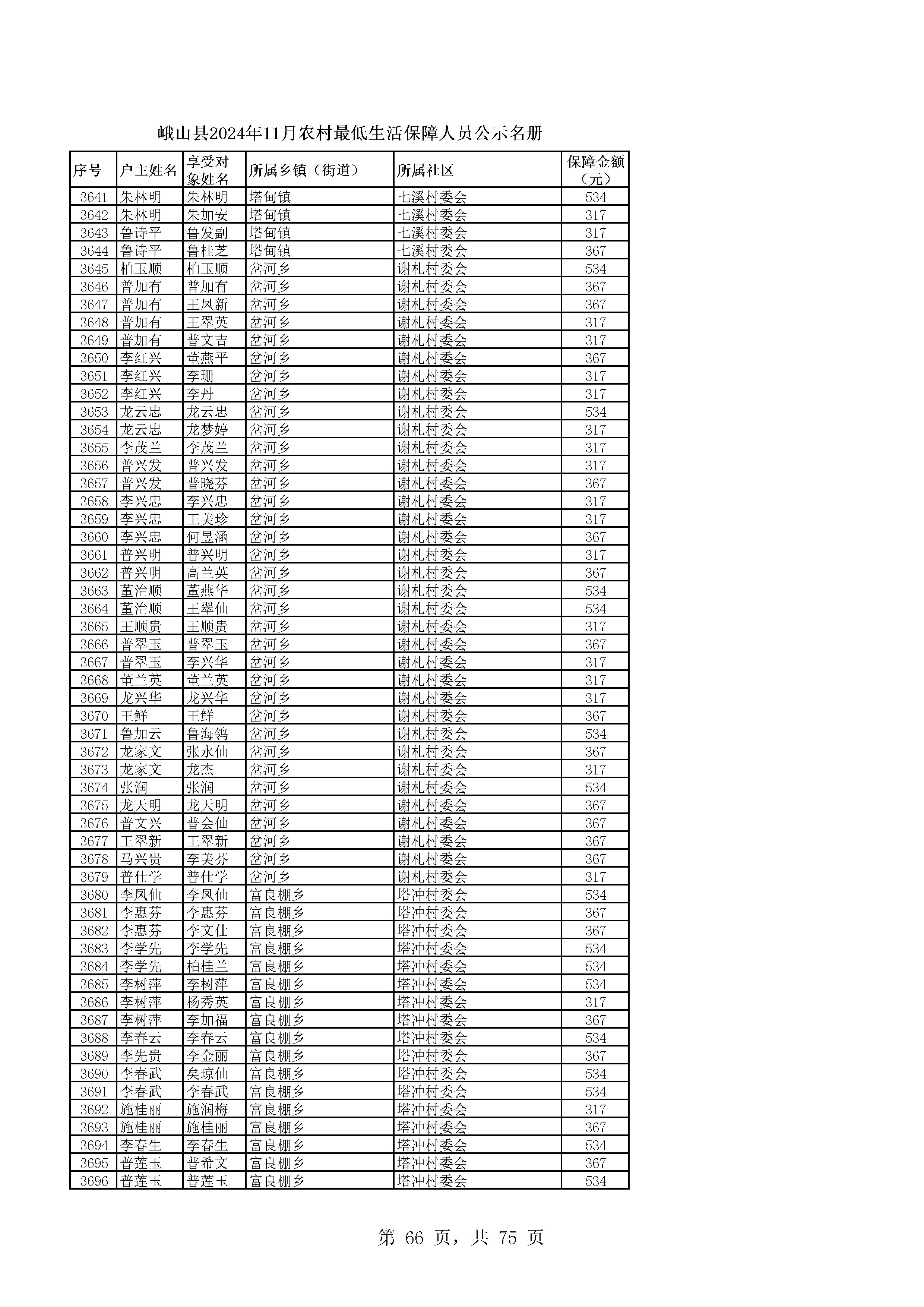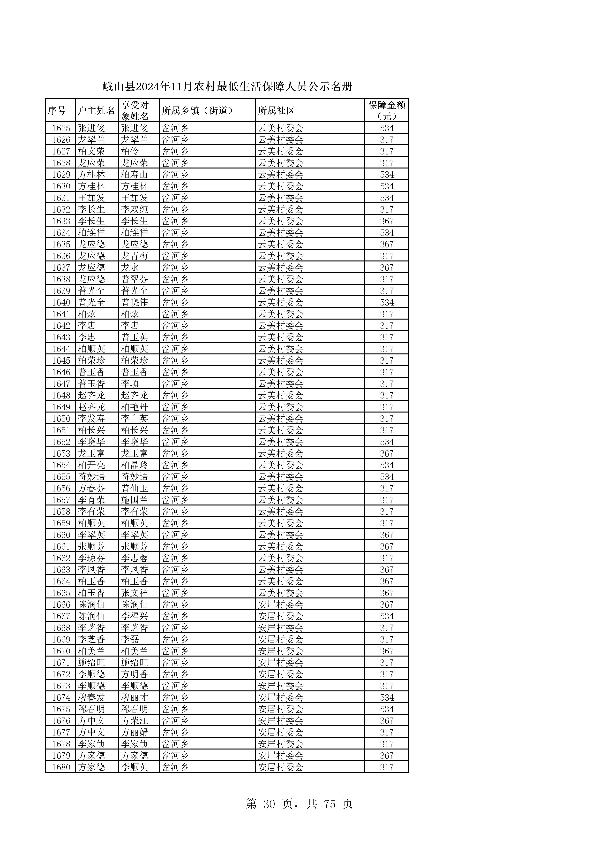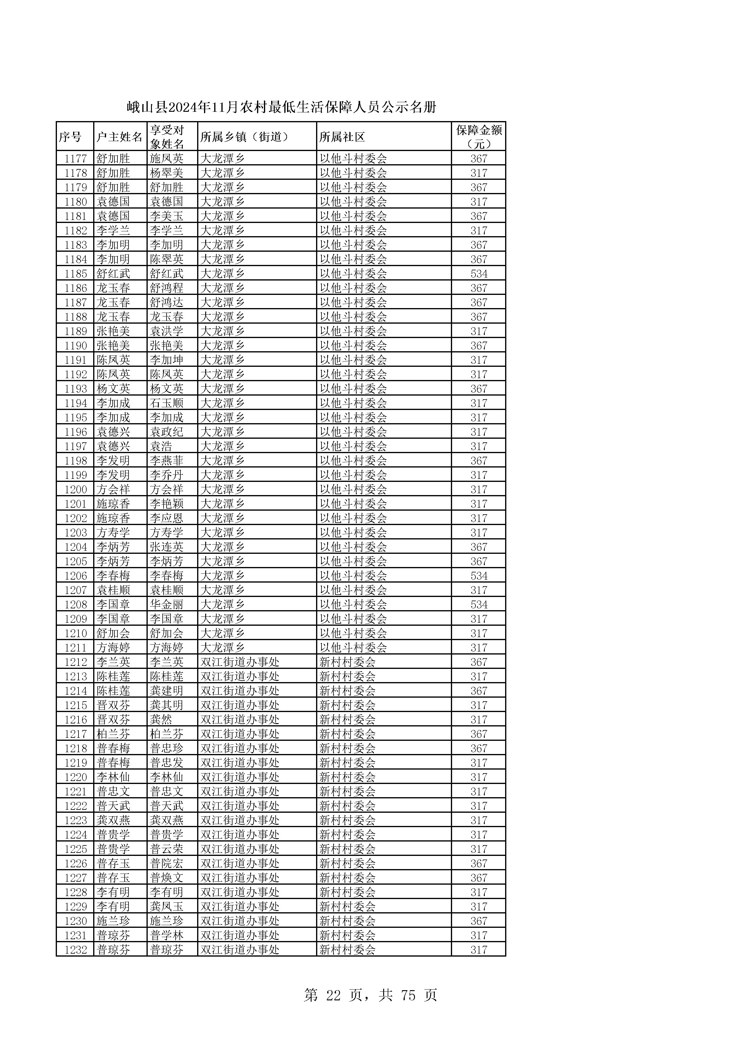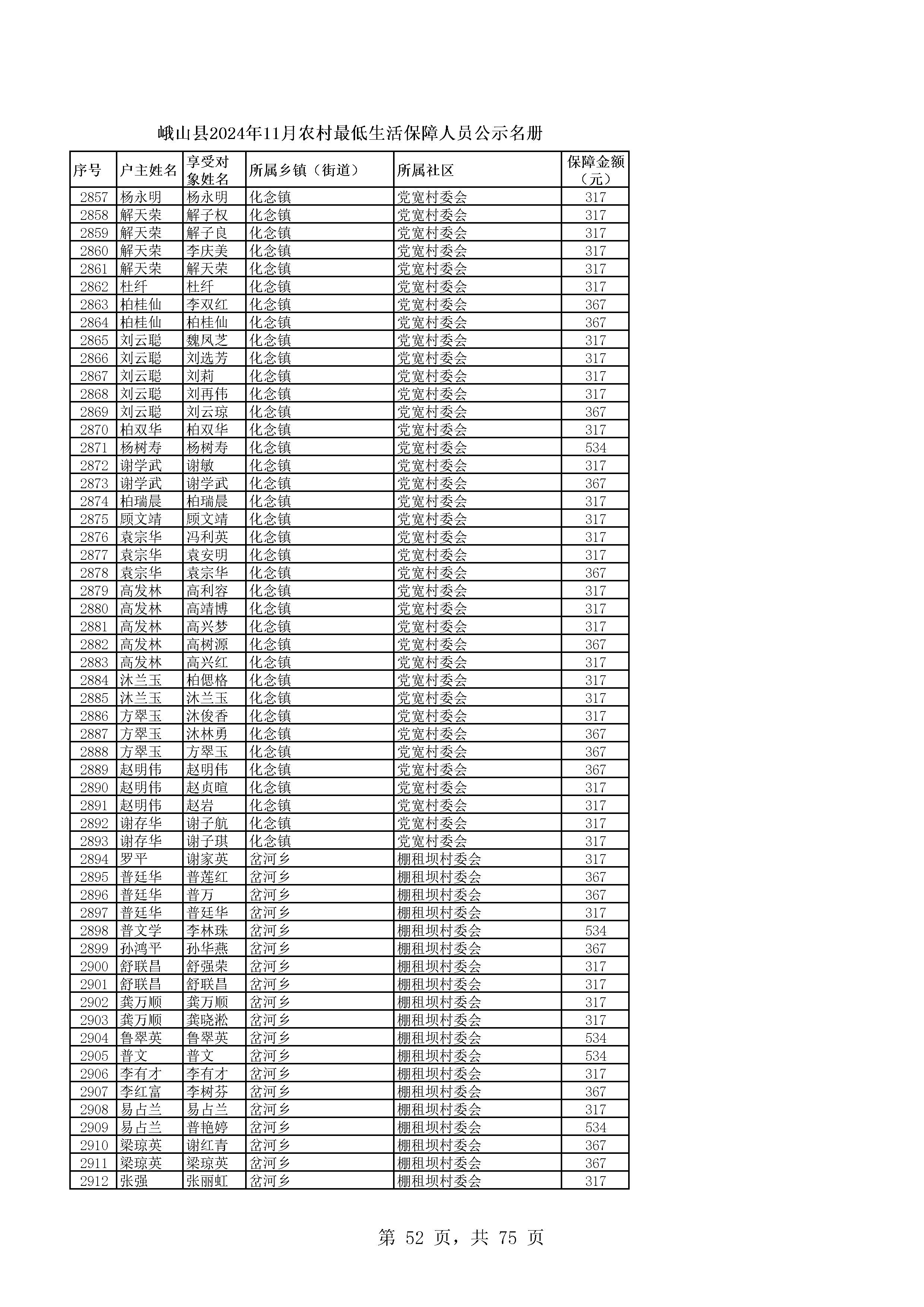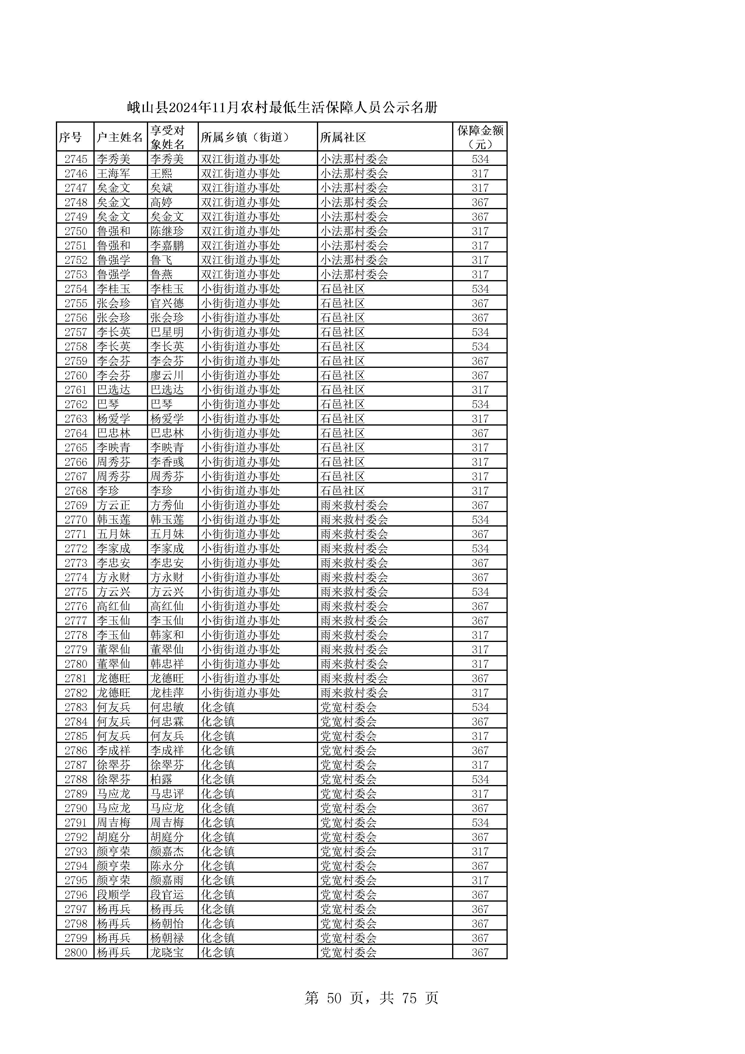 峨山县2024年11月农村最低生活保障人员公示名册