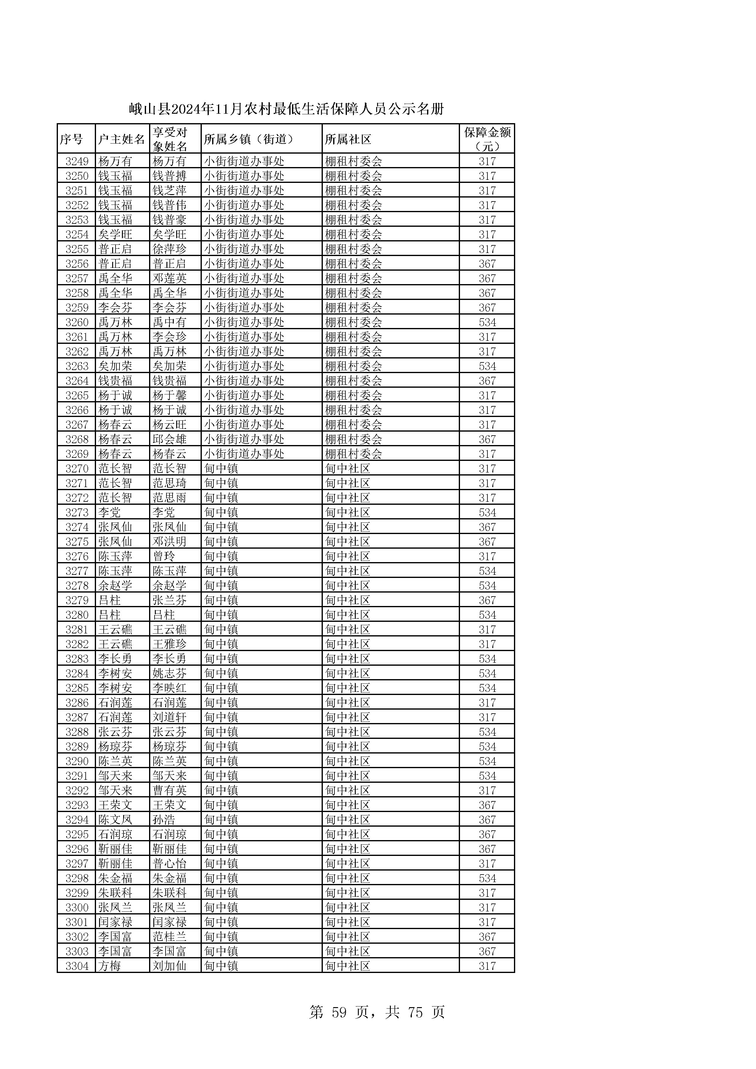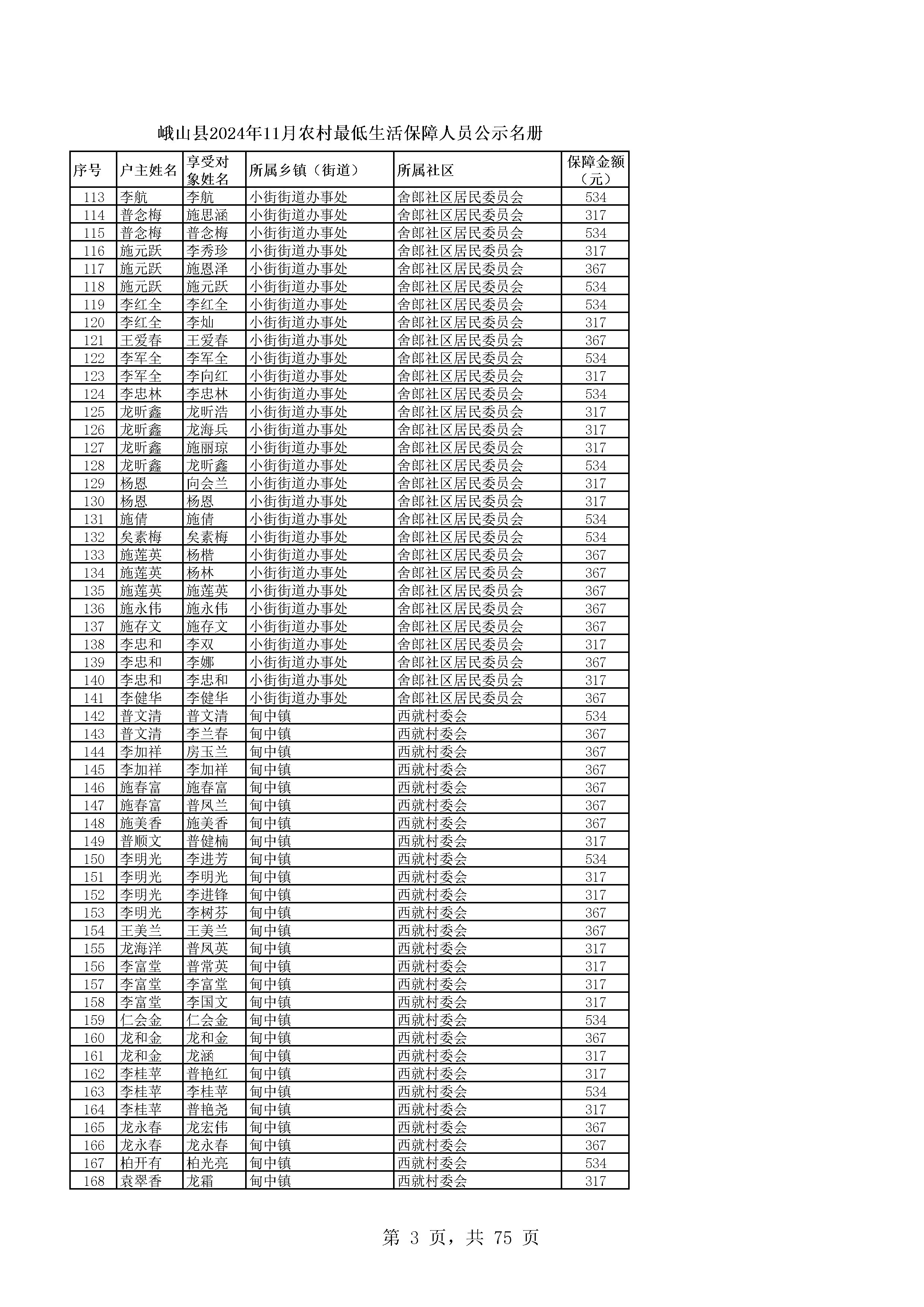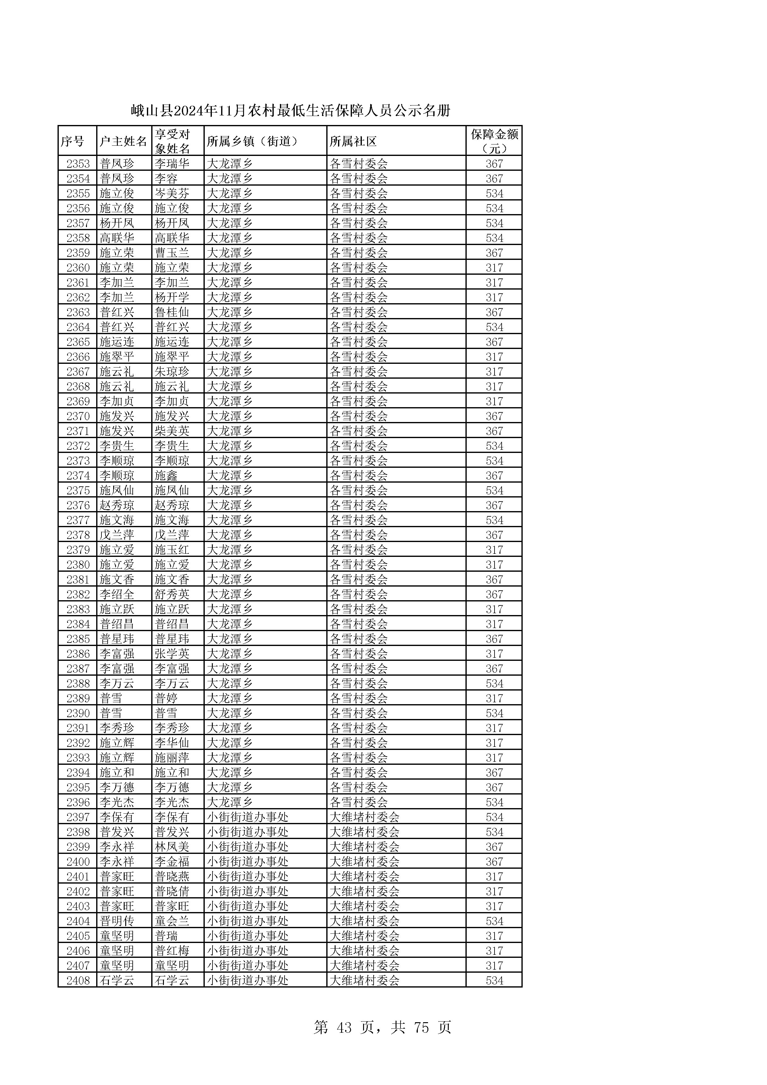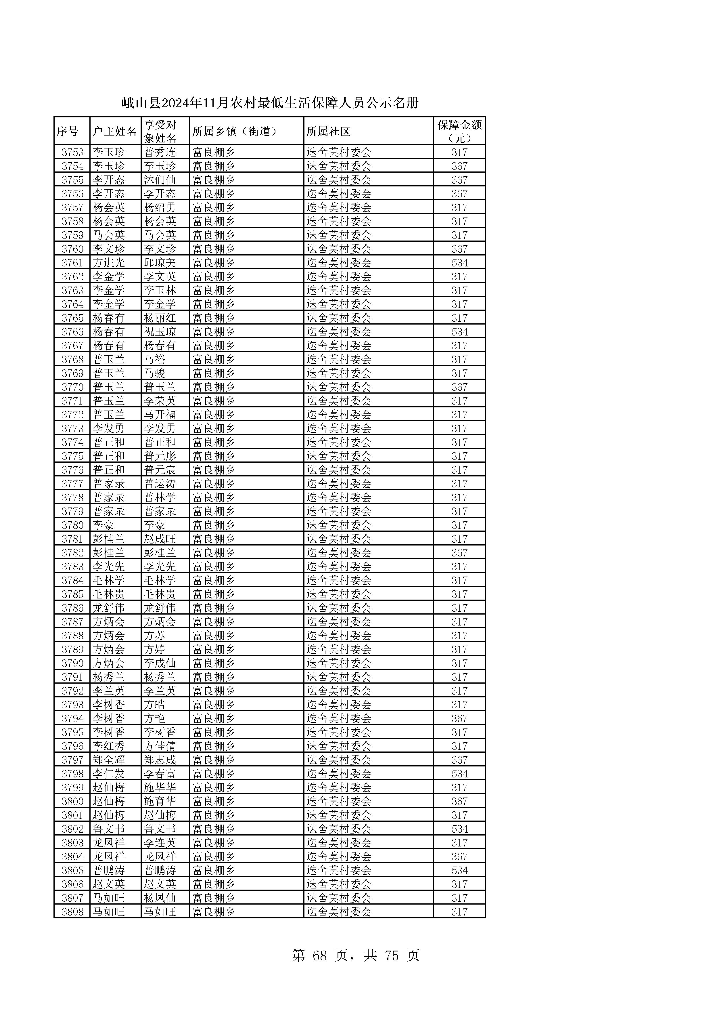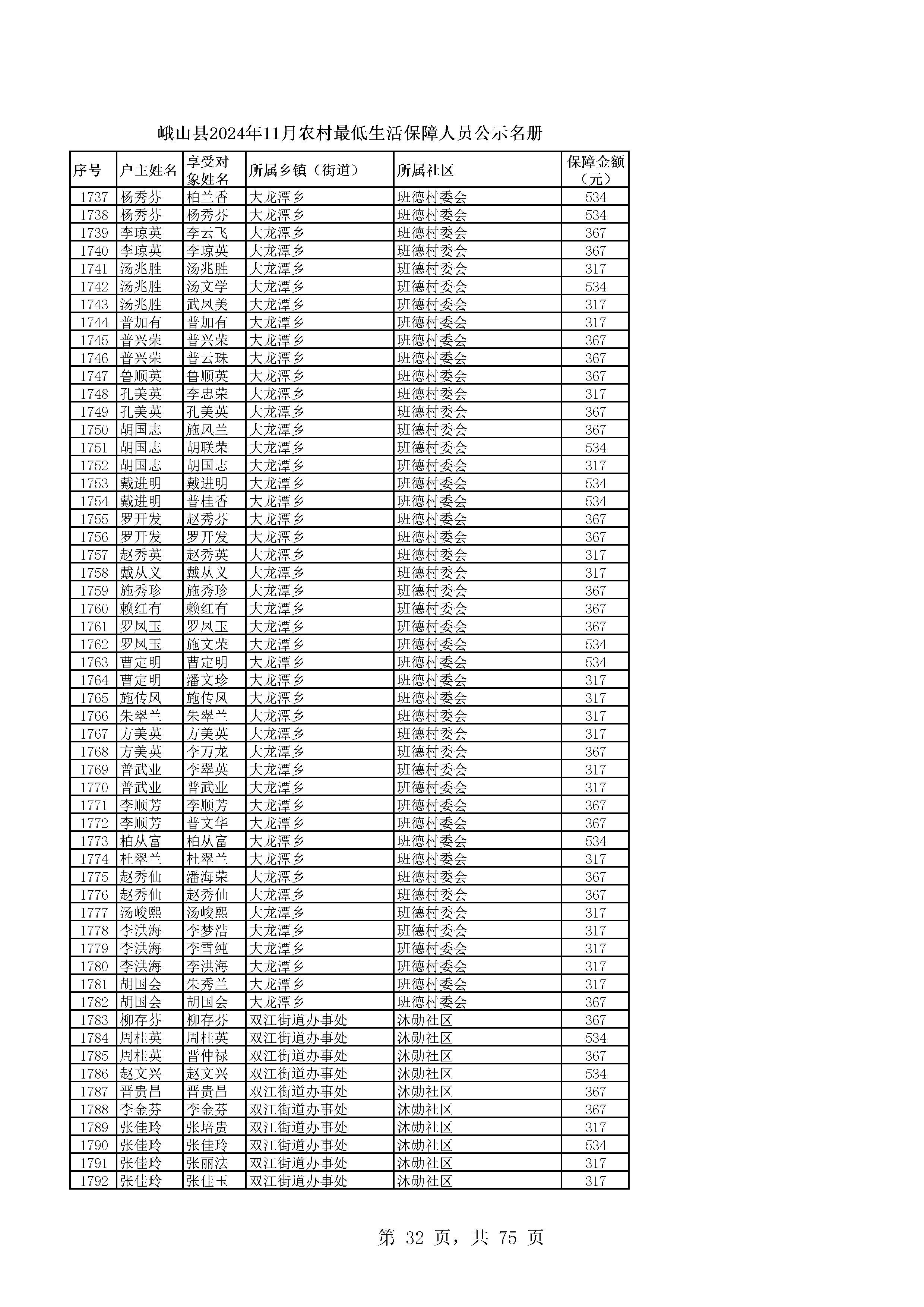 峨山县2024年11月农村最低生活保障人员公示名册