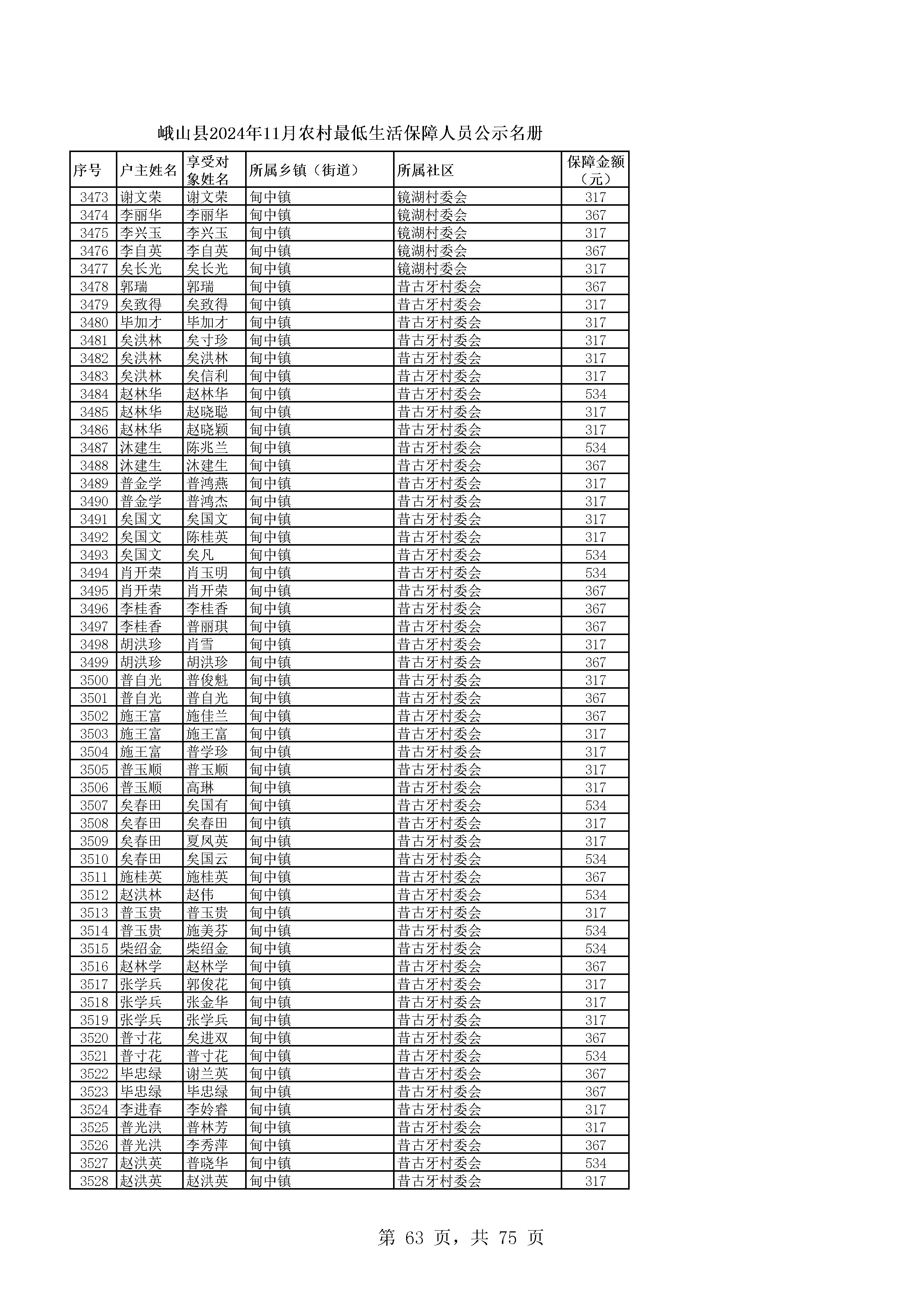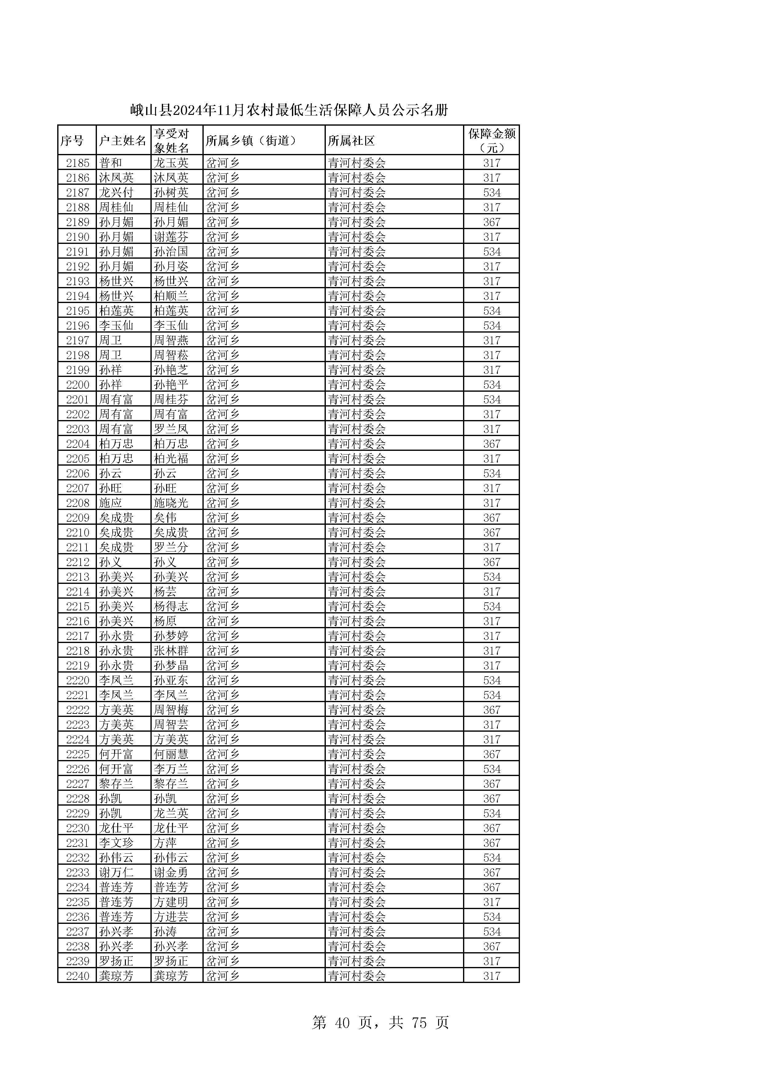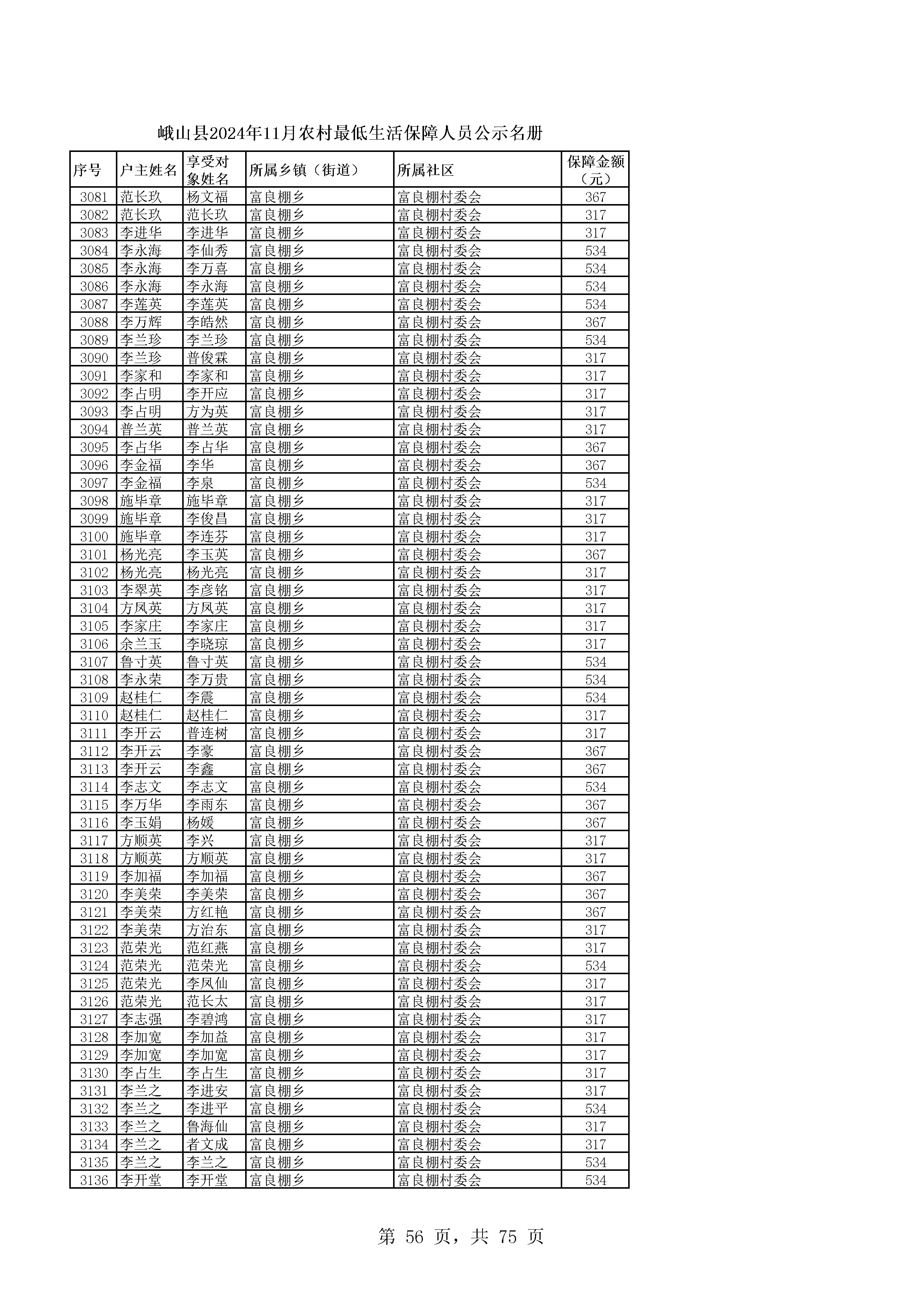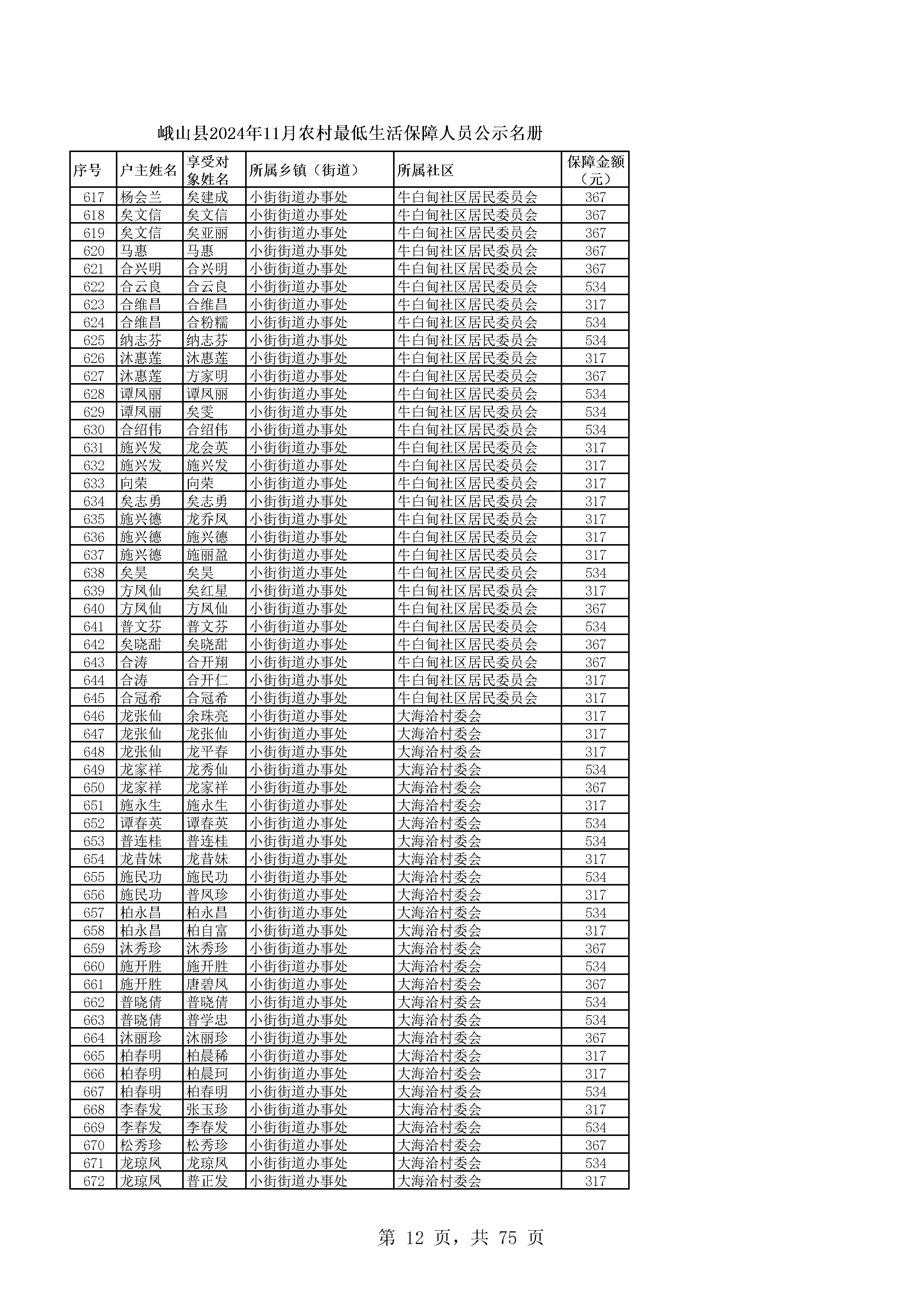 峨山县2024年11月农村最低生活保障人员公示名册