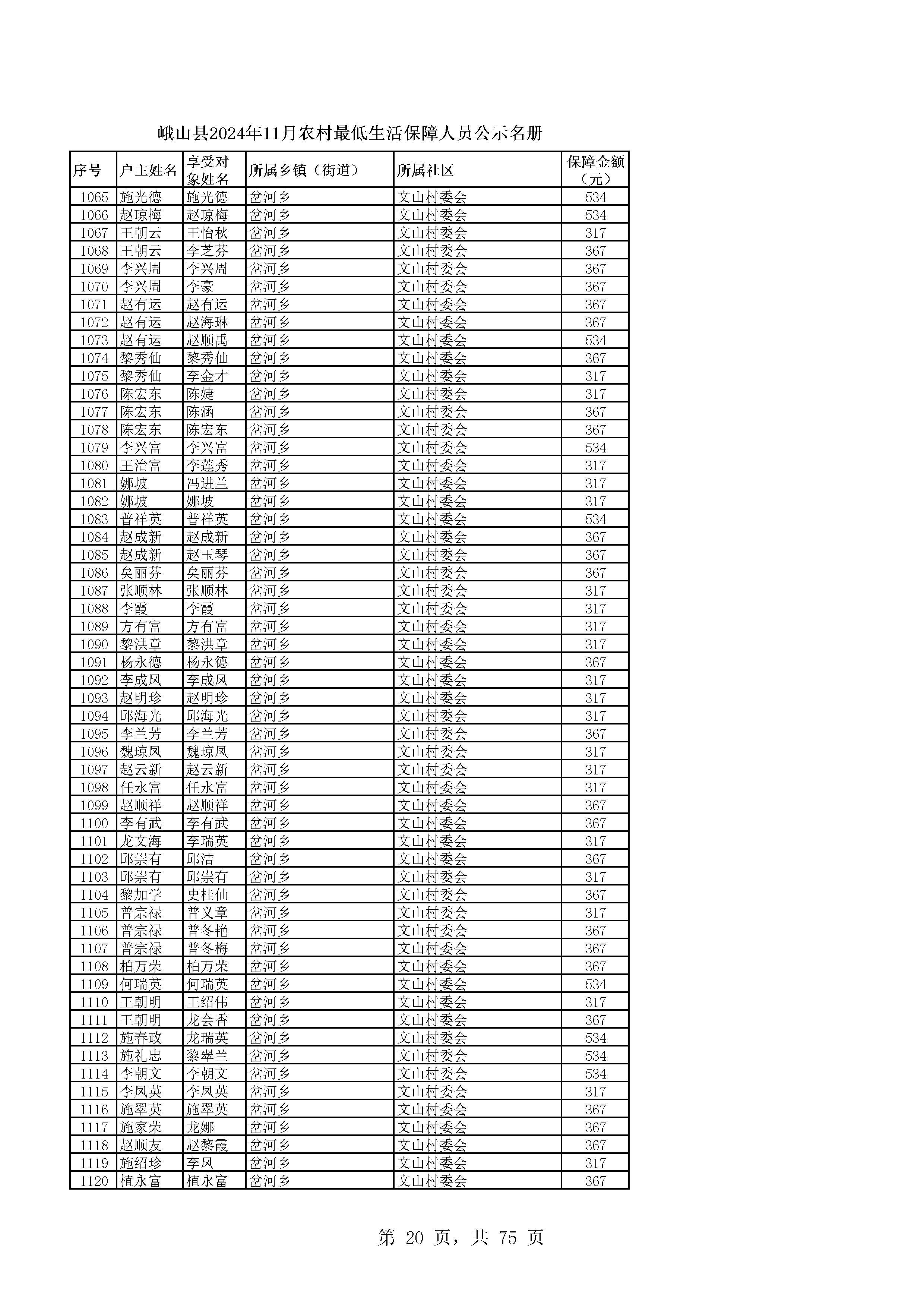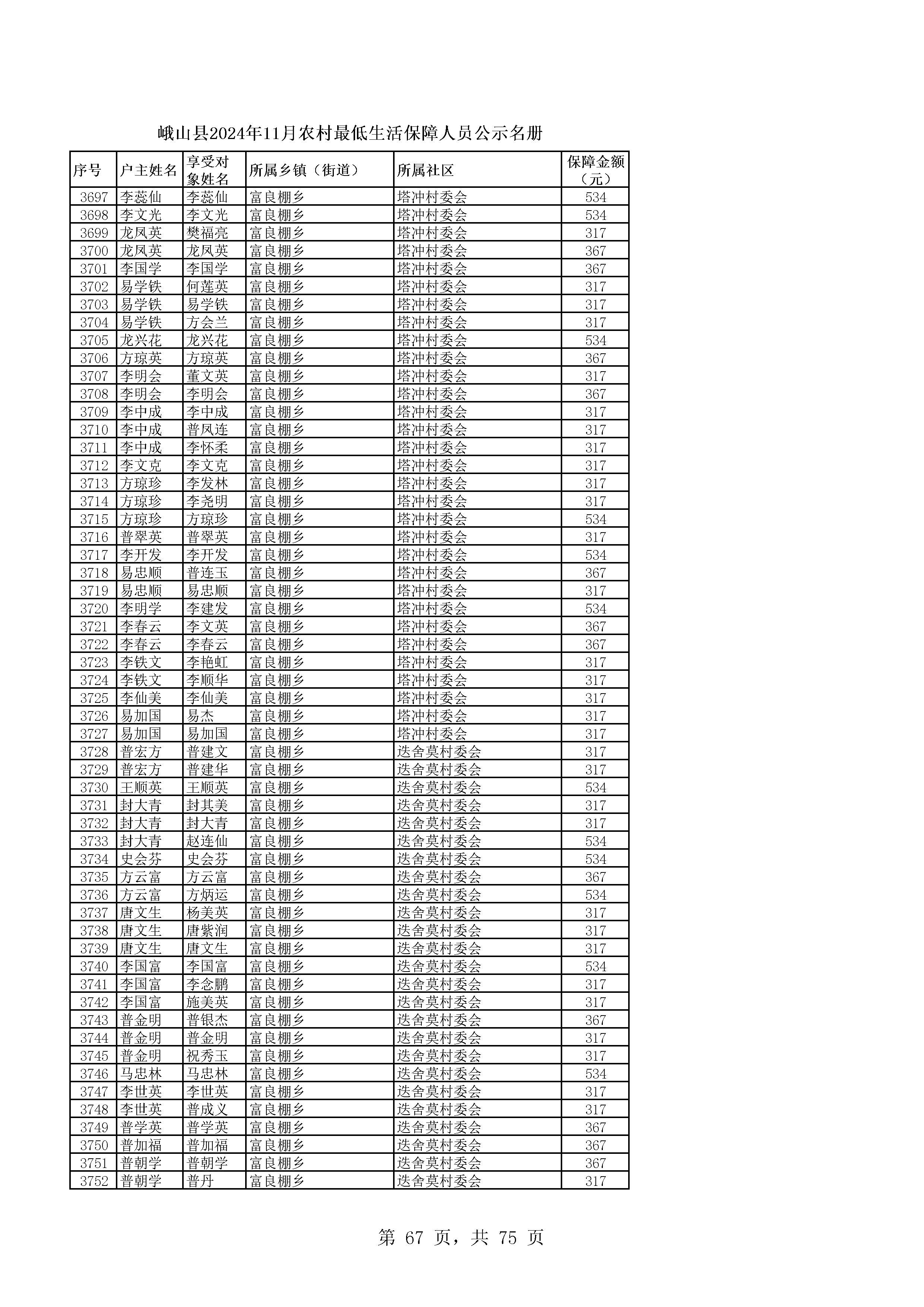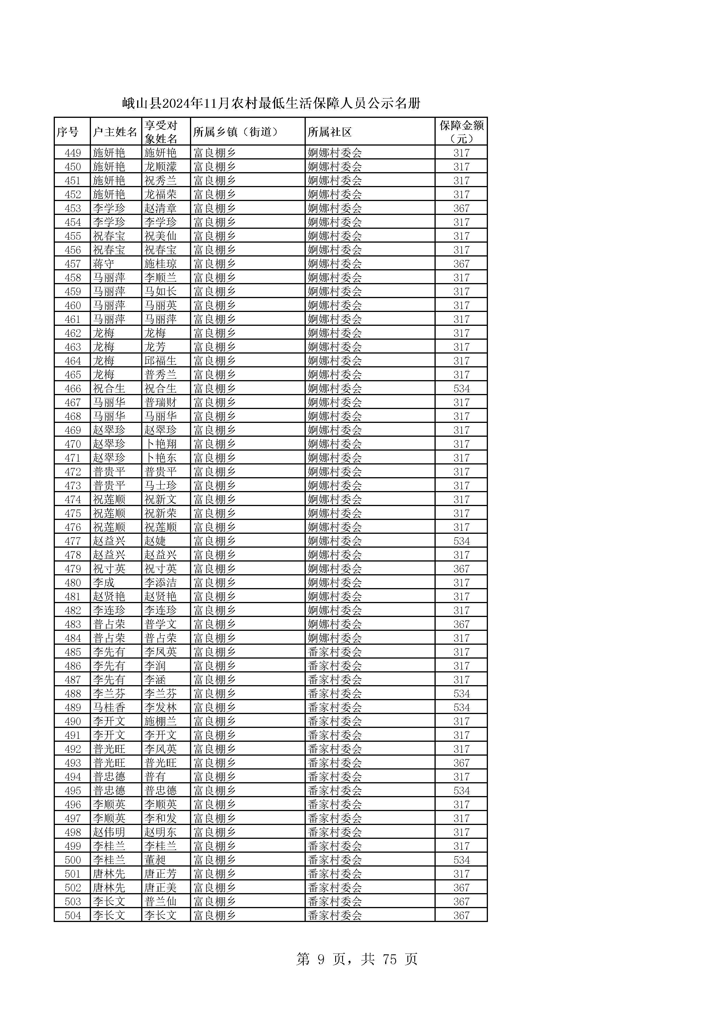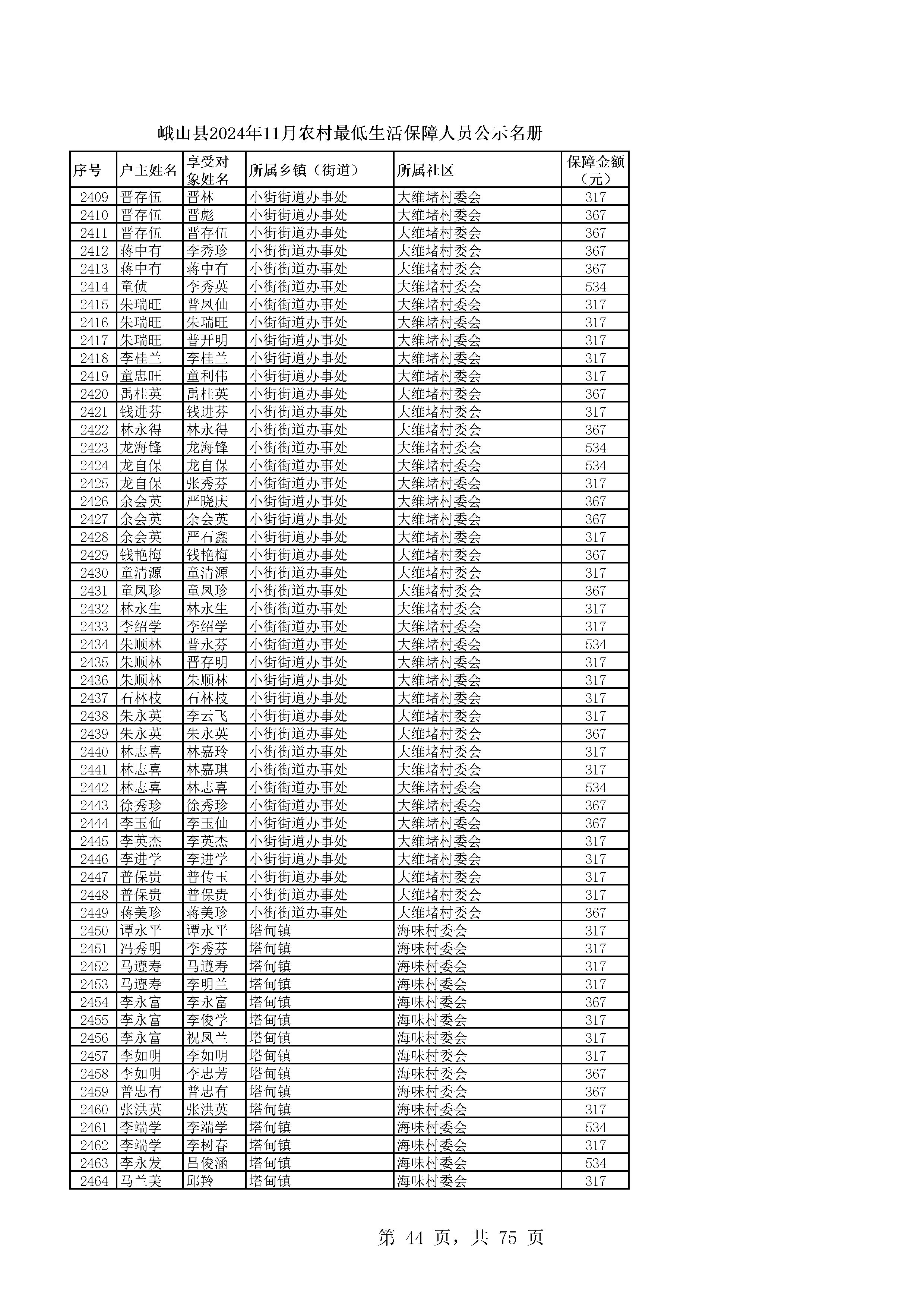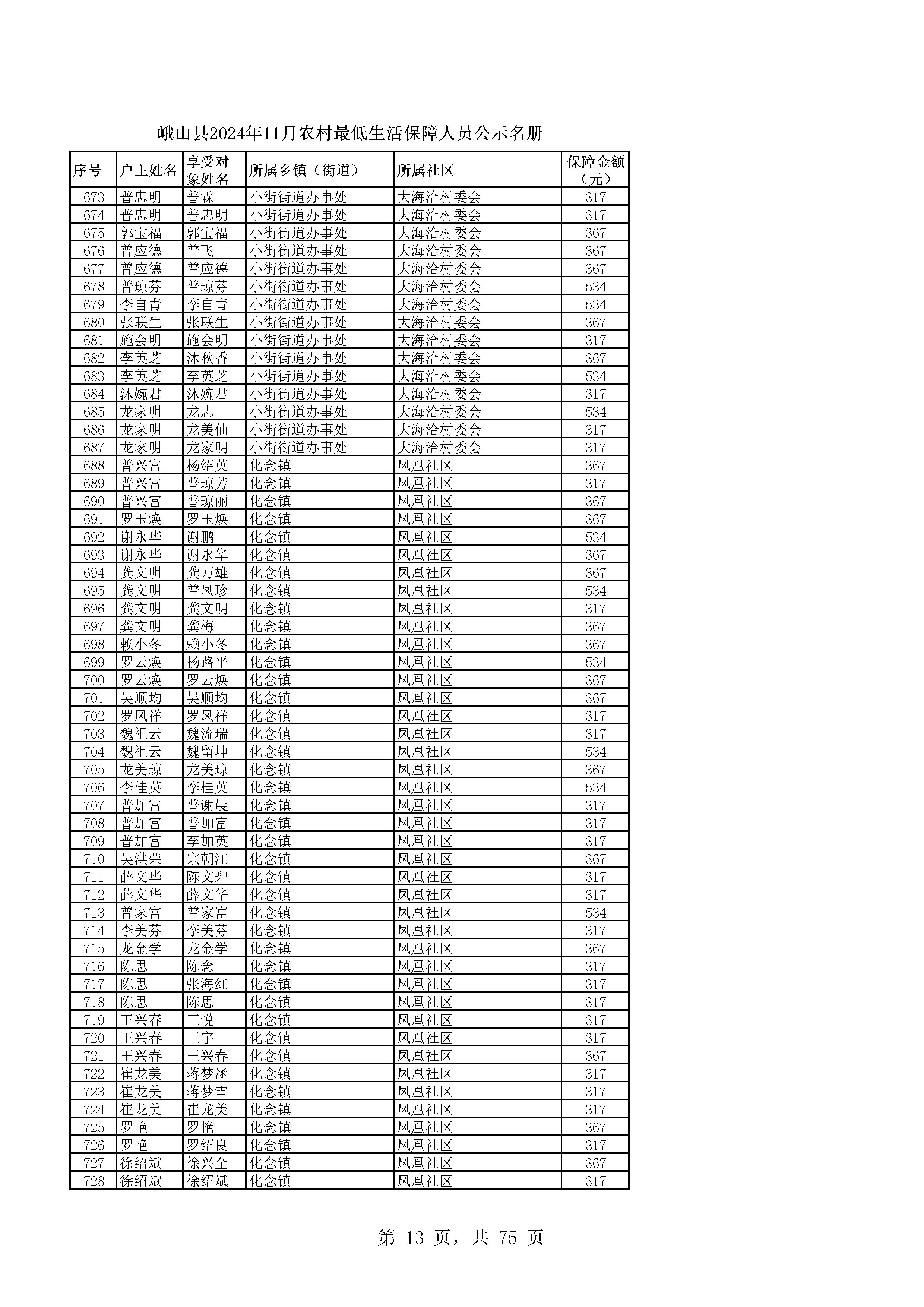 峨山县2024年11月农村最低生活保障人员公示名册