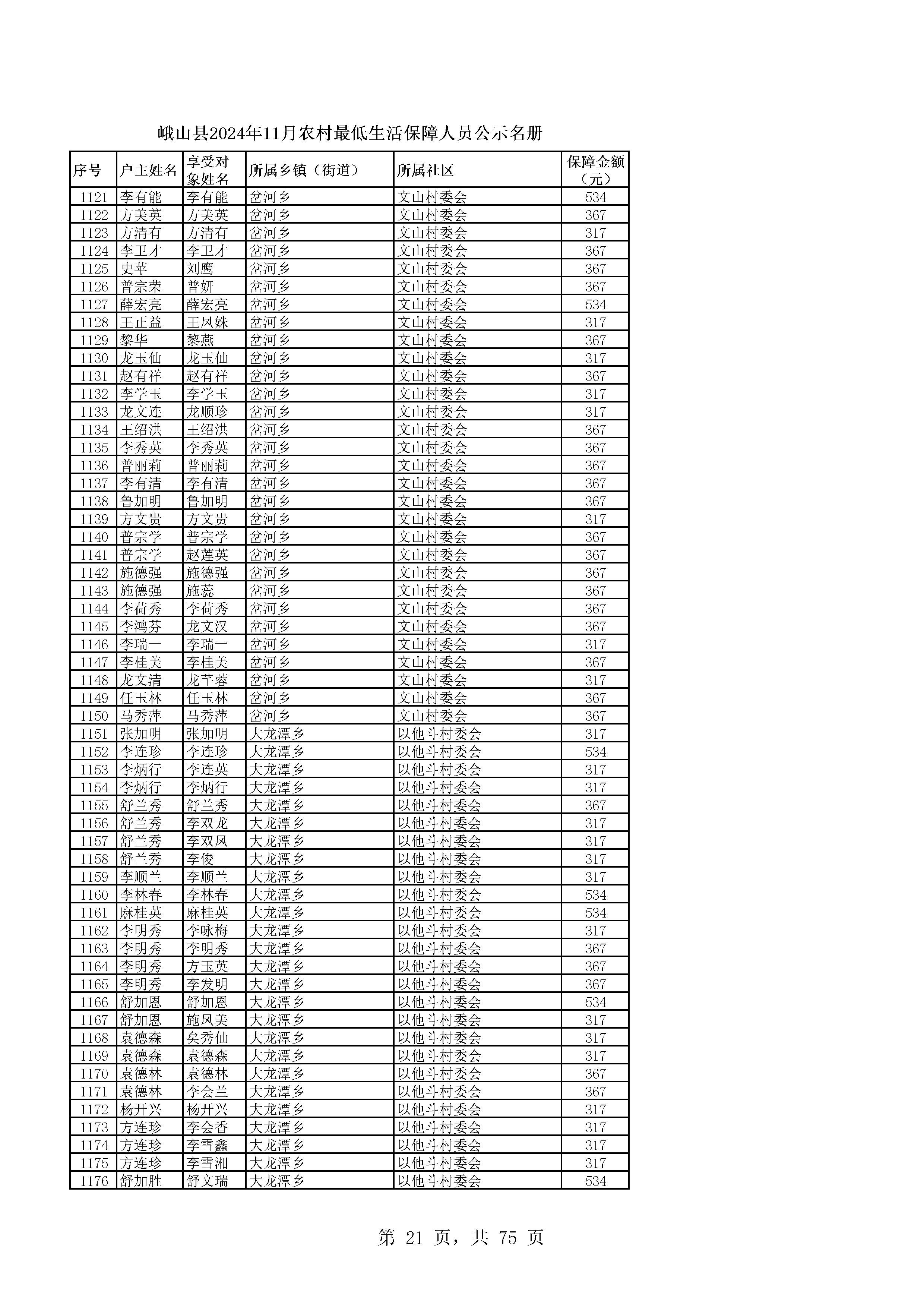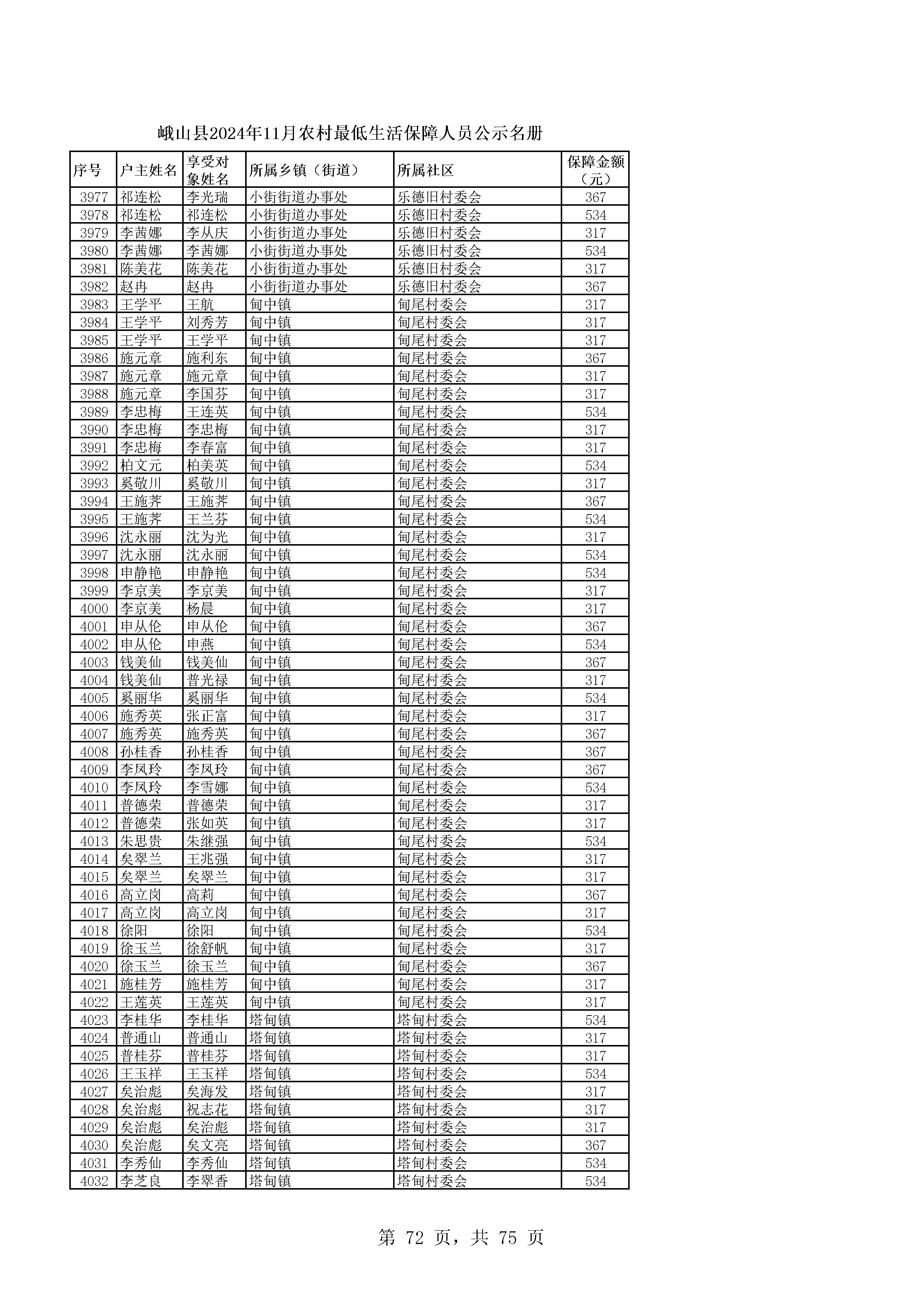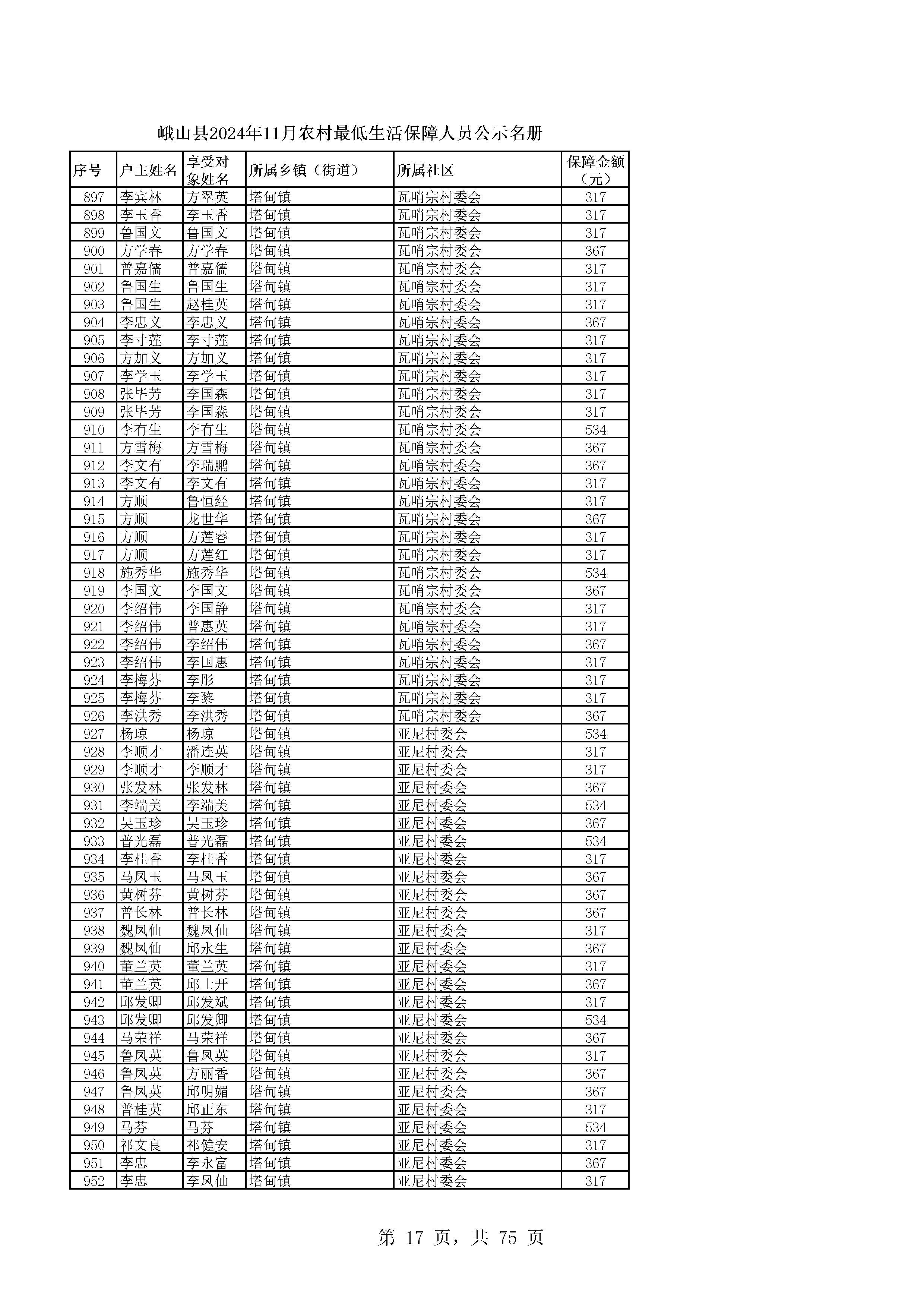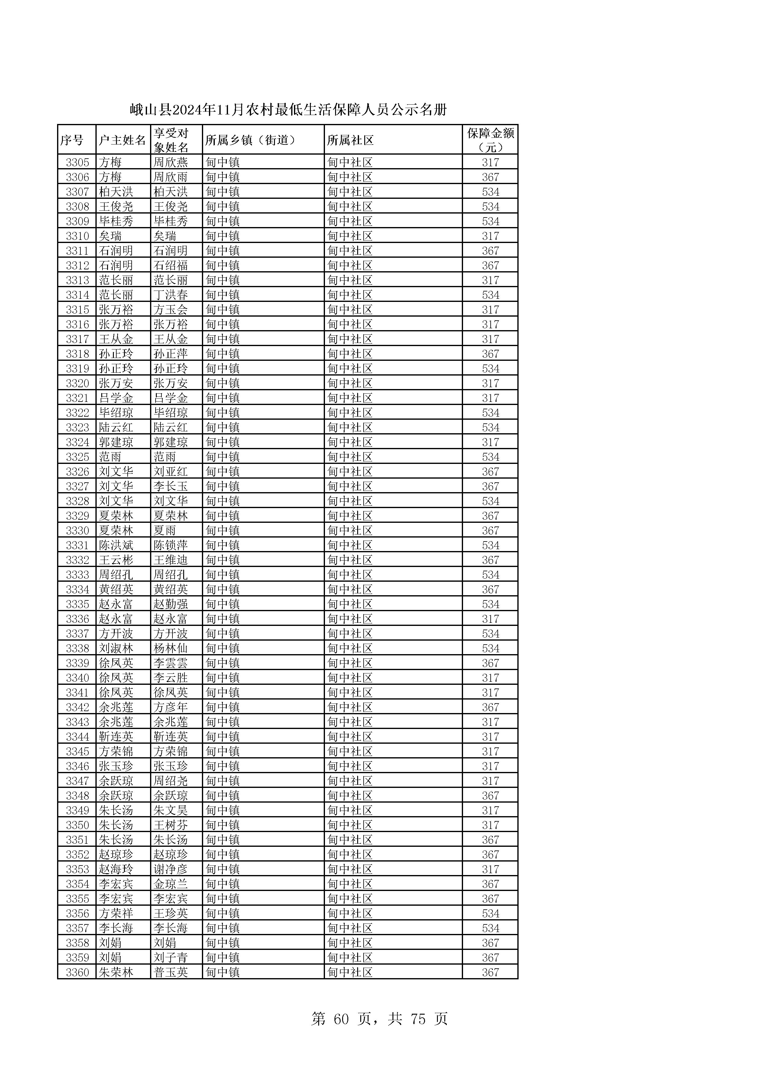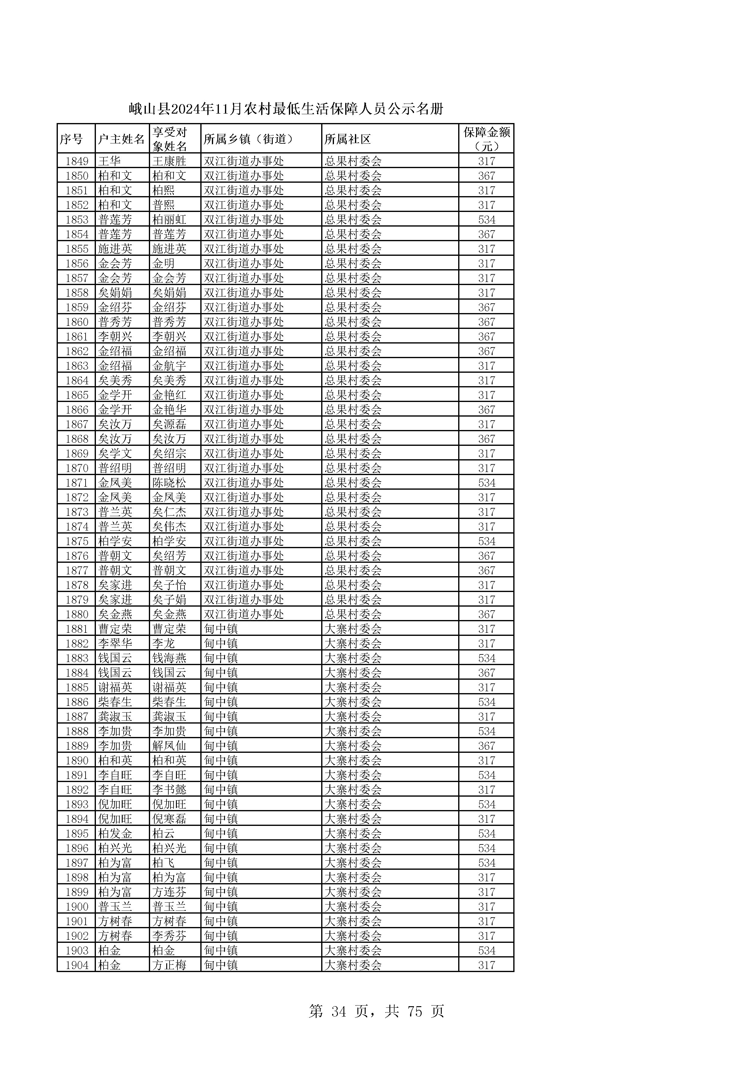 峨山县2024年11月农村最低生活保障人员公示名册
