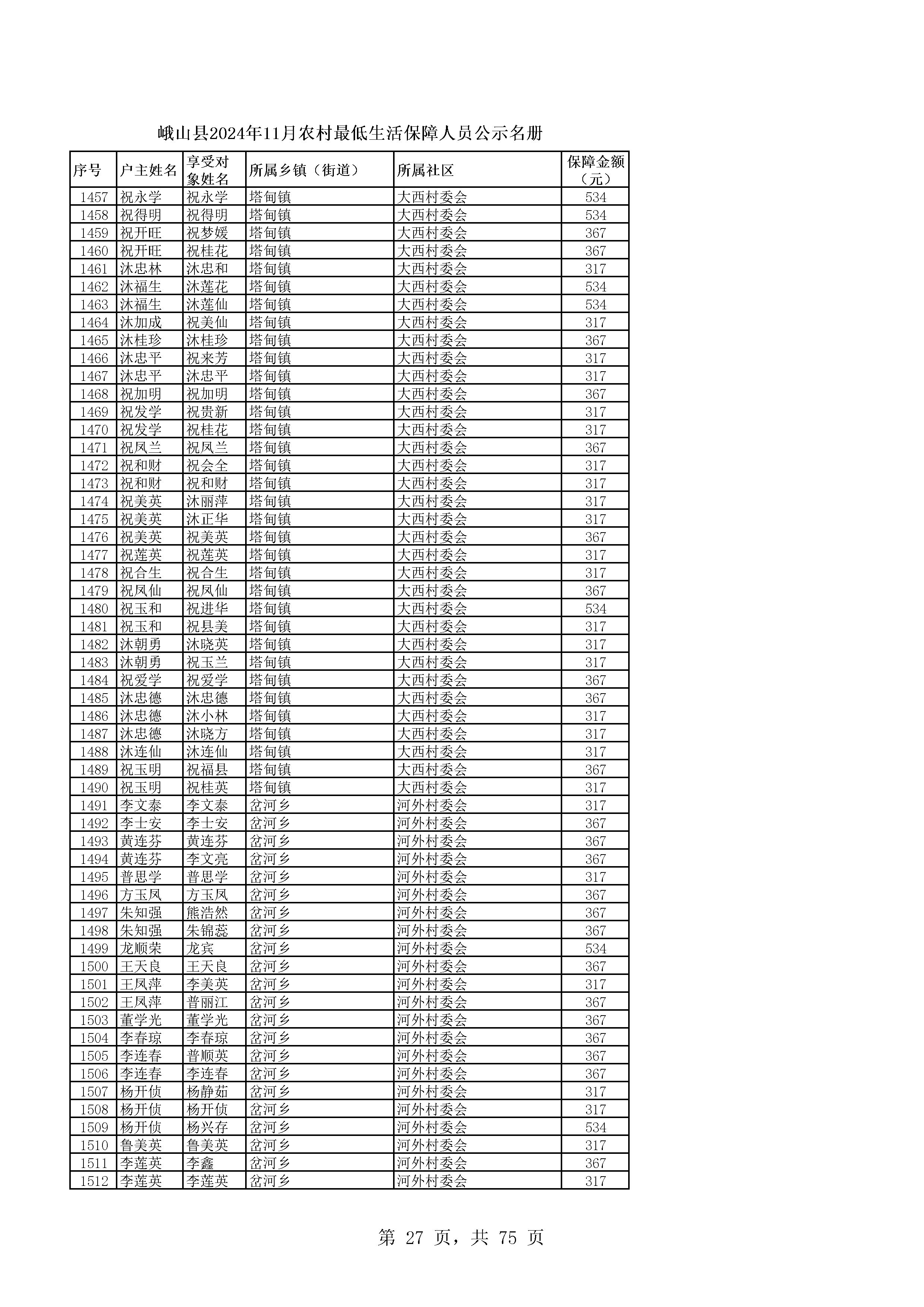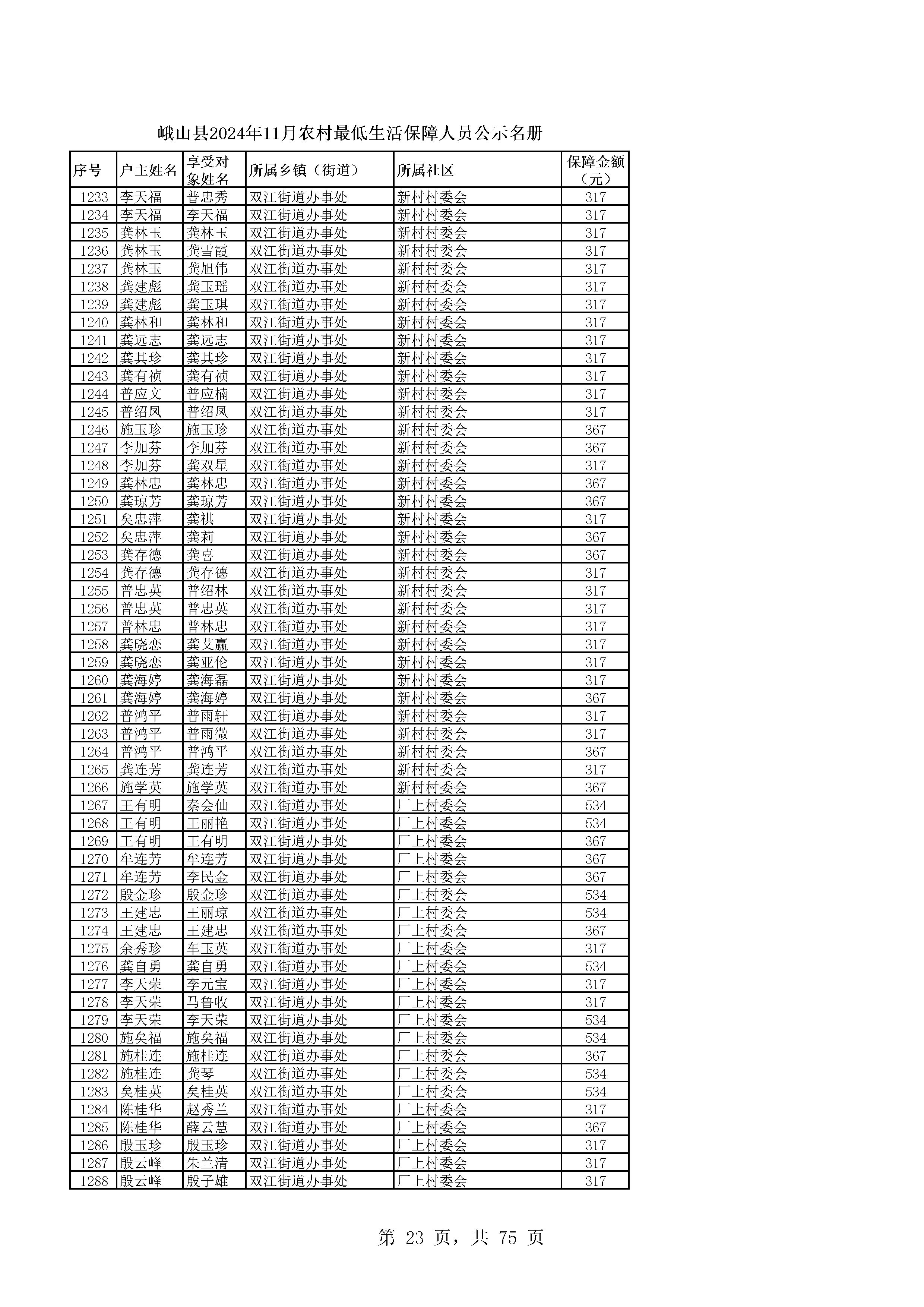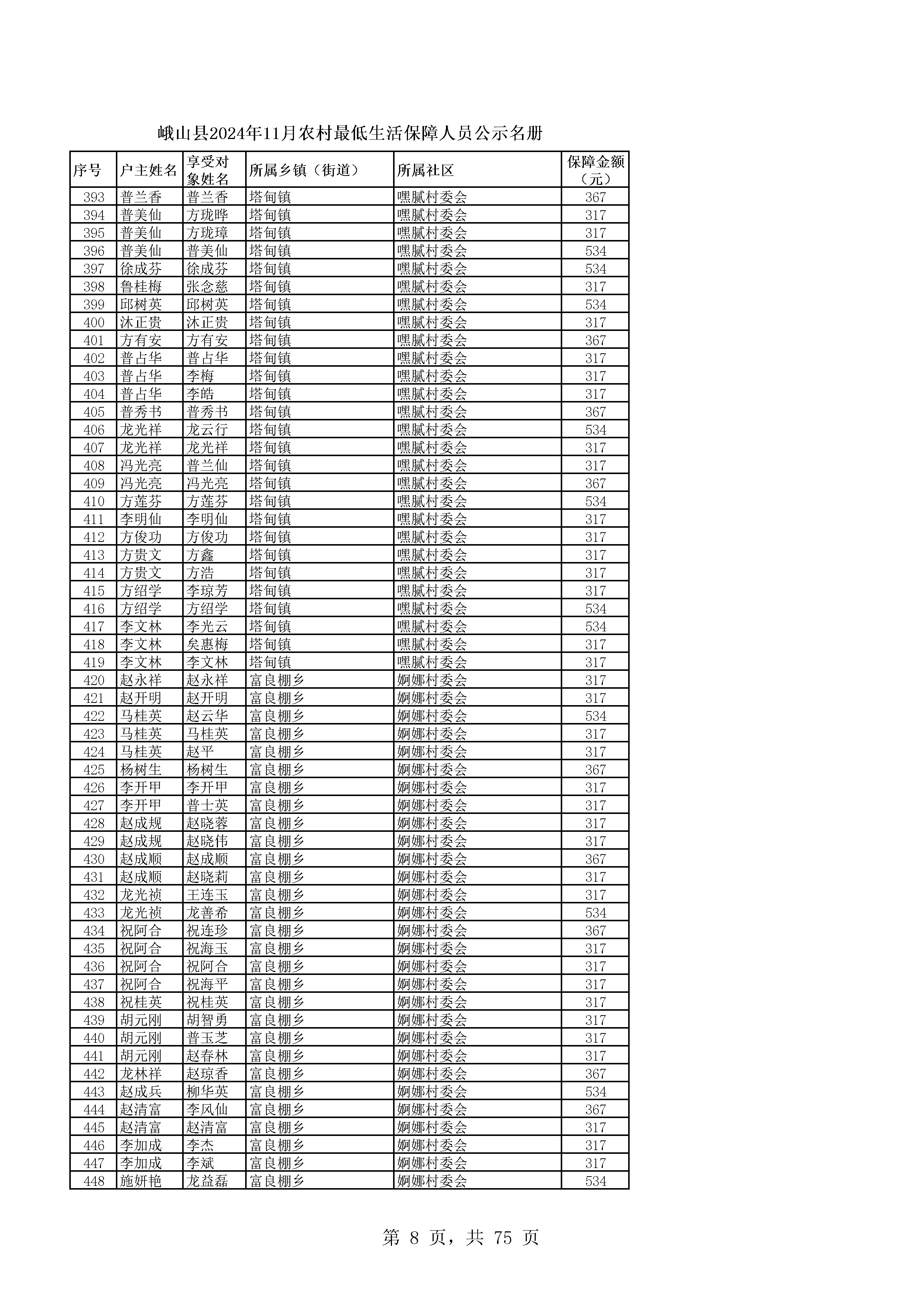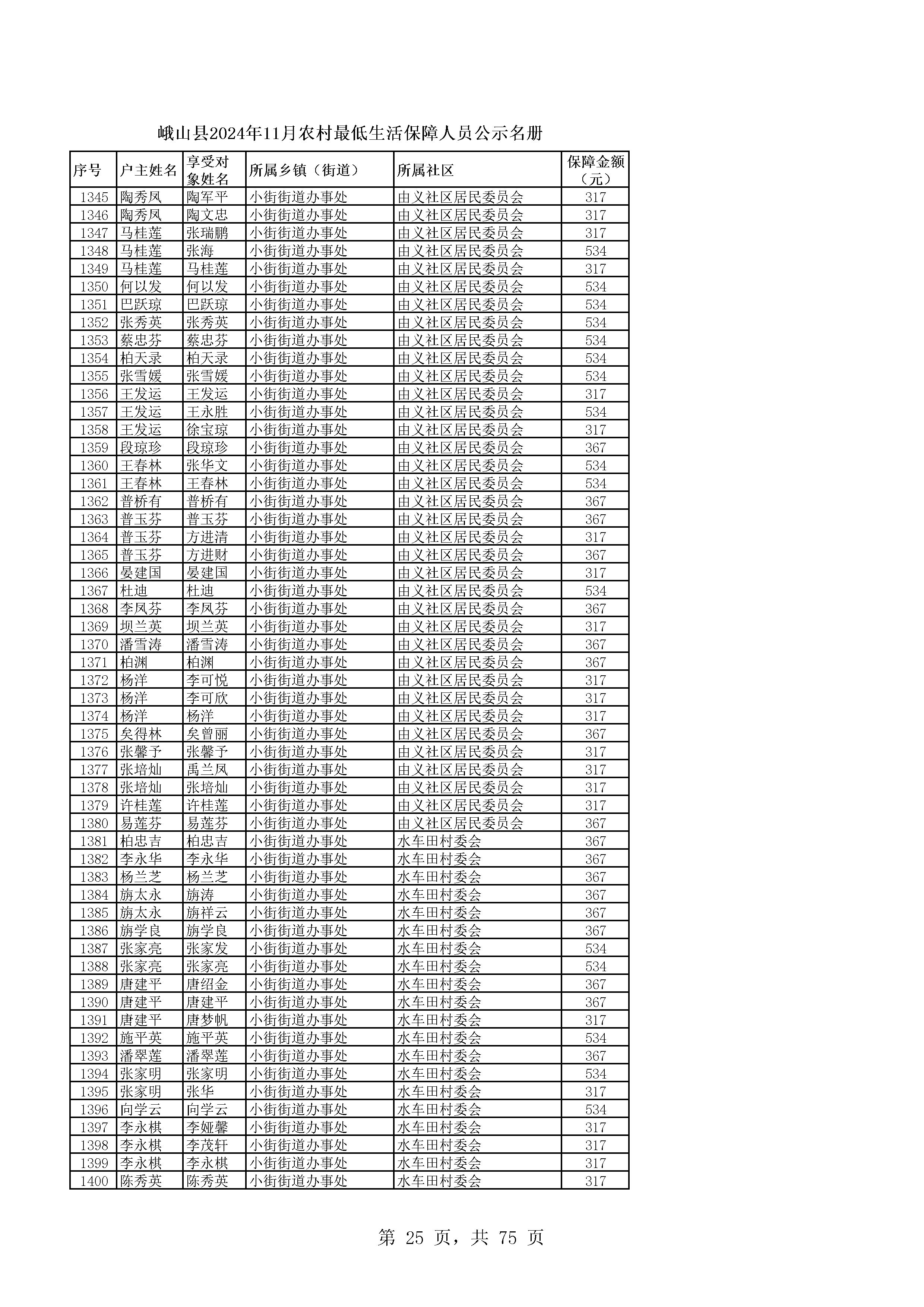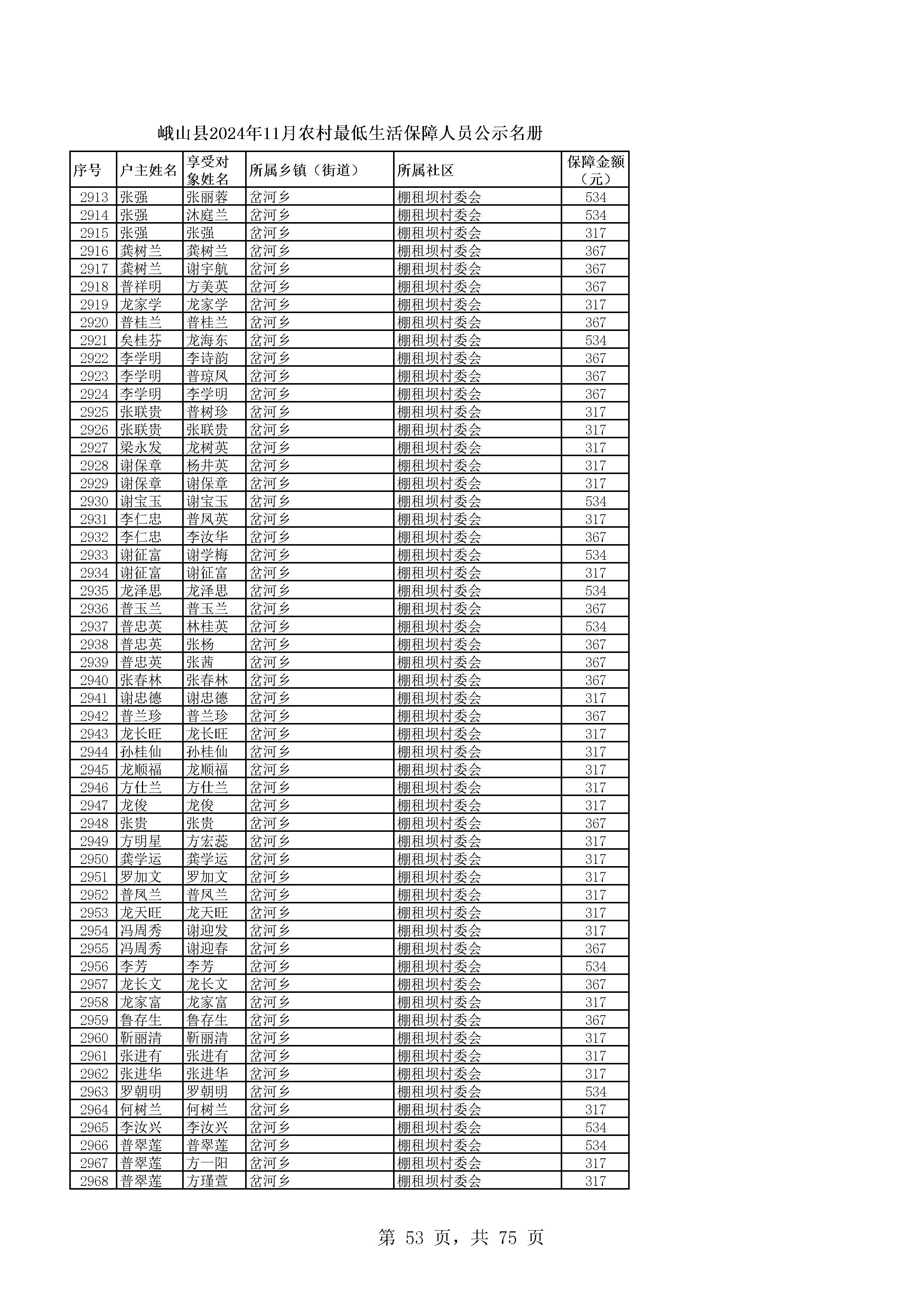 峨山县2024年11月农村最低生活保障人员公示名册