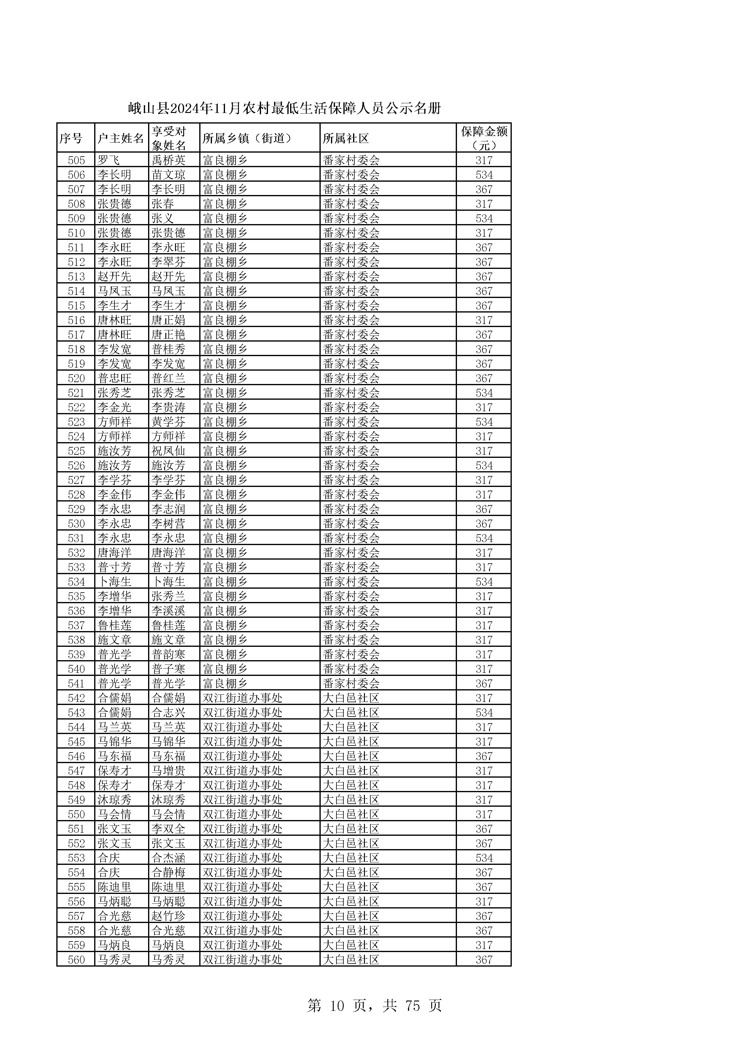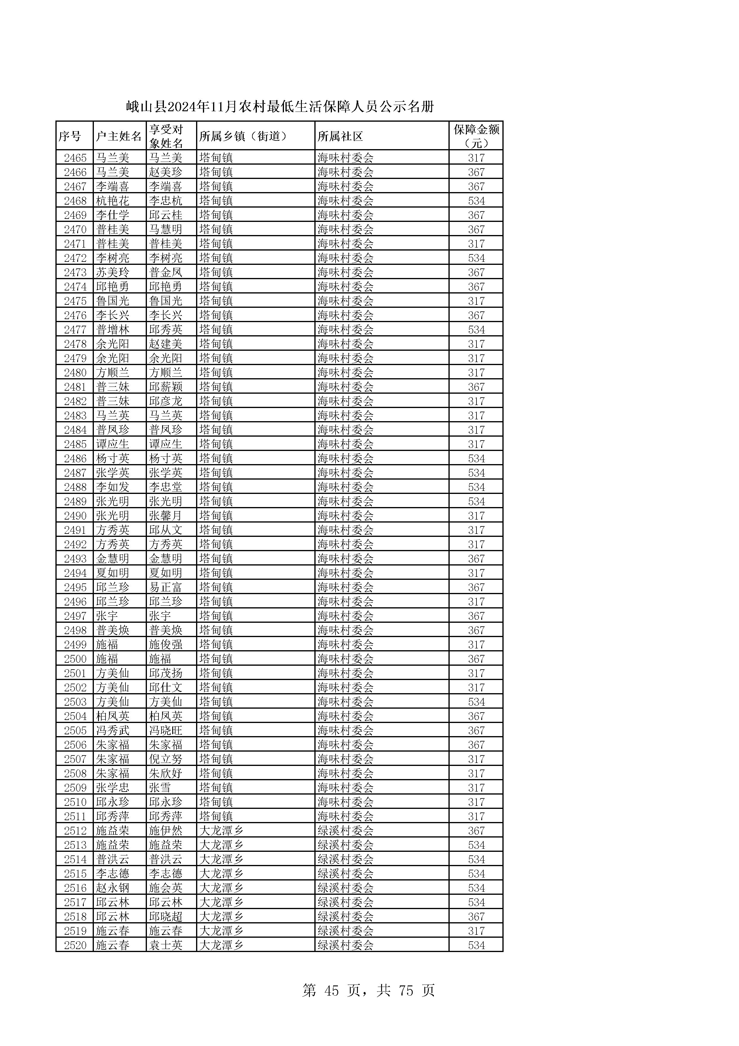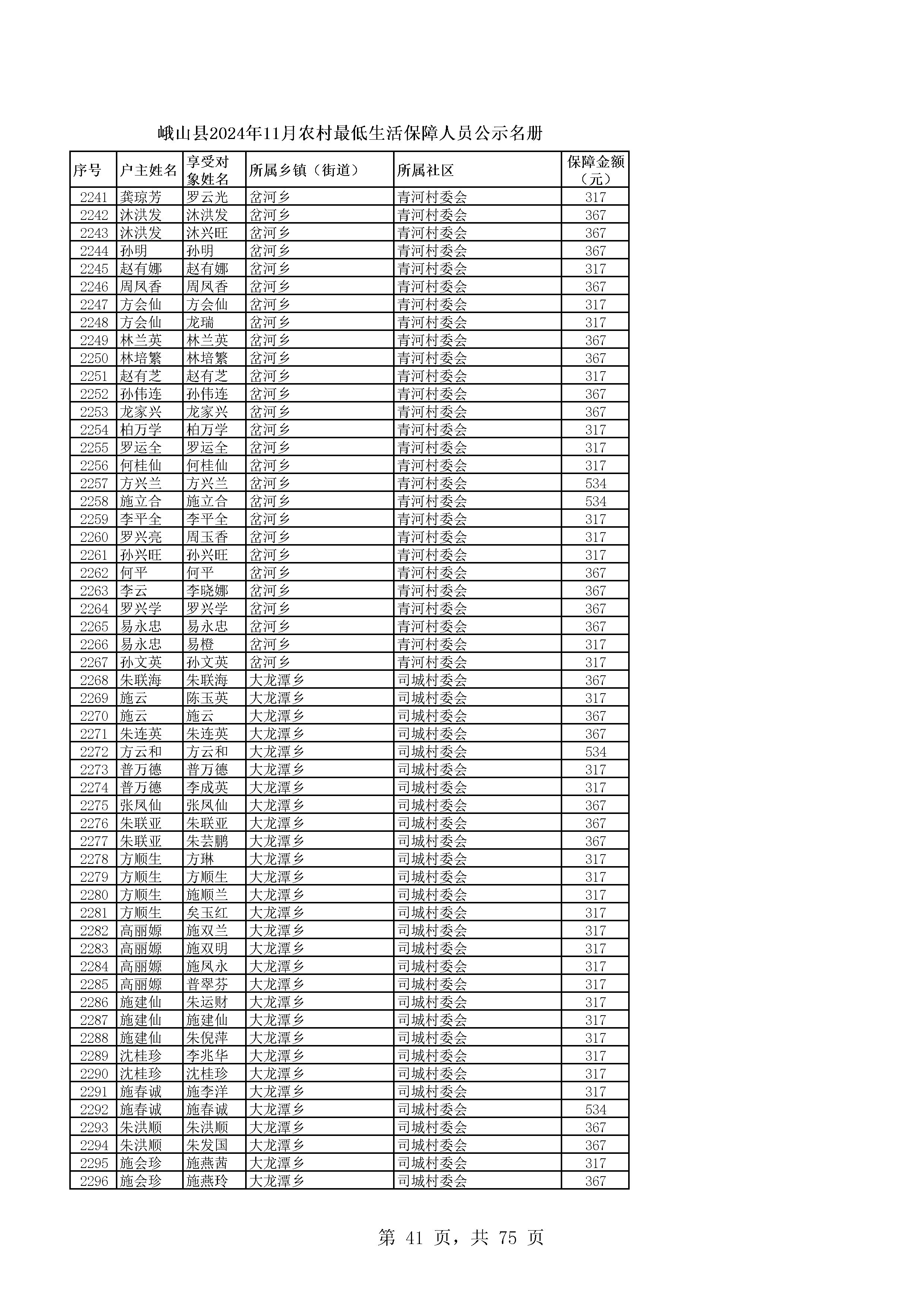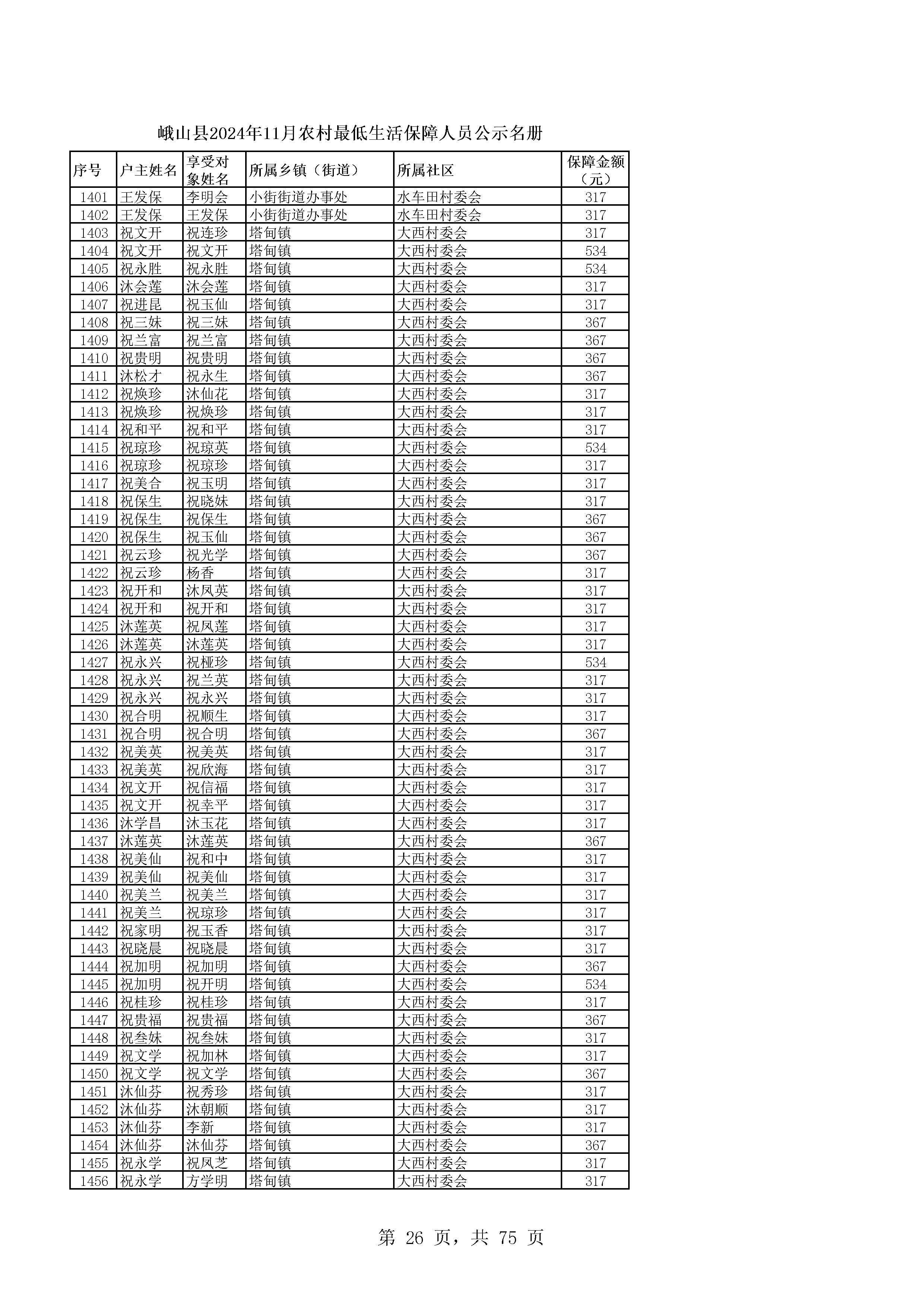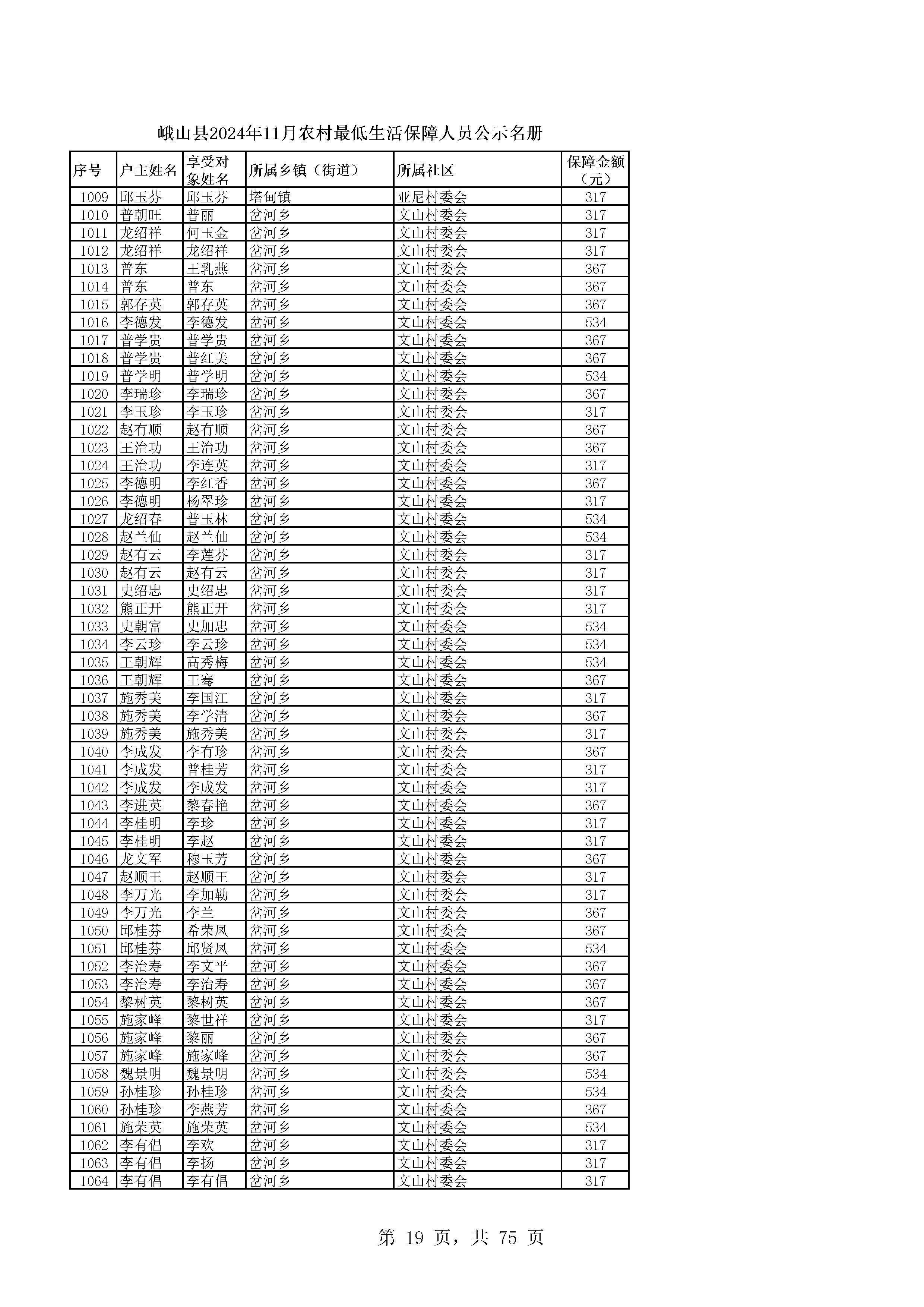 峨山县2024年11月农村最低生活保障人员公示名册