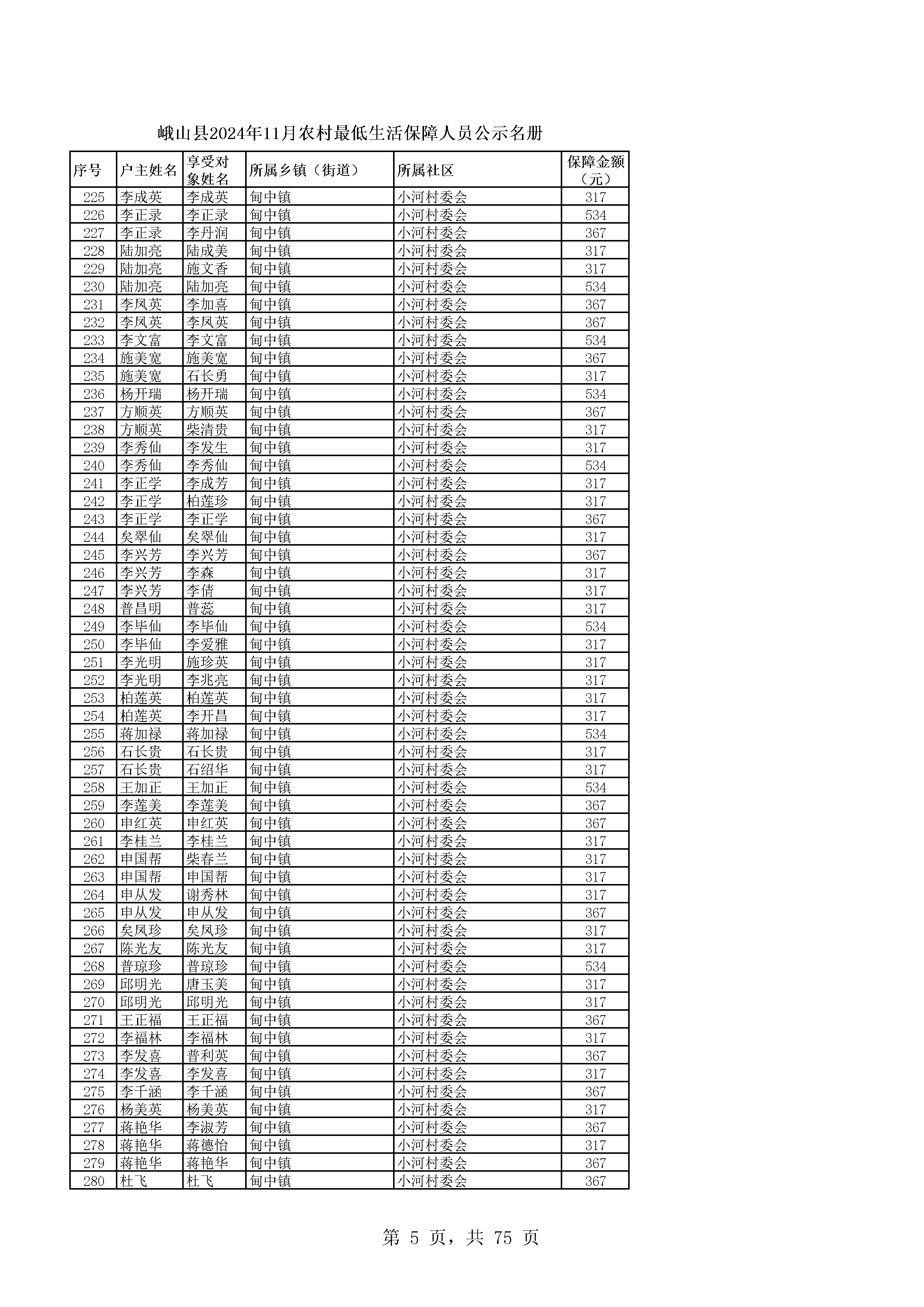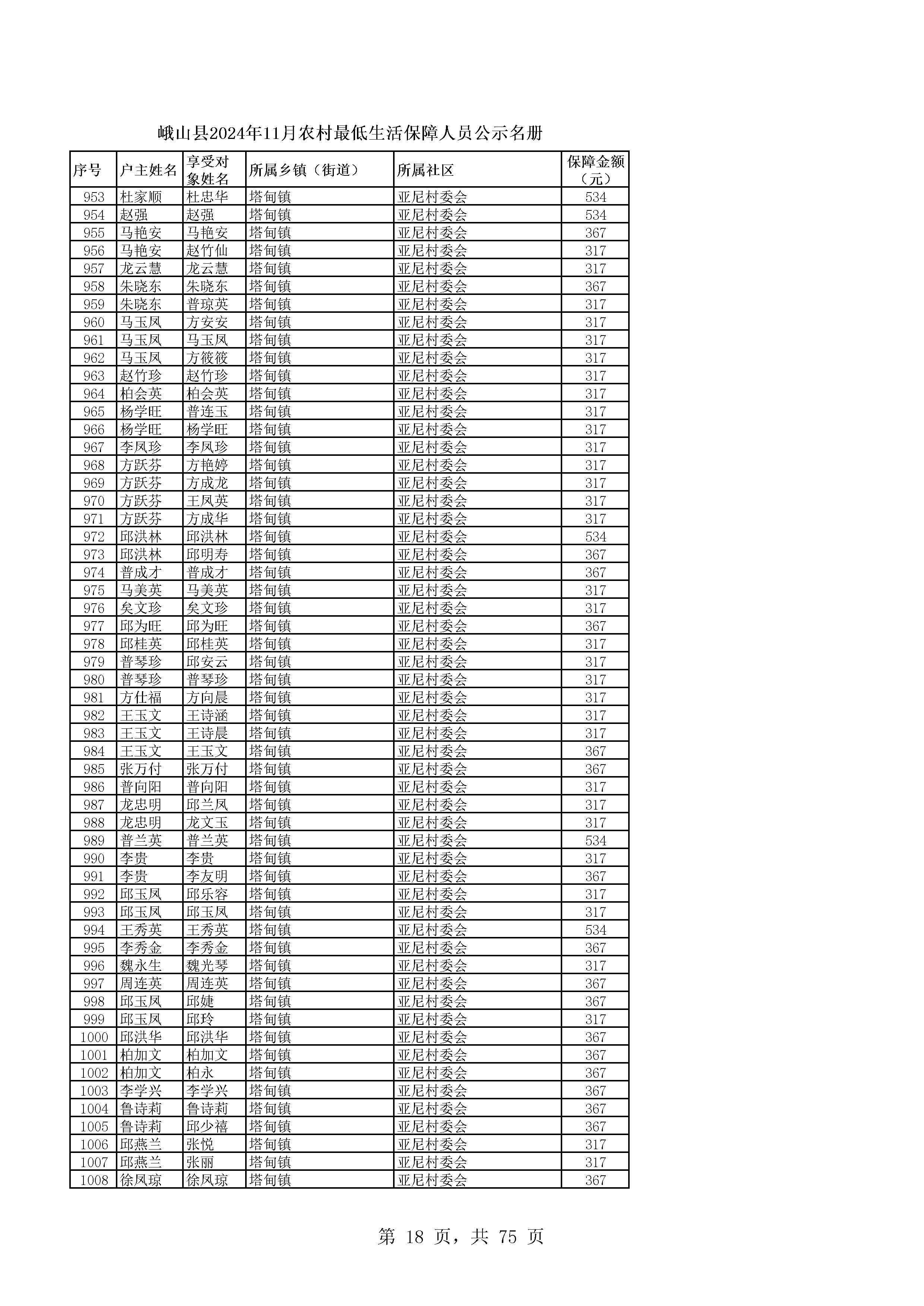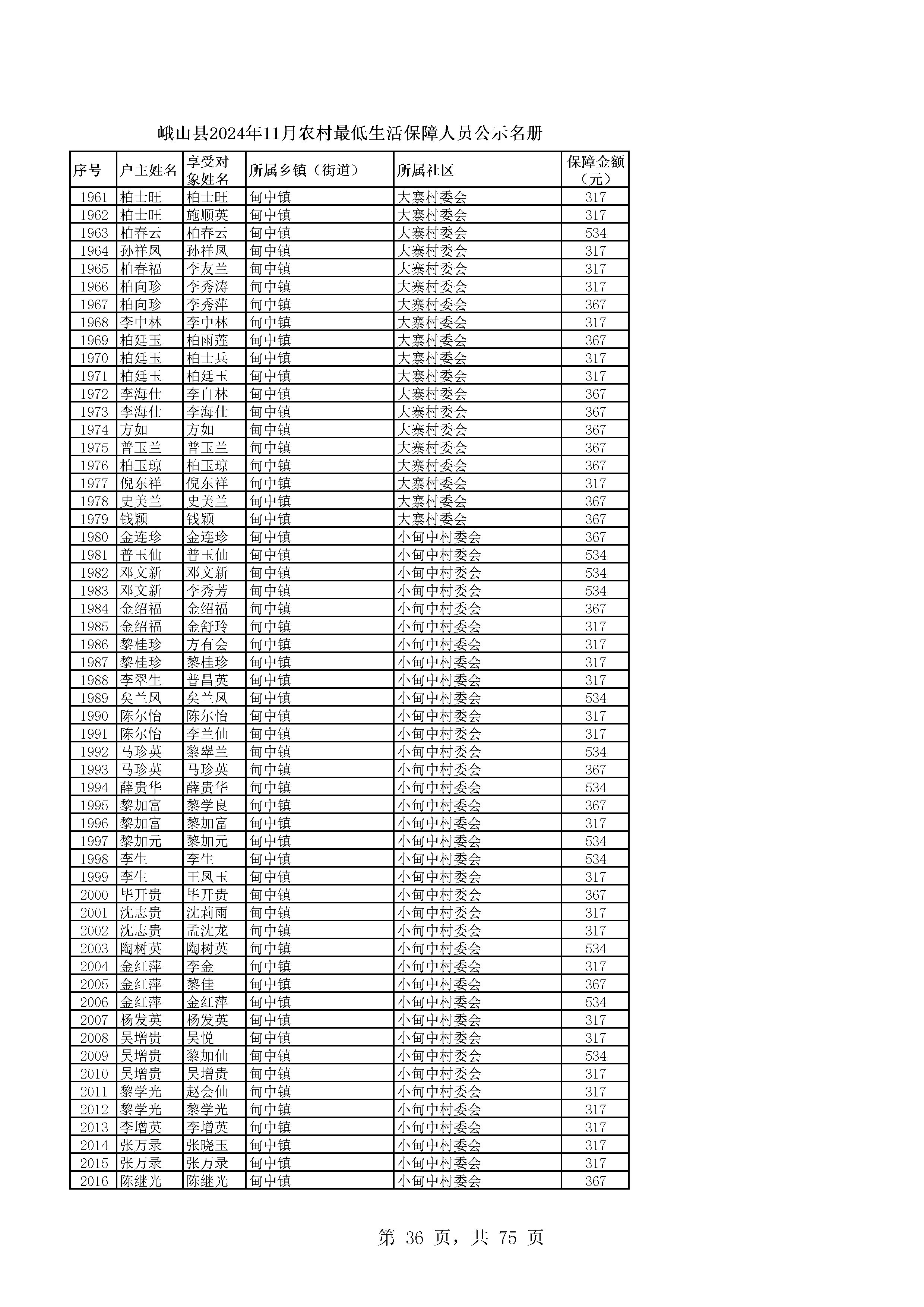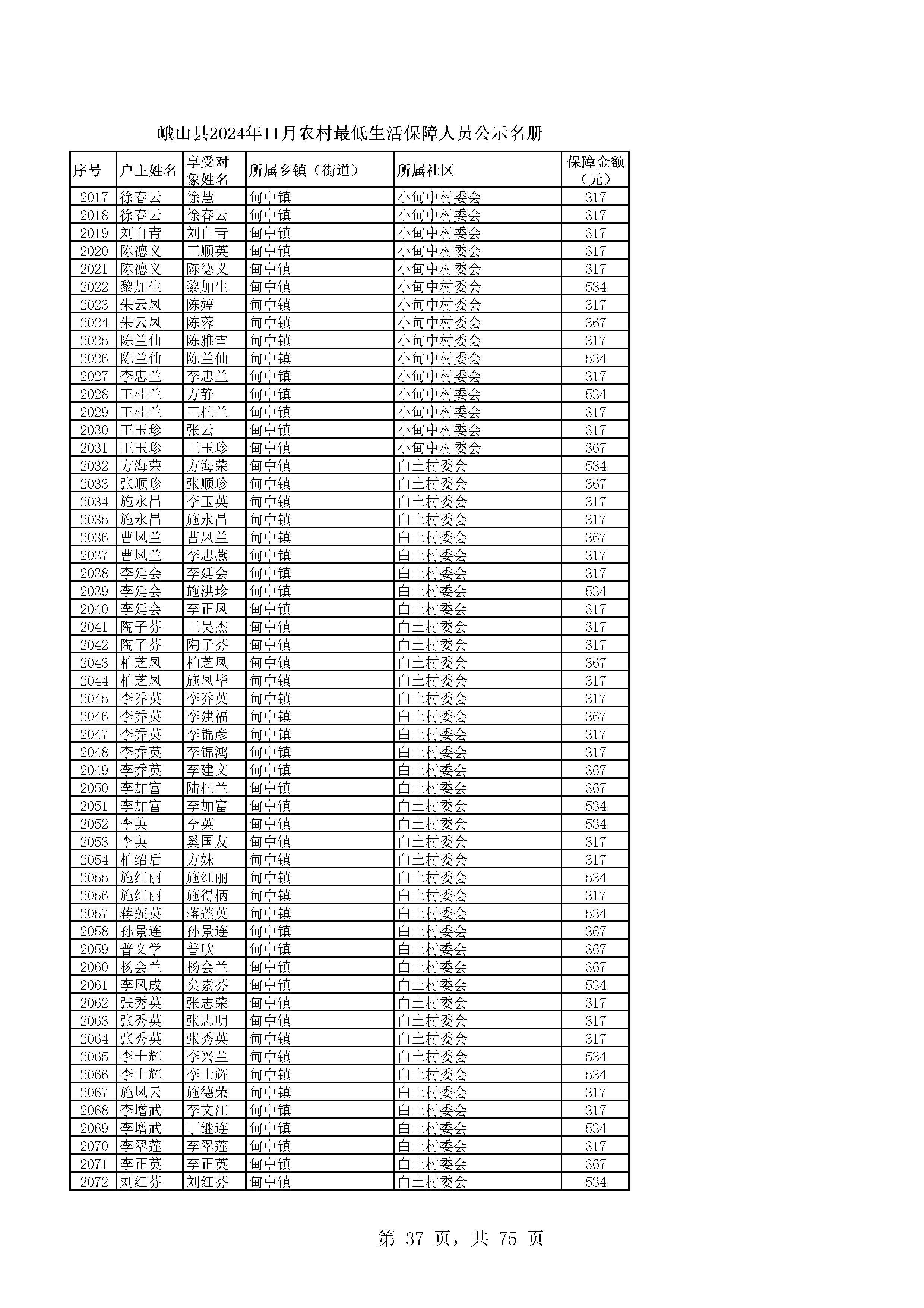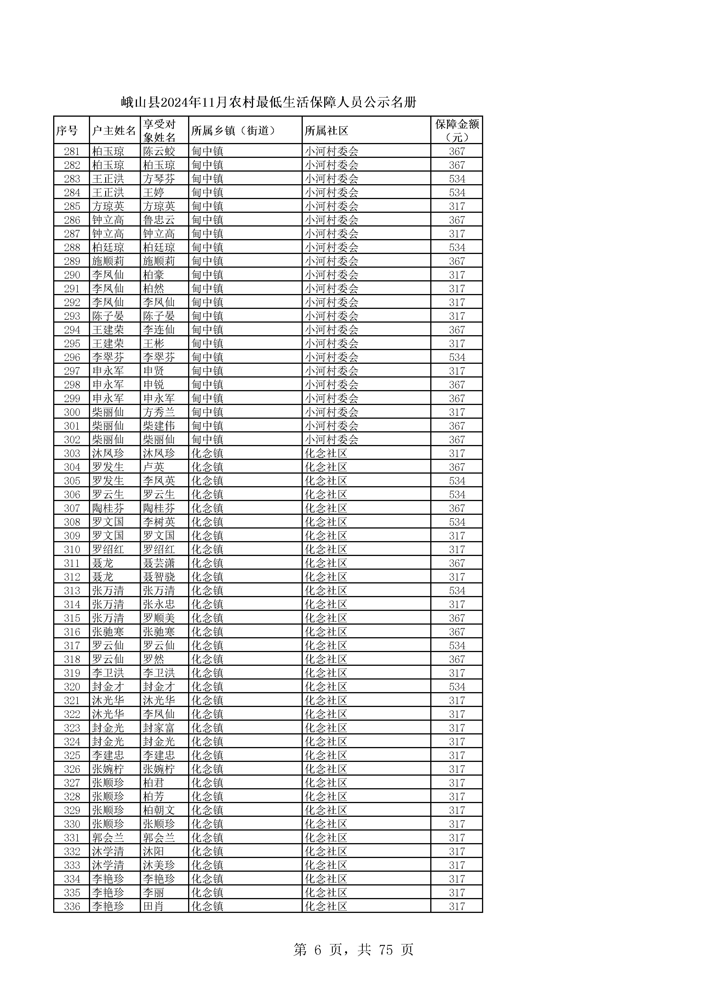 峨山县2024年11月农村最低生活保障人员公示名册