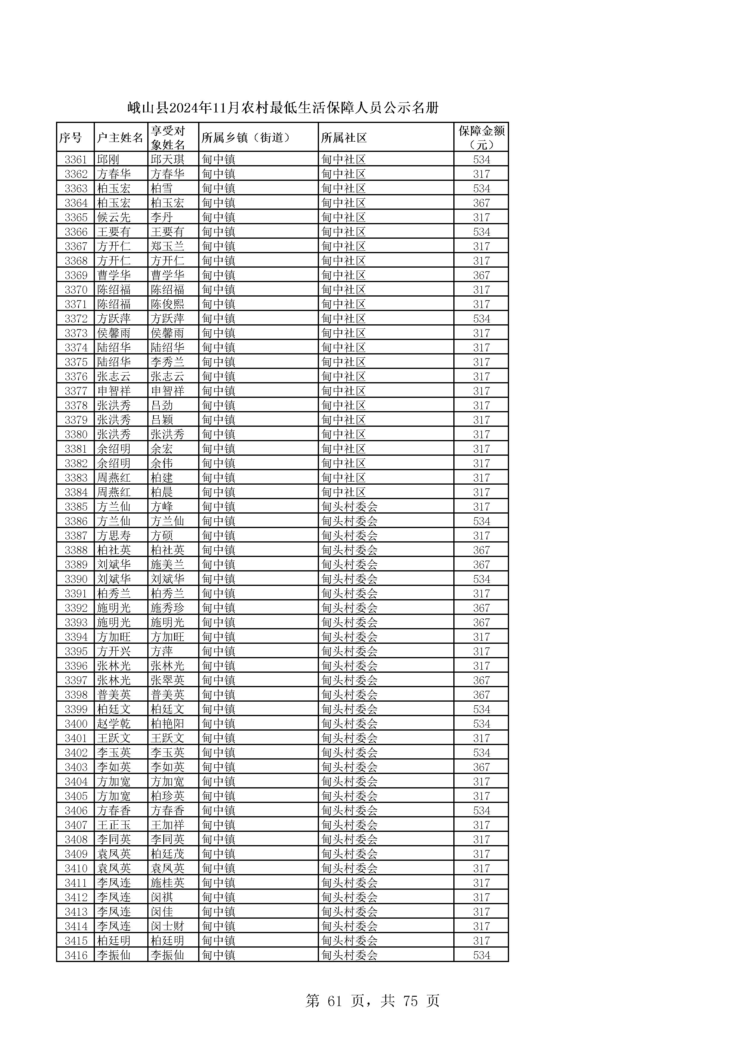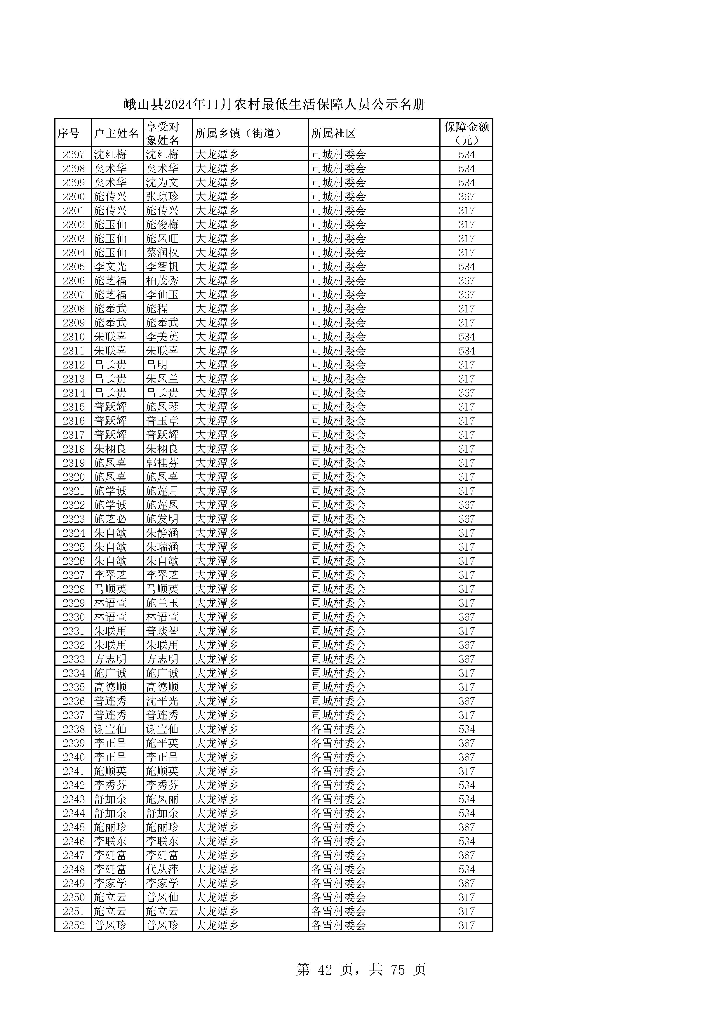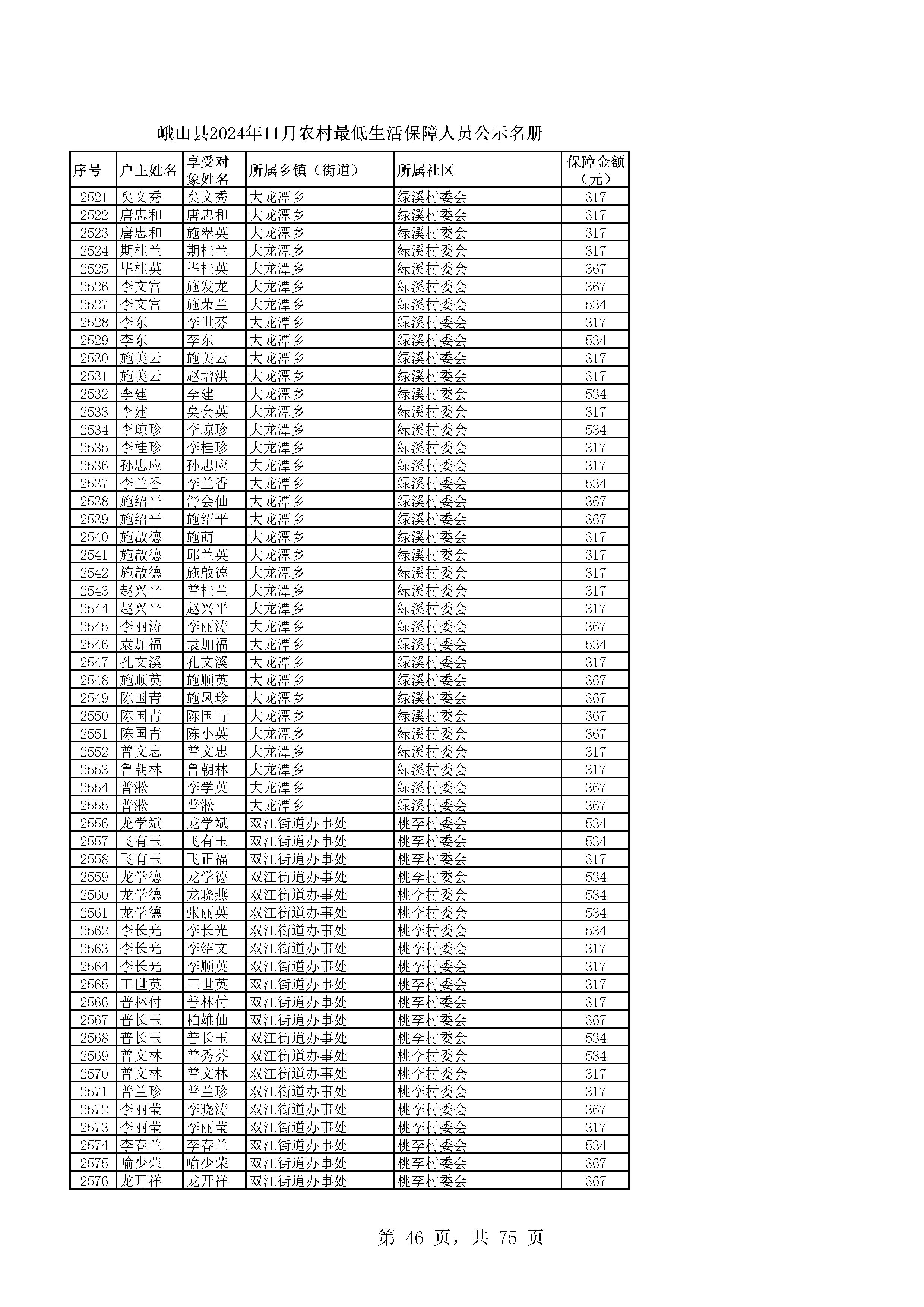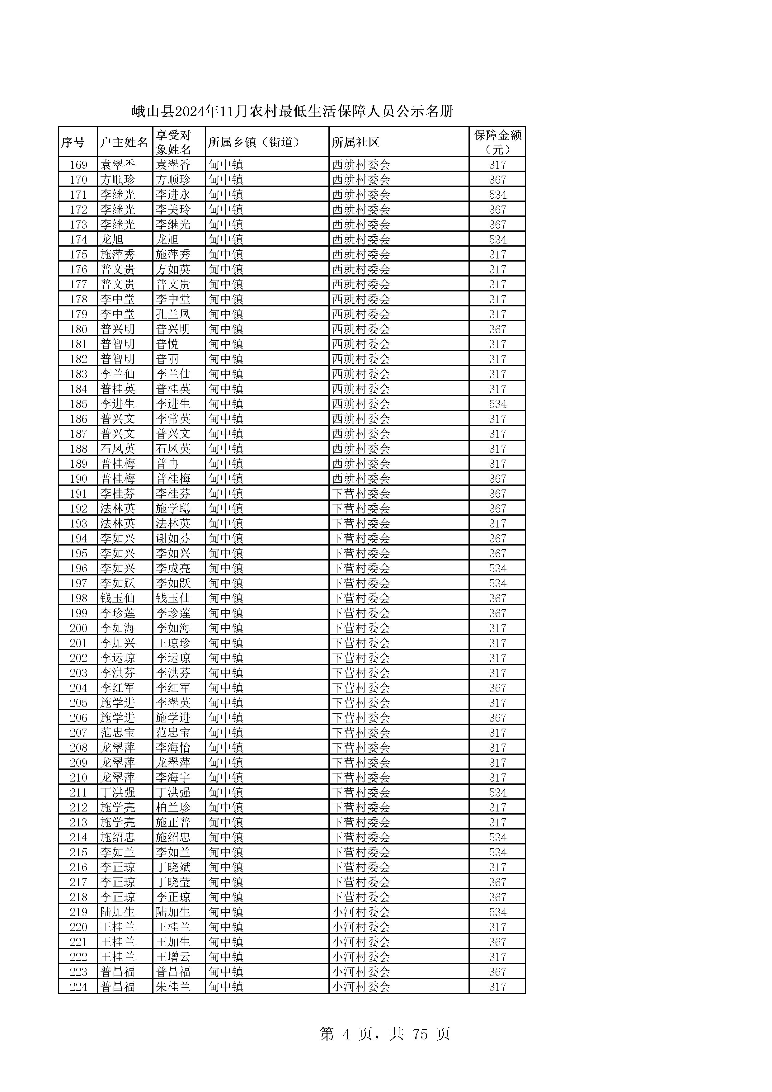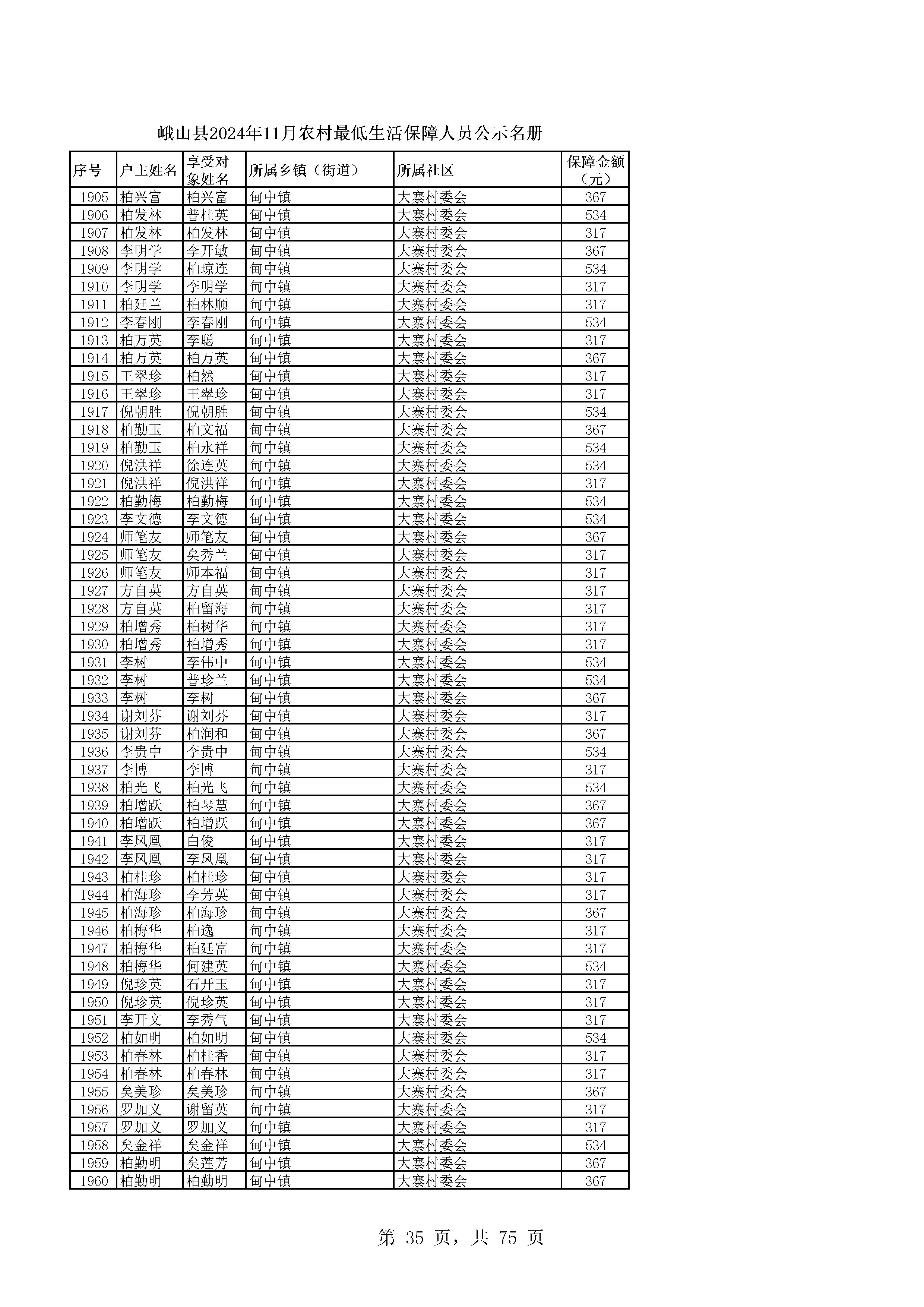 峨山县2024年11月农村最低生活保障人员公示名册