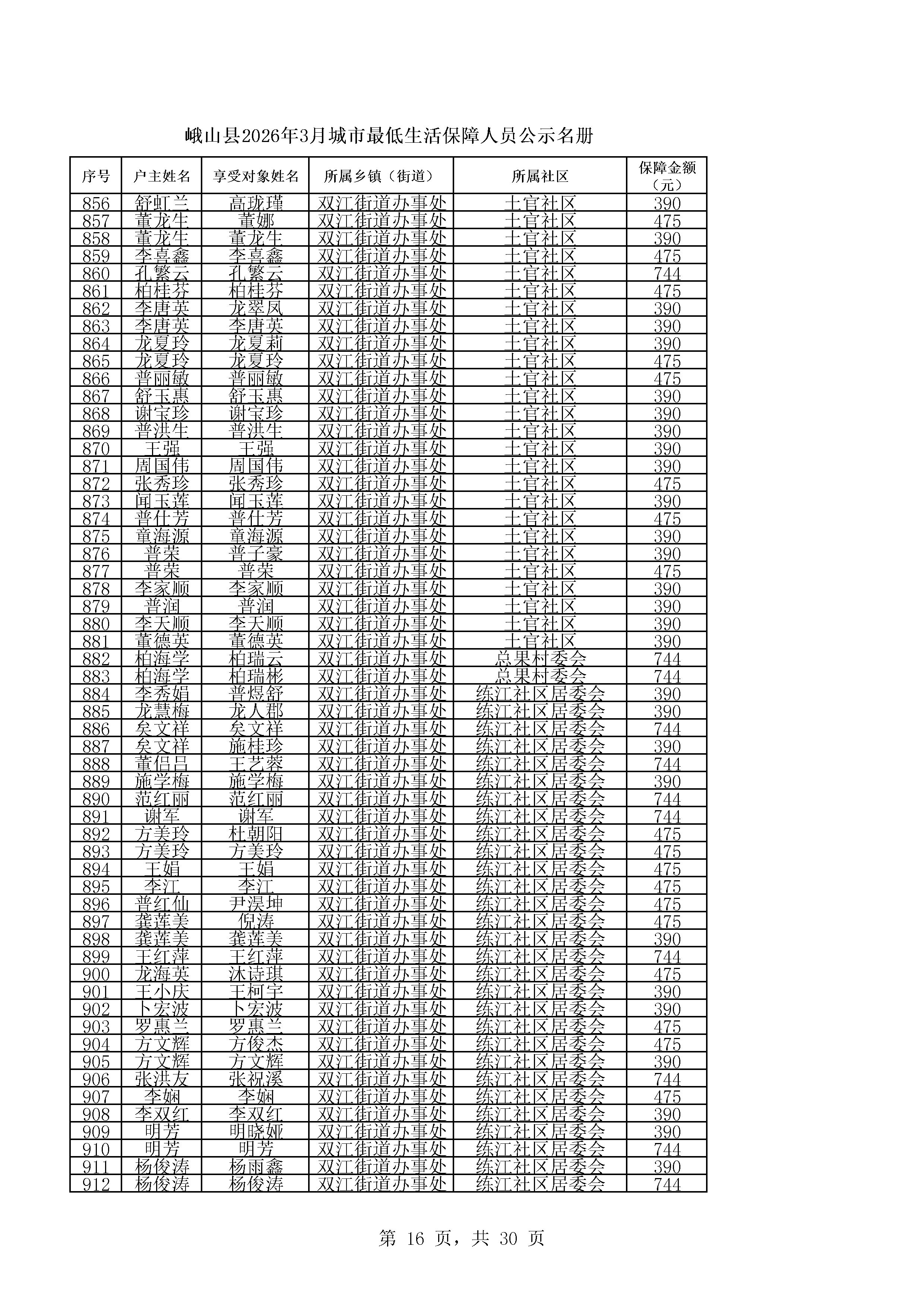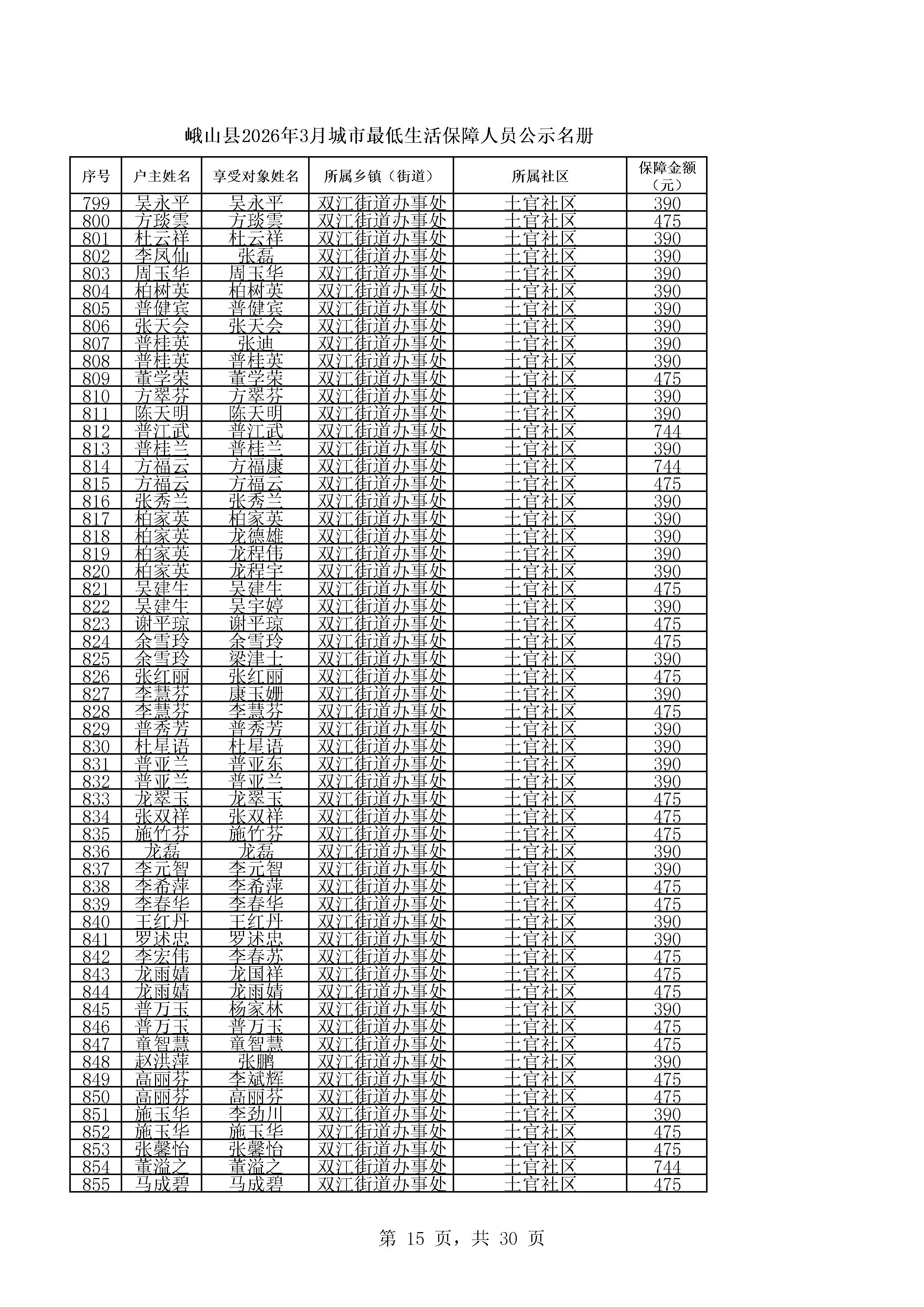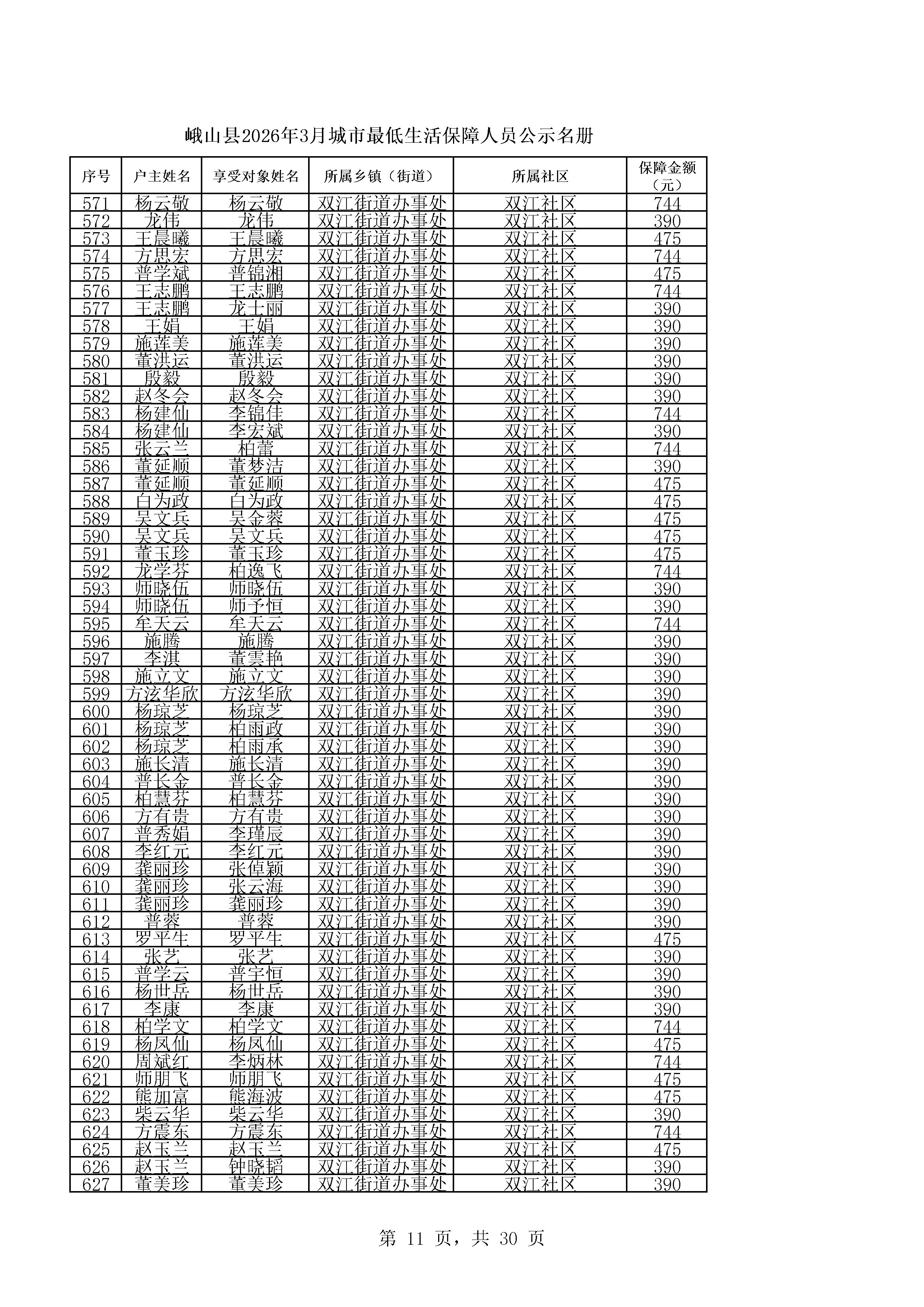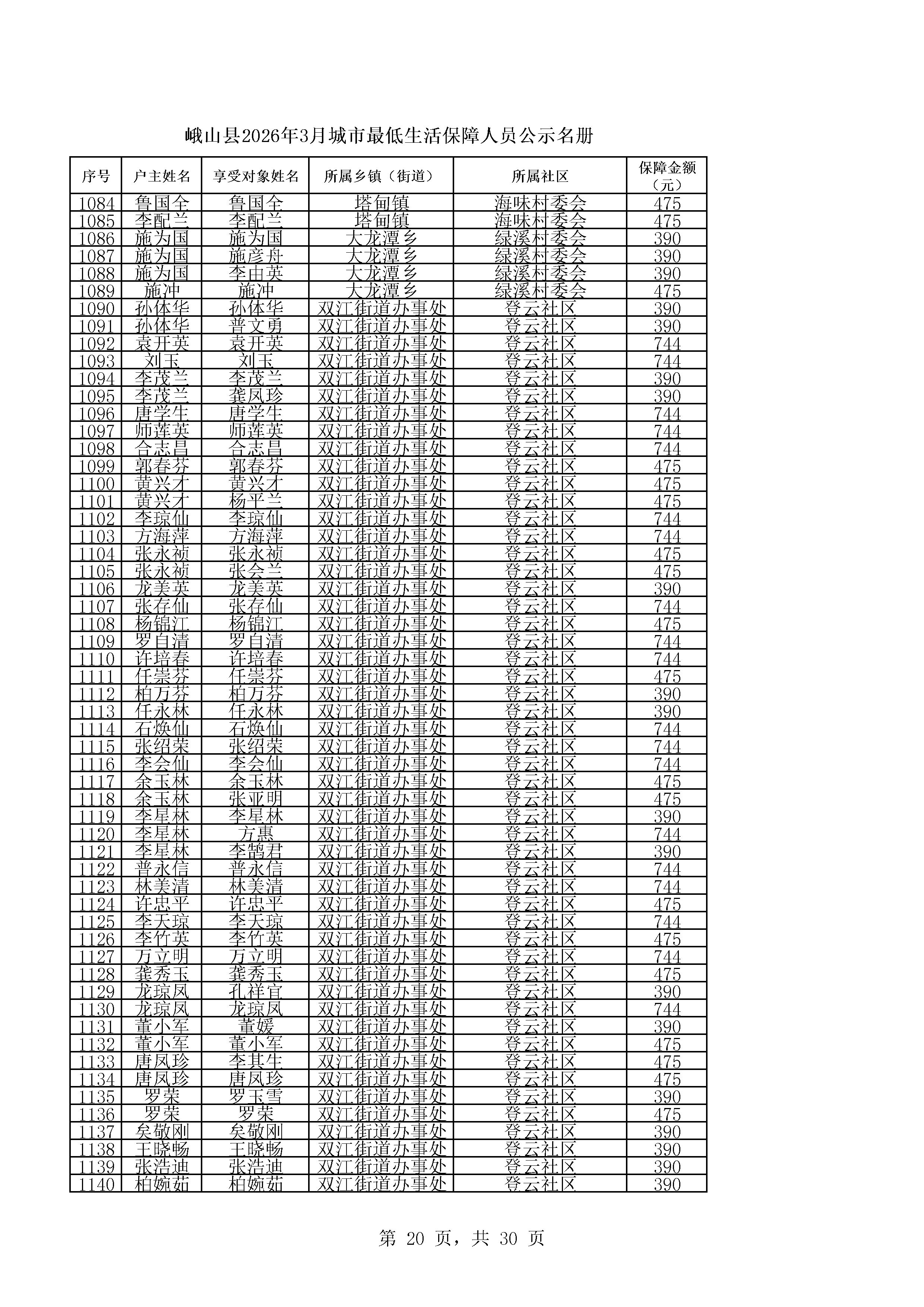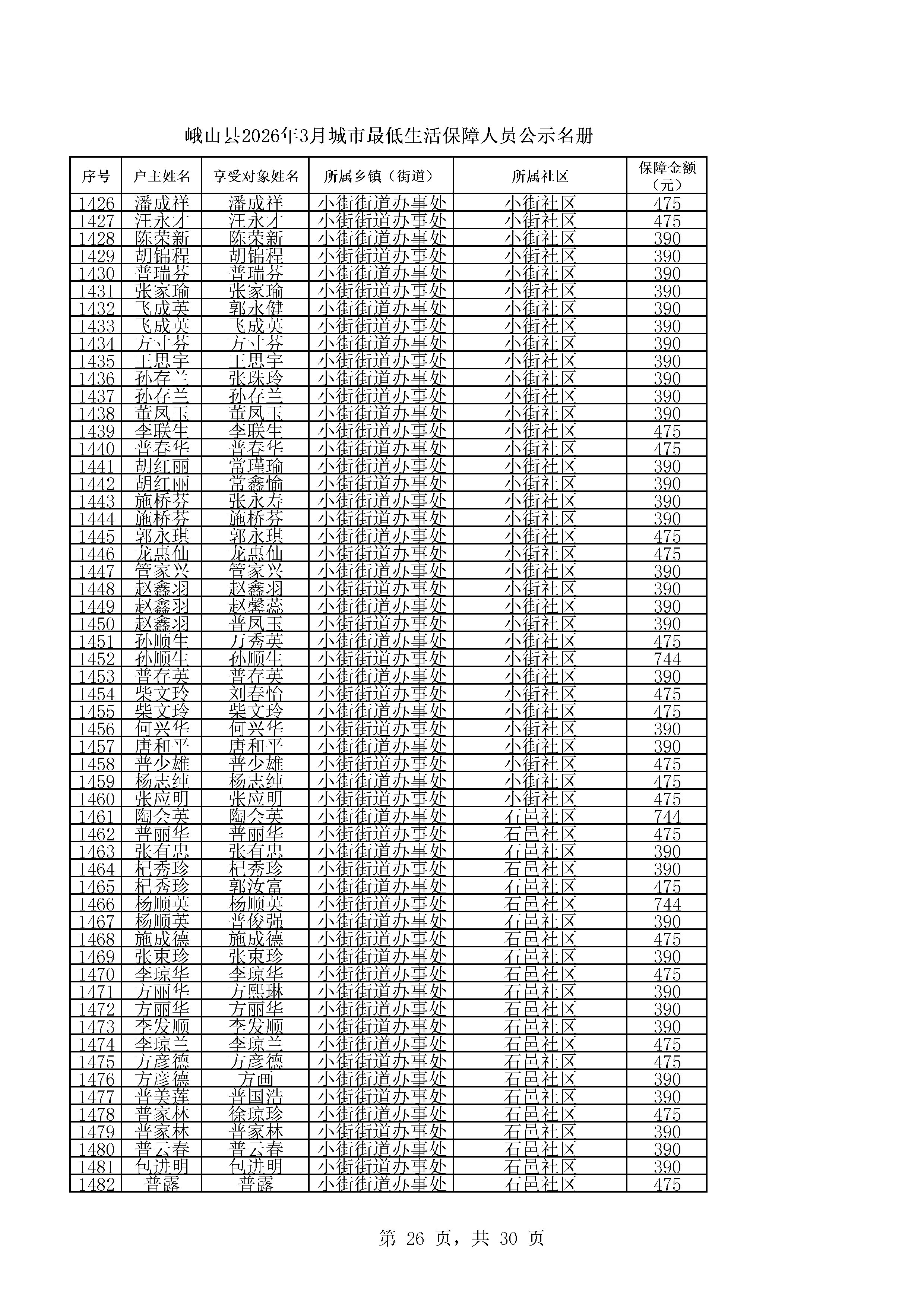 峨山县2026年3月城市最低生活保障人员公示名册