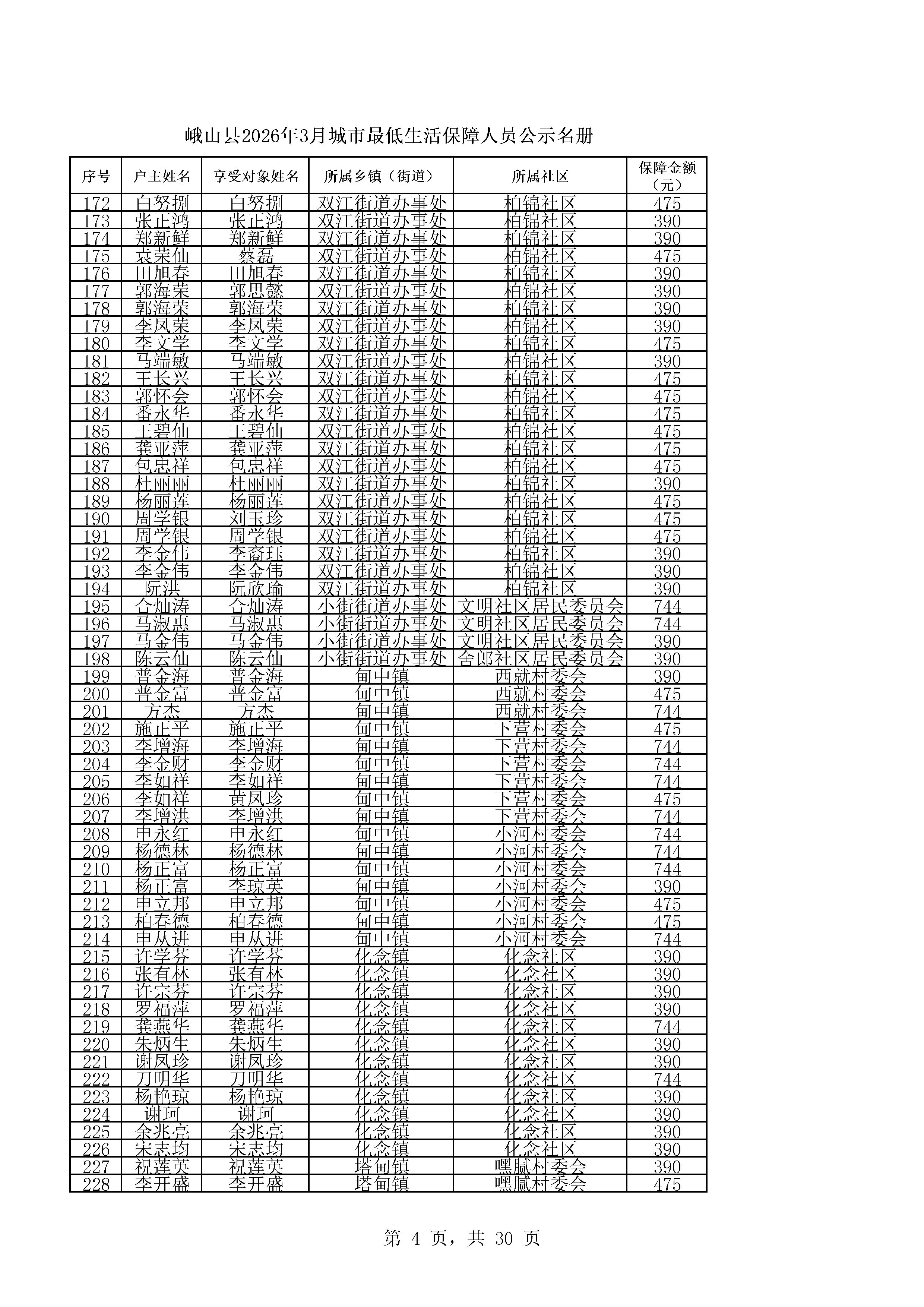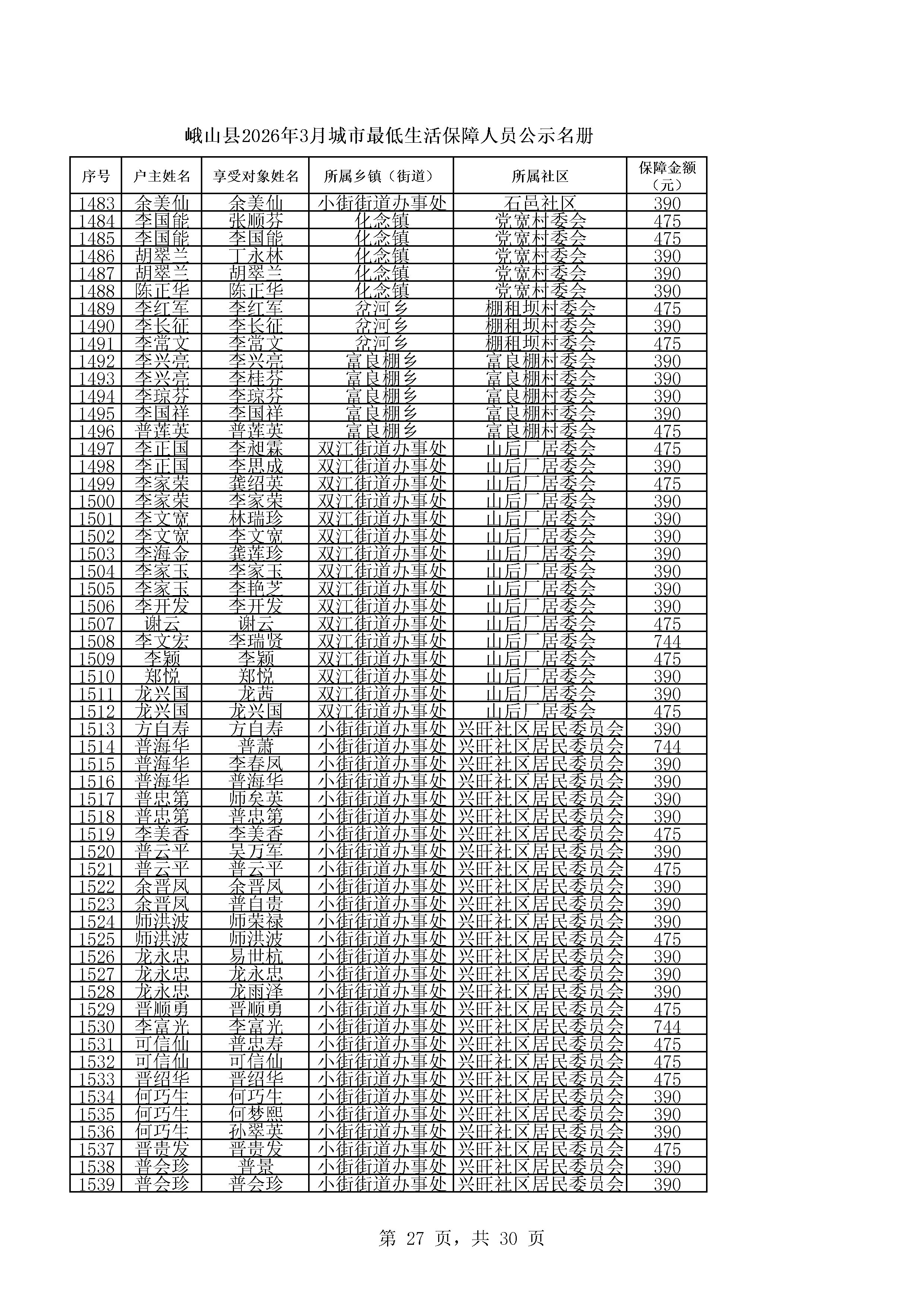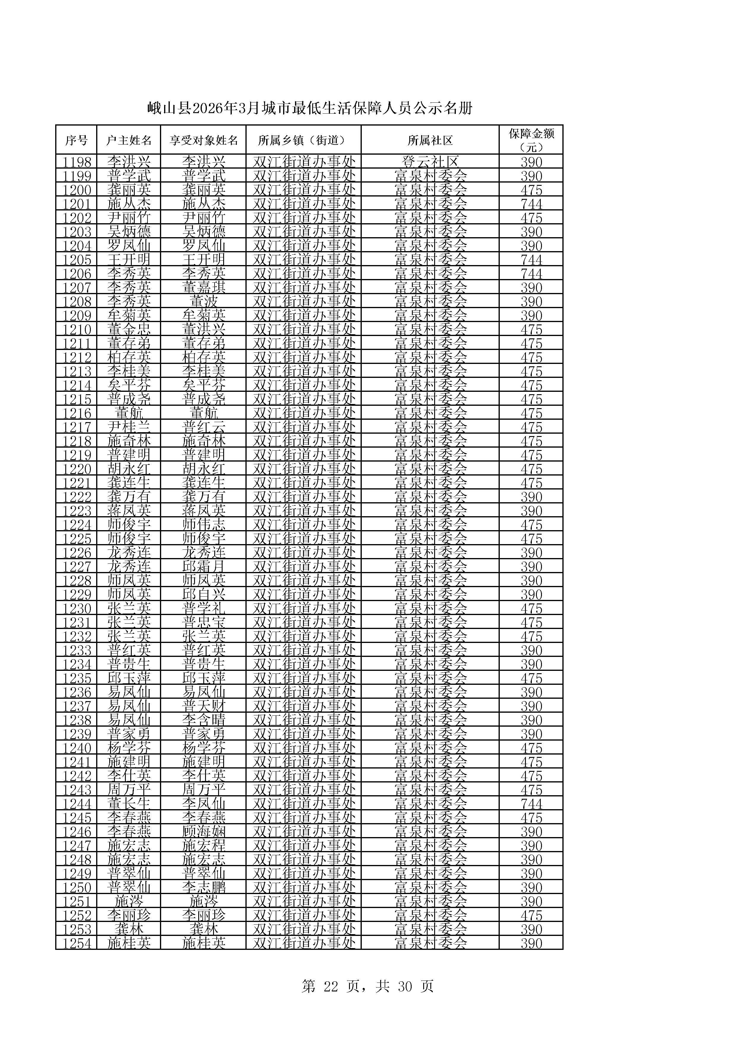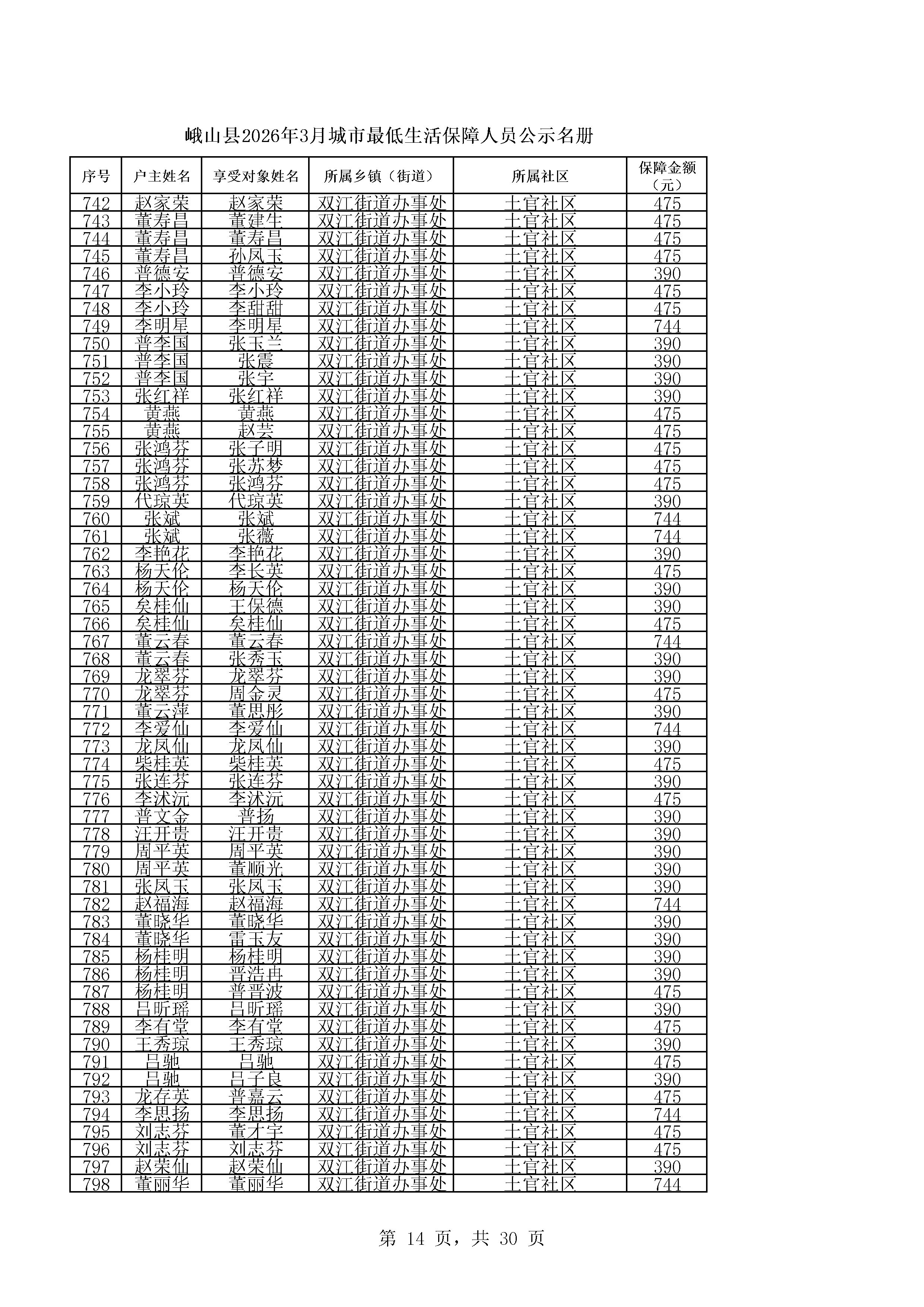 峨山县2026年3月城市最低生活保障人员公示名册