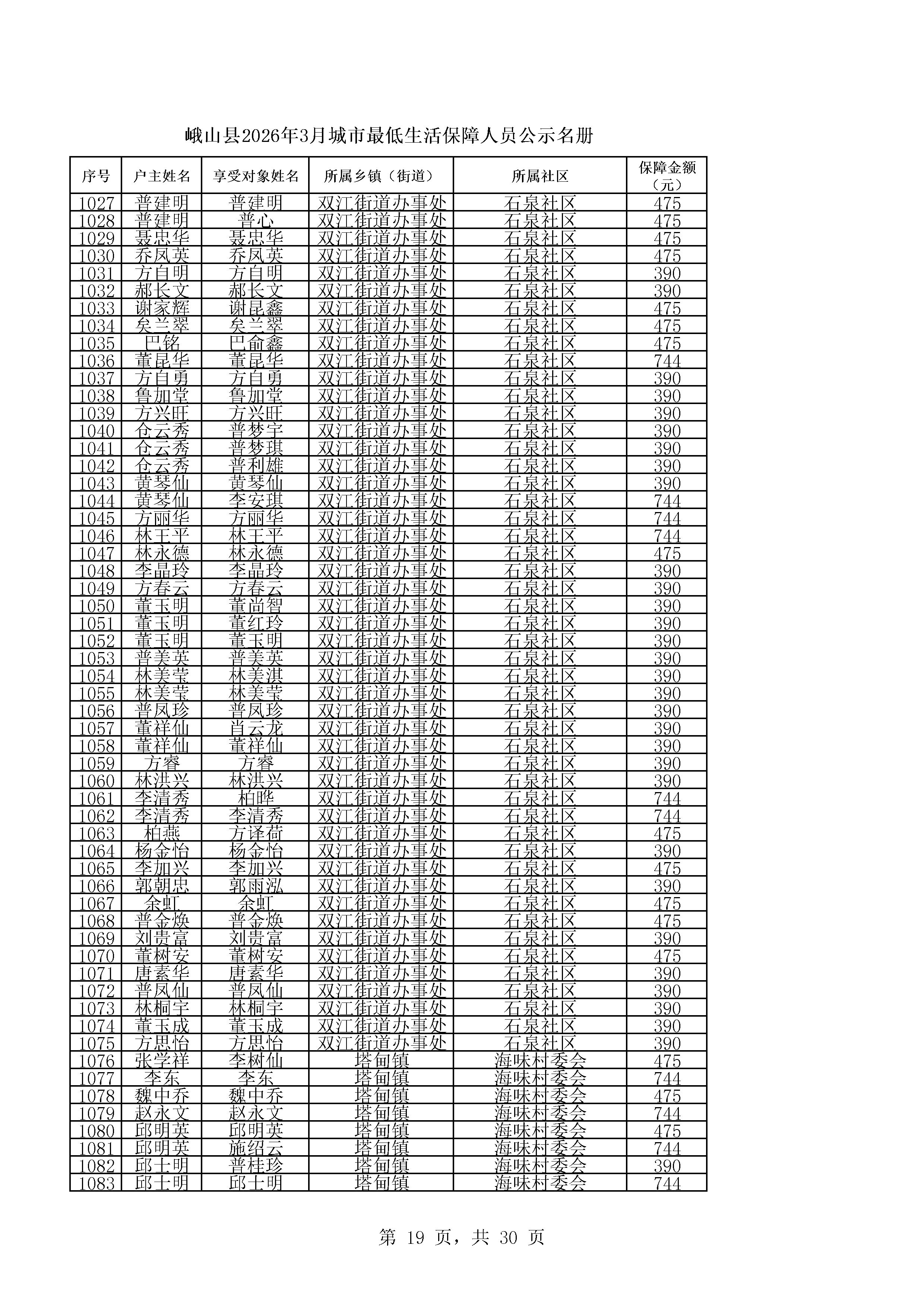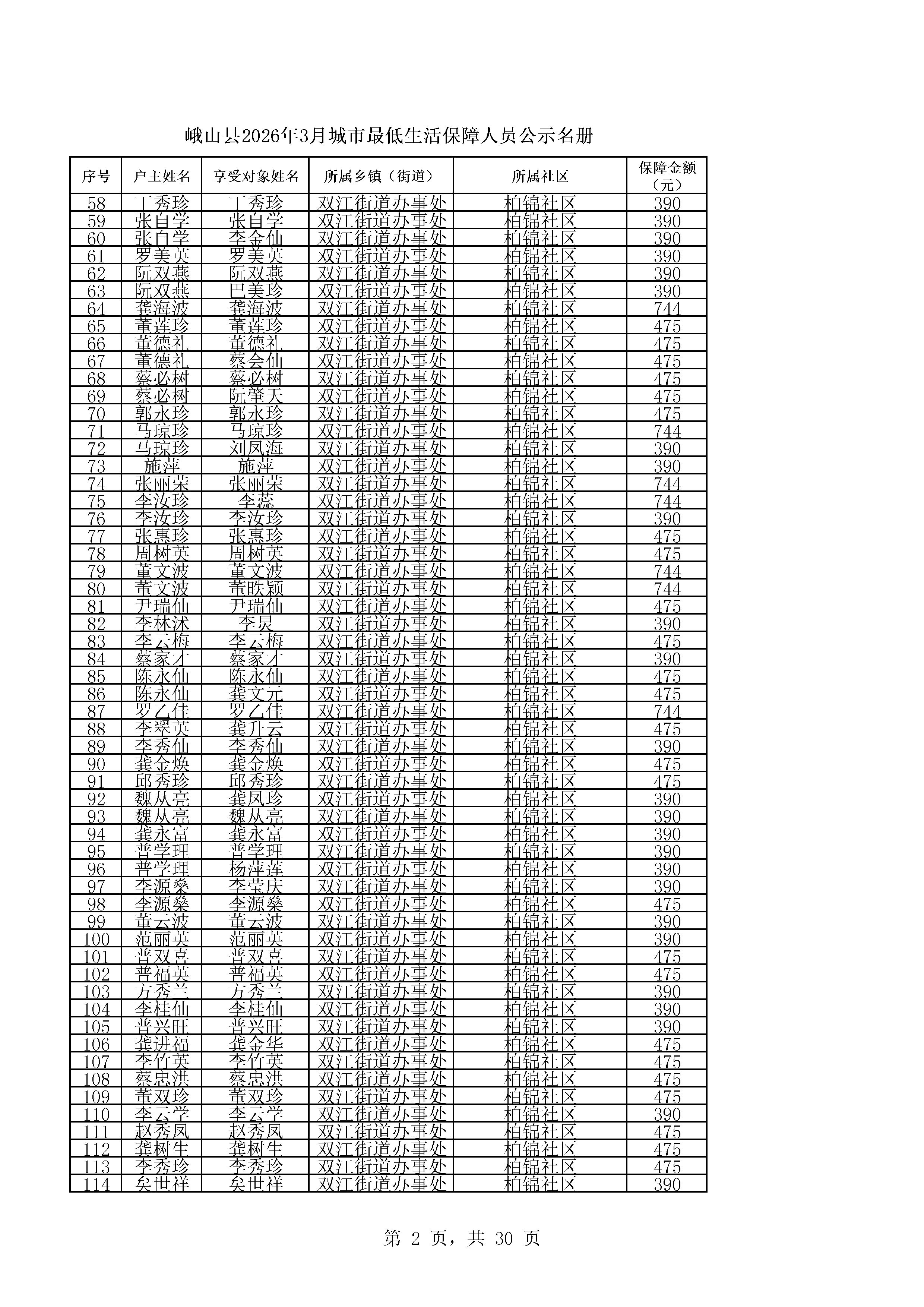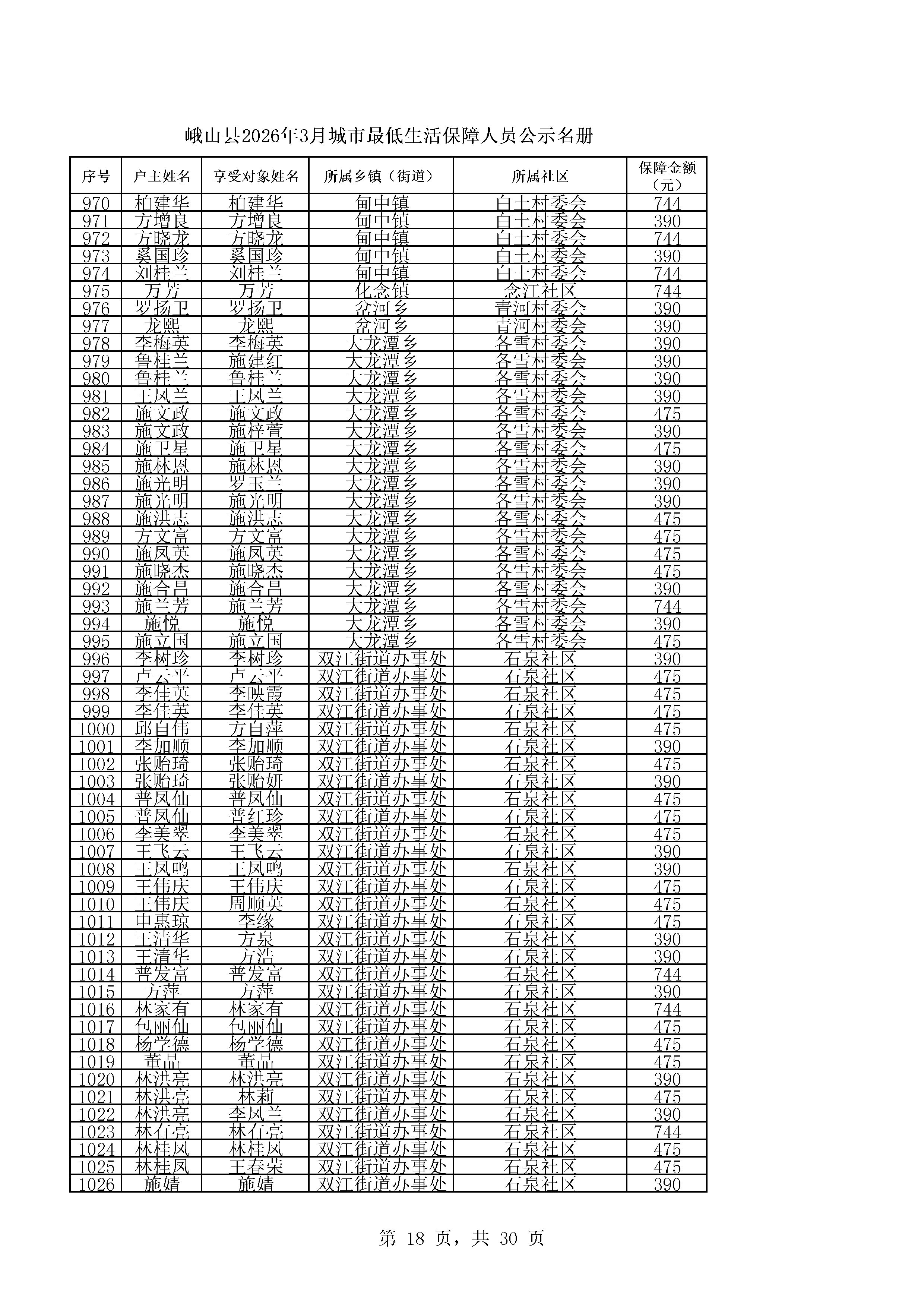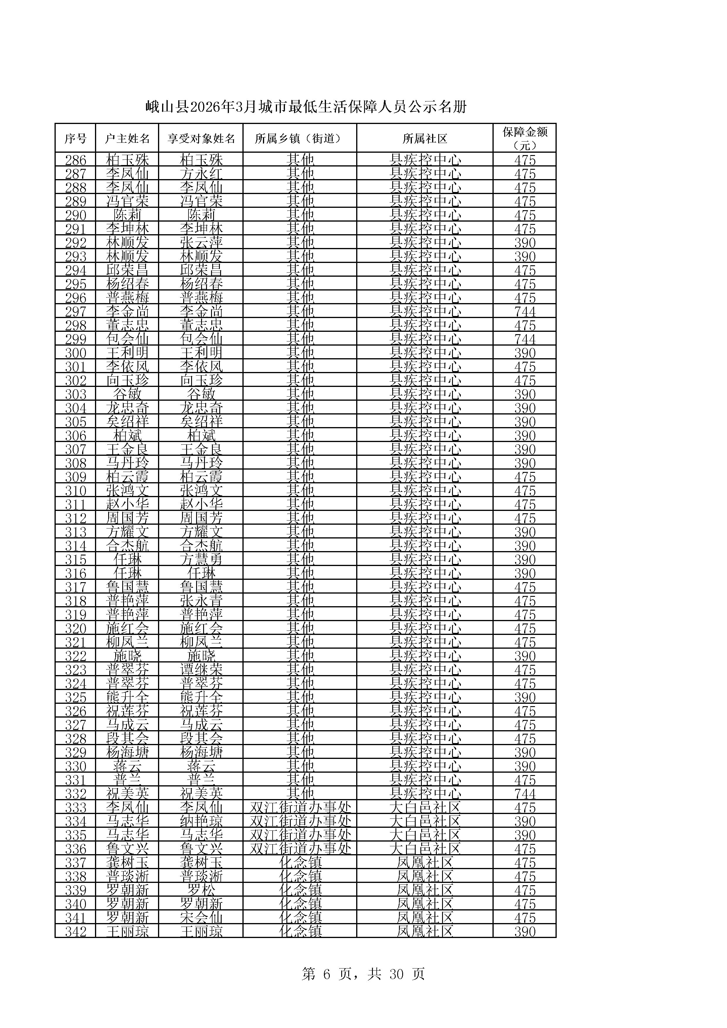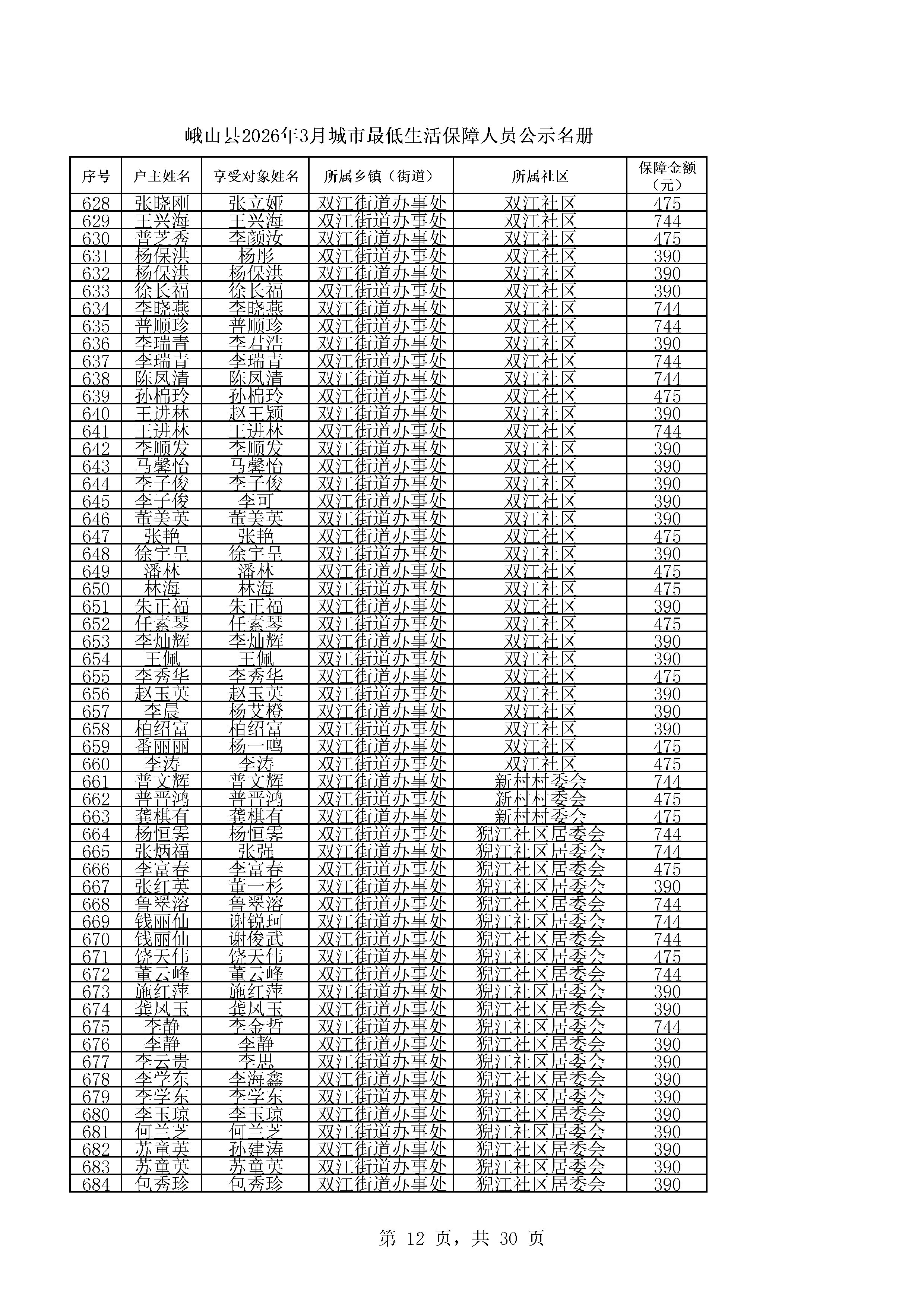 峨山县2026年3月城市最低生活保障人员公示名册