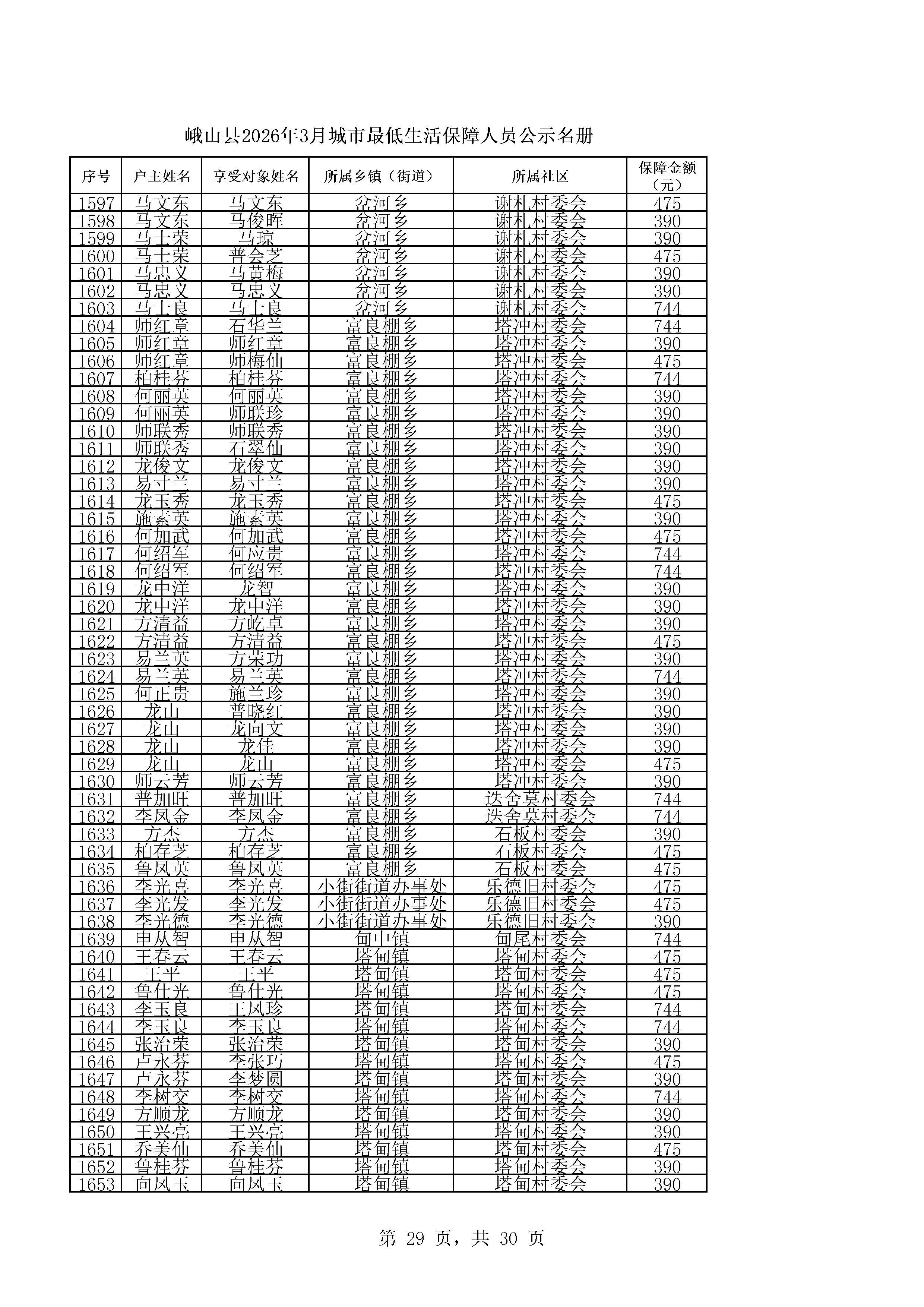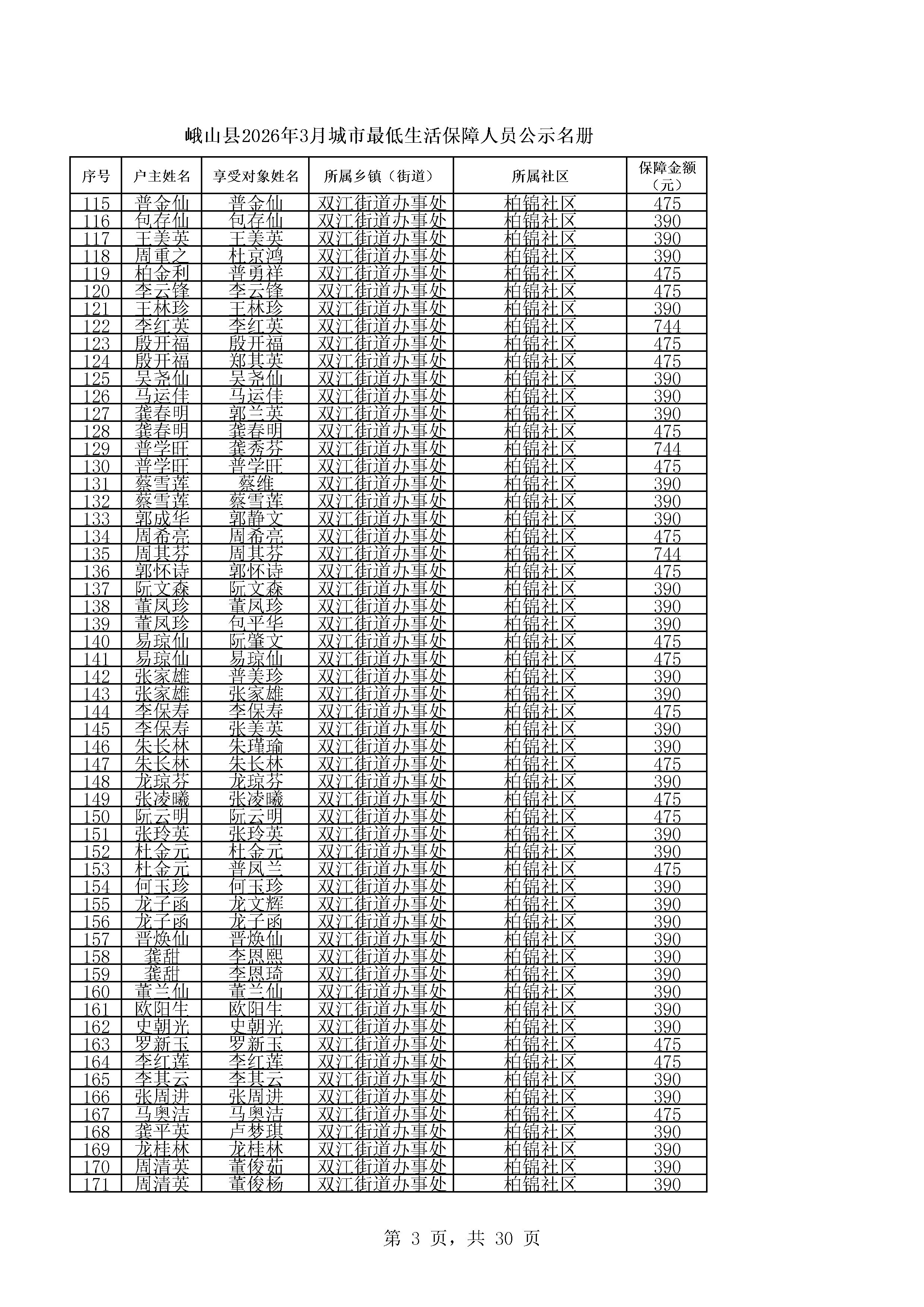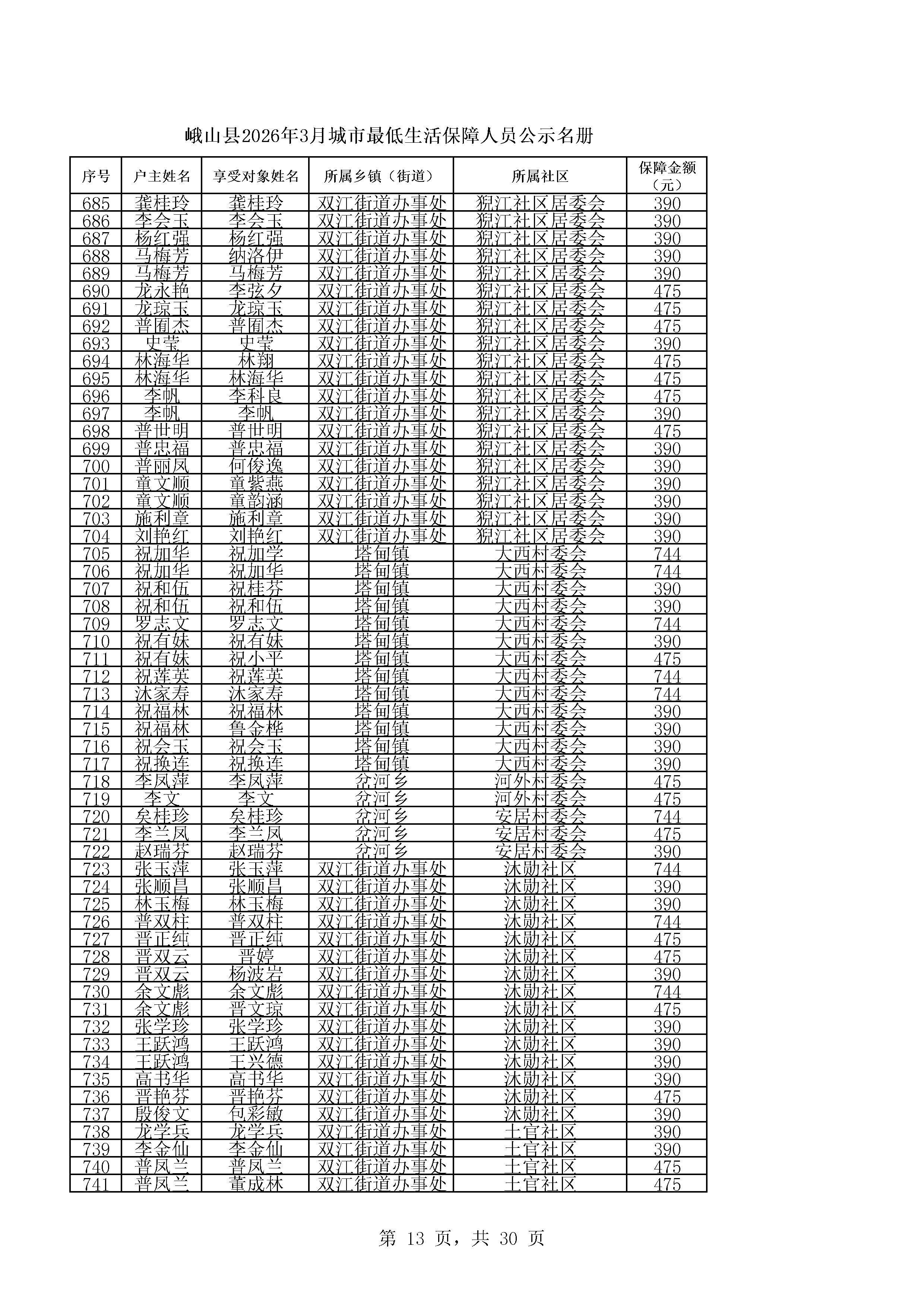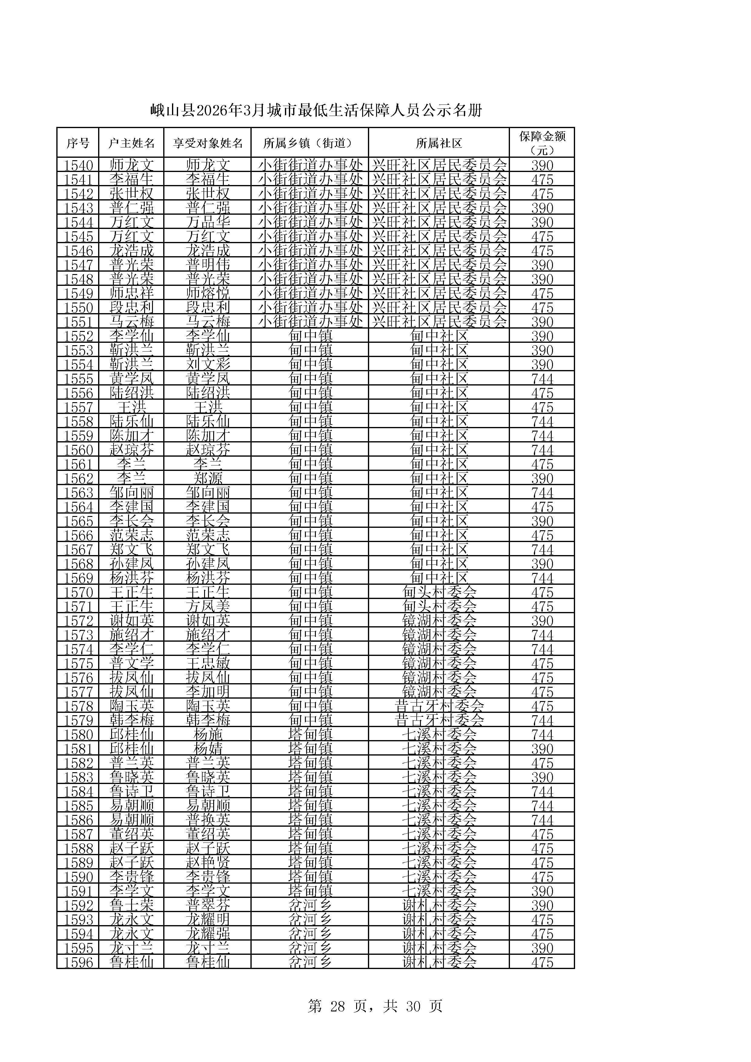 峨山县2026年3月城市最低生活保障人员公示名册
