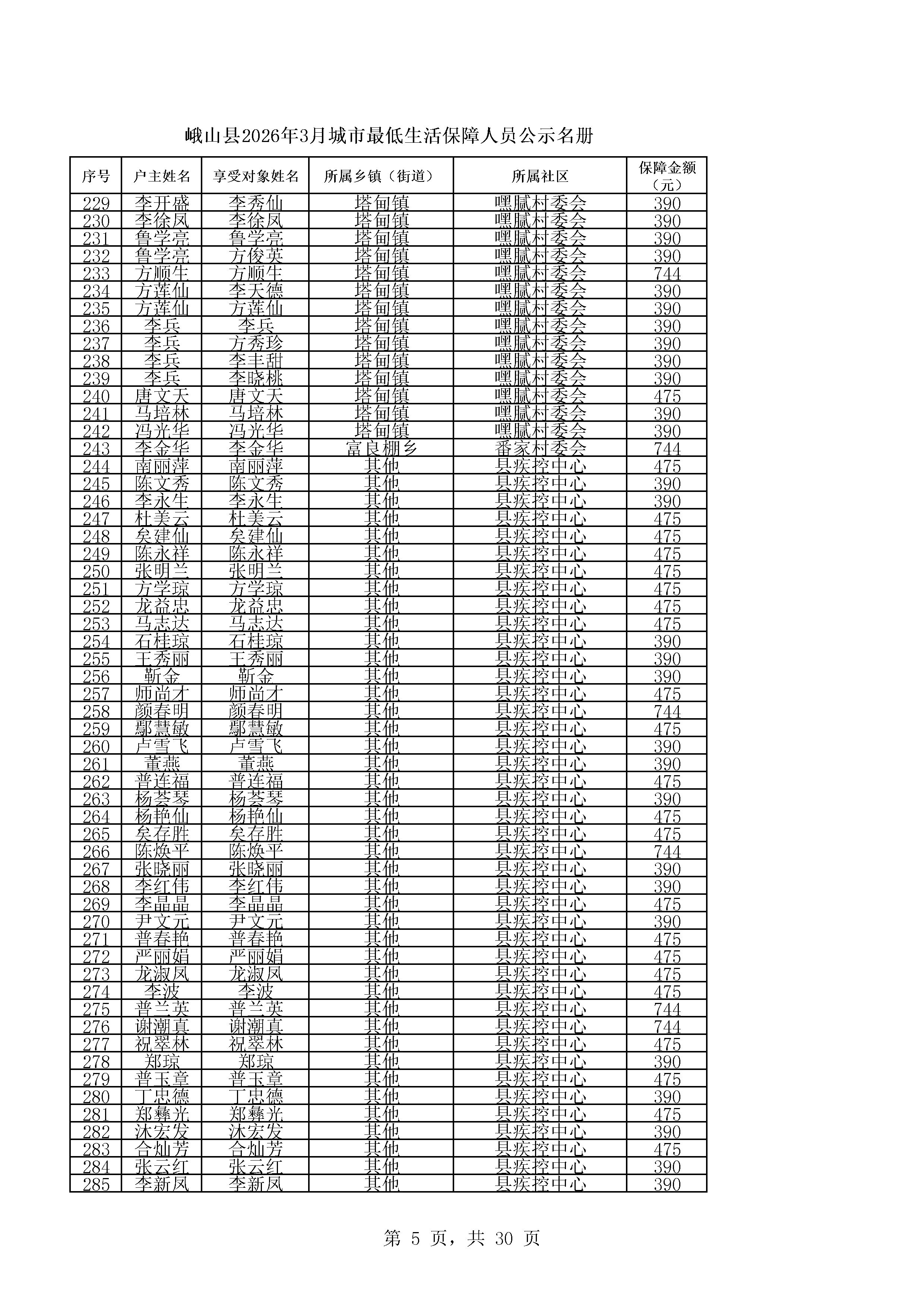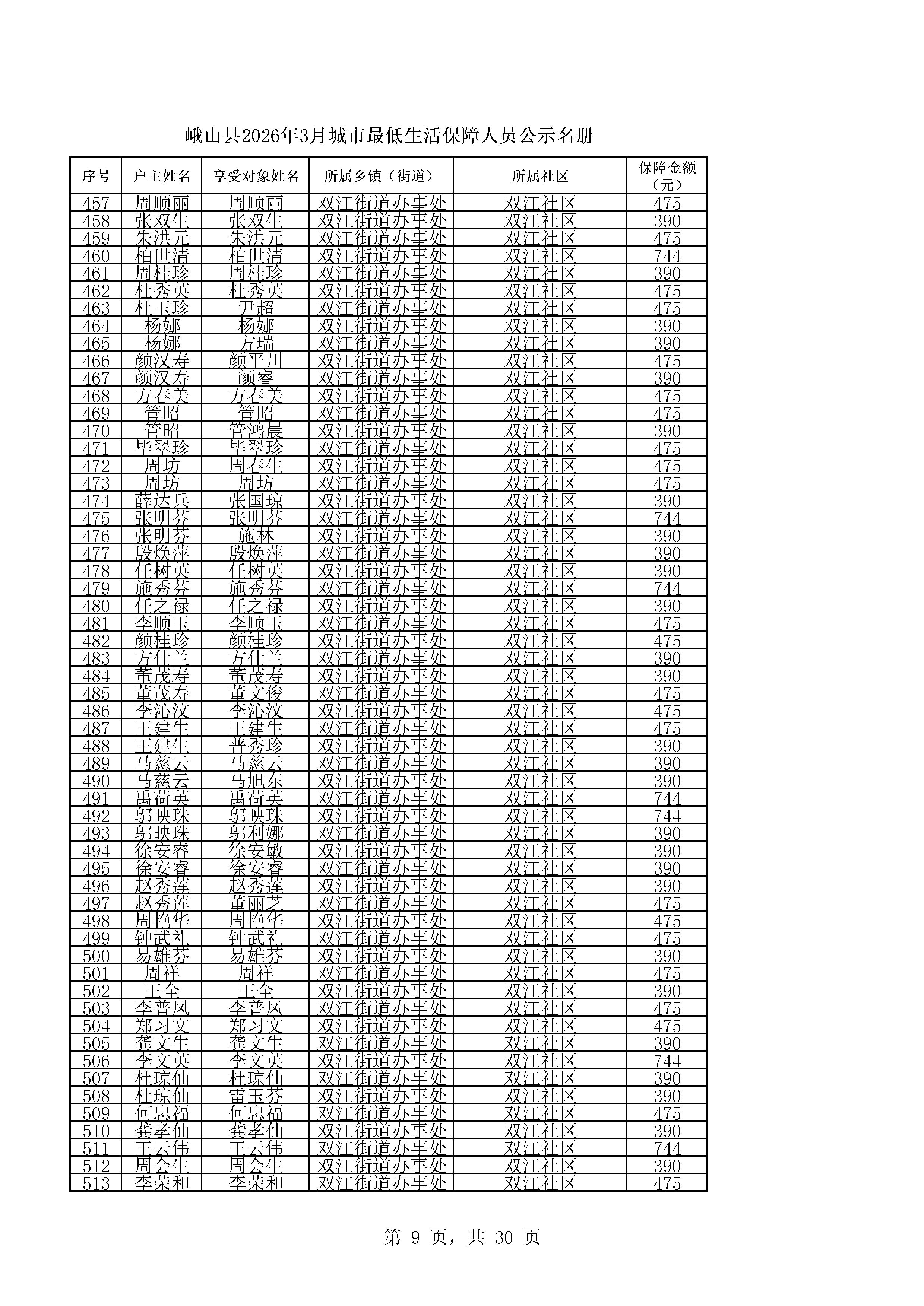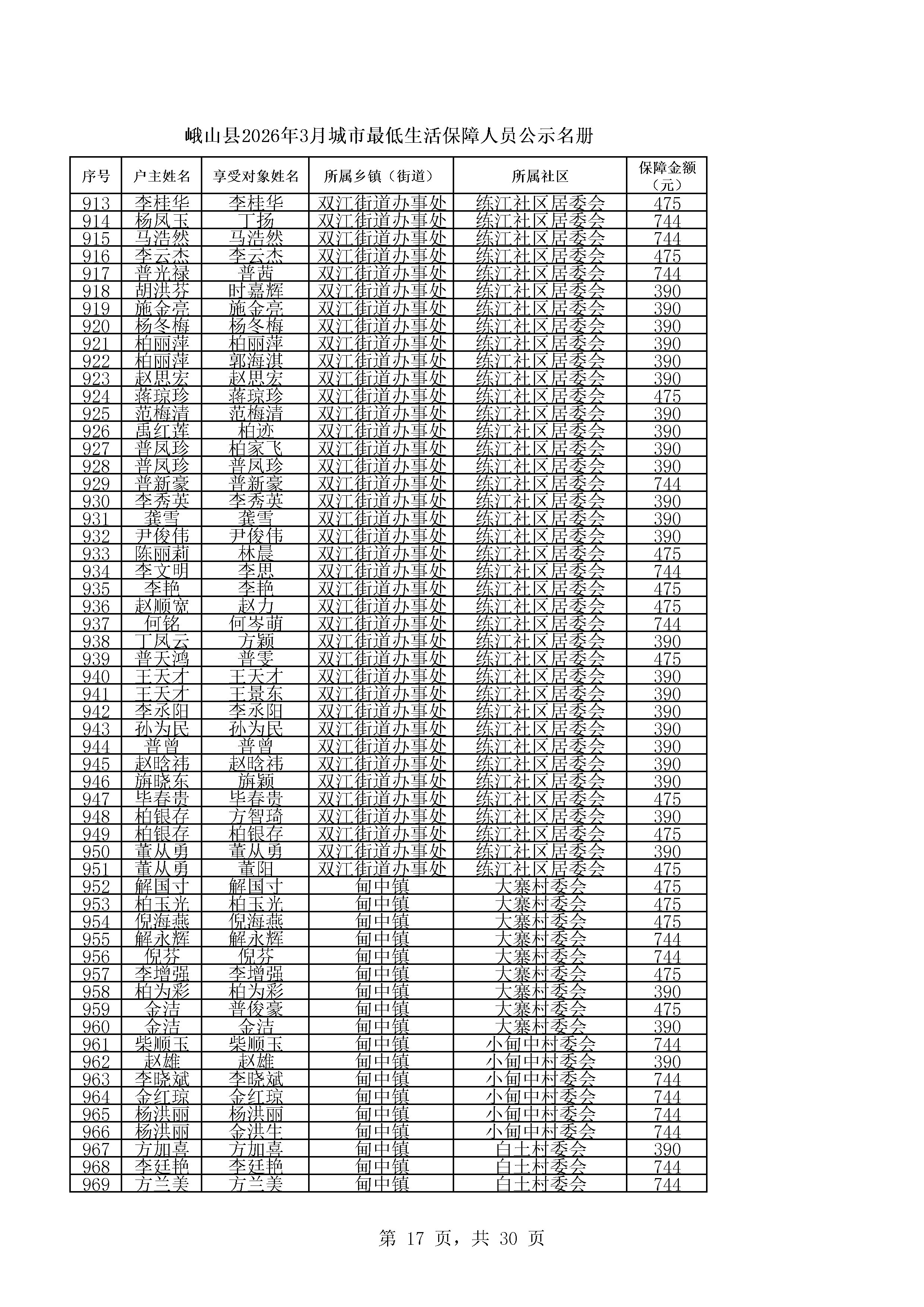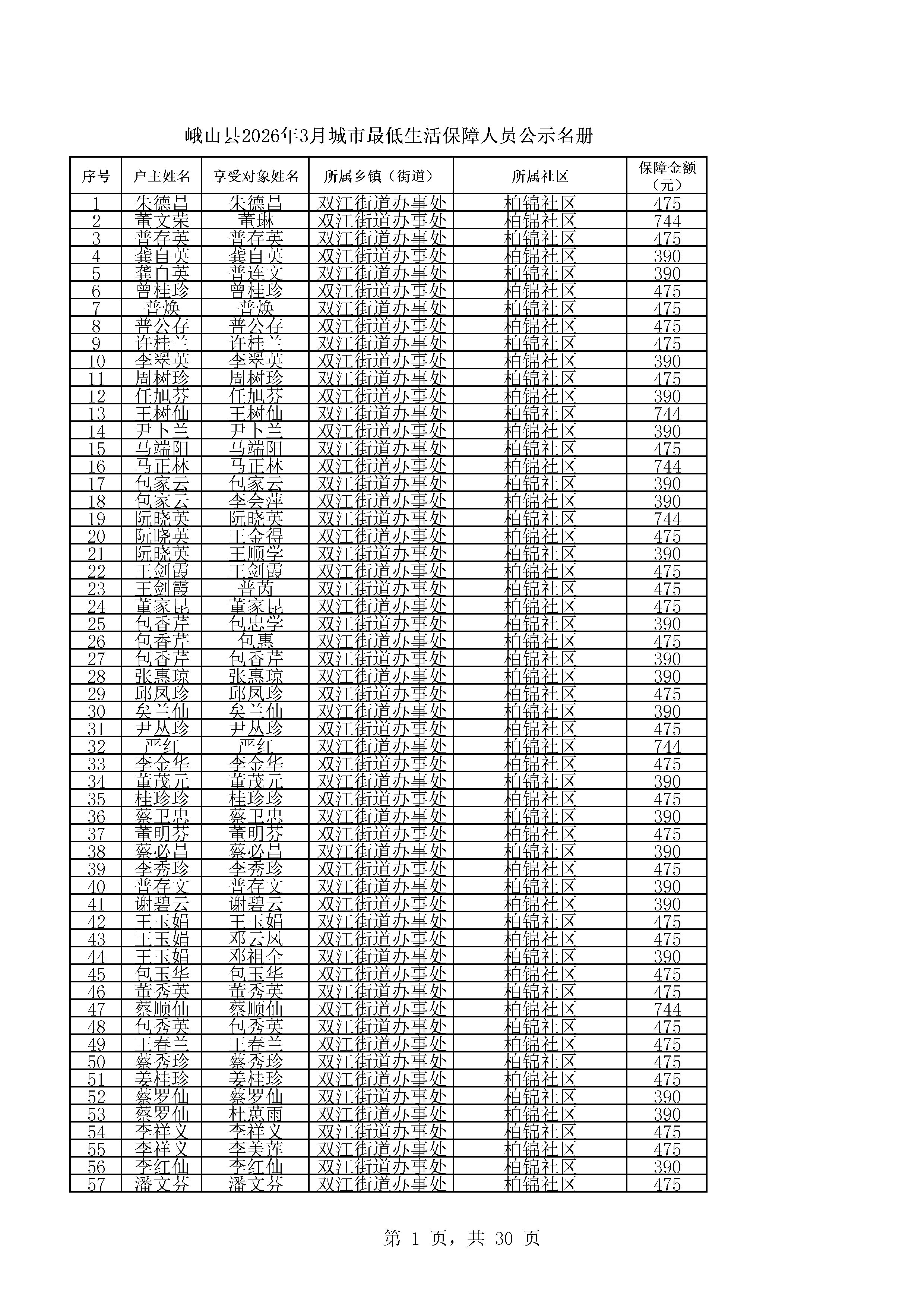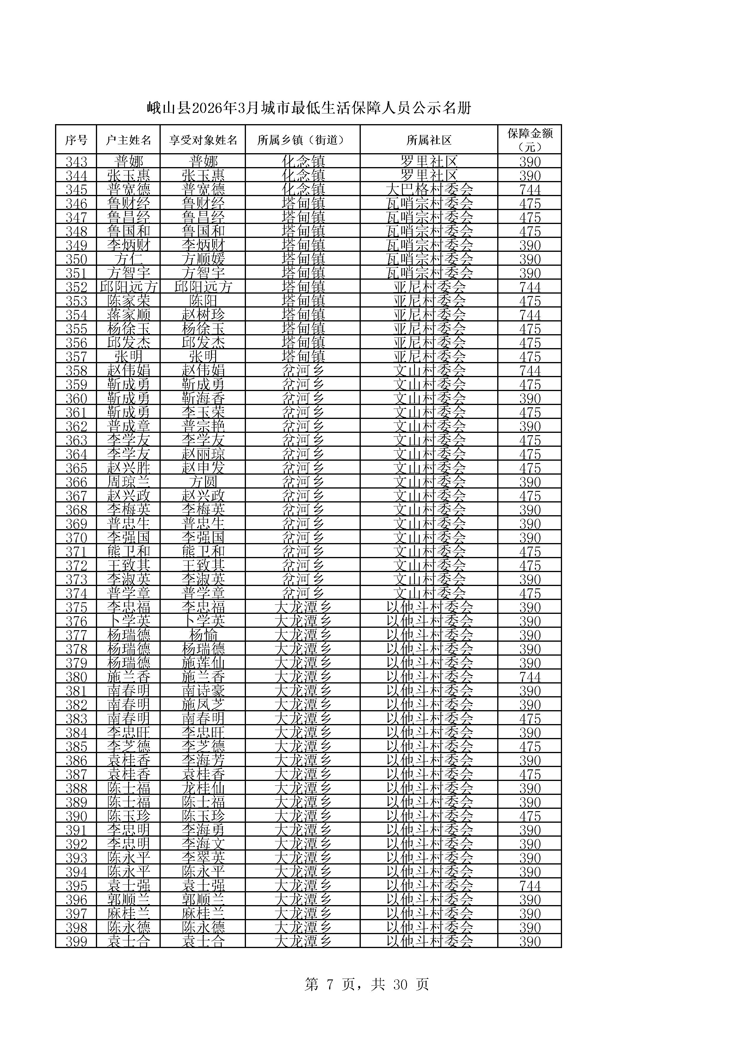 峨山县2026年3月城市最低生活保障人员公示名册