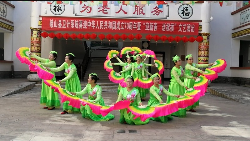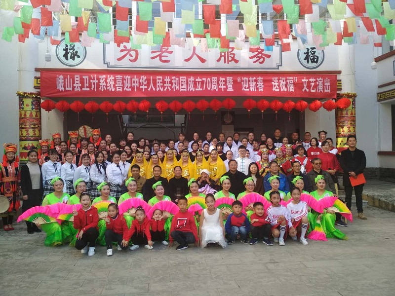 爆竹声声辞旧岁,在新春到来之际,为深入贯彻党的十九大精神,喜迎中华人民共和国成立70周年,弘扬中华民族传统美德和时代精神,大力培育和践行社会主义核心价值观,推动峨山县文明城市创建工作深入开展,提升文明程度。以节日为契机,有力推进医疗卫生与养老服务相结合各项工作,秉承“奉献爱心,服务社会”的宗旨,弘扬中华民族尊敬和关爱老人的优良传统。2019年2月1日,由峨山县卫生计生党工委、峨山县卫生计生局主办,峨山县中医医院承办,县其他医疗单位及各乡镇(街道)卫生院协办的喜迎中华人民共和国成立70周年暨“迎新春·送祝福”文艺汇演在峨山县中心敬老院隆重举行,为敬老院70余名老人送上了一台精彩纷呈的文艺汇演,县卫生计生党工委副书记施婉婷等卫生局领导班子、县人民医院院长柏跃华、县妇计中心主任蔡志明等一行出席了此次活动。