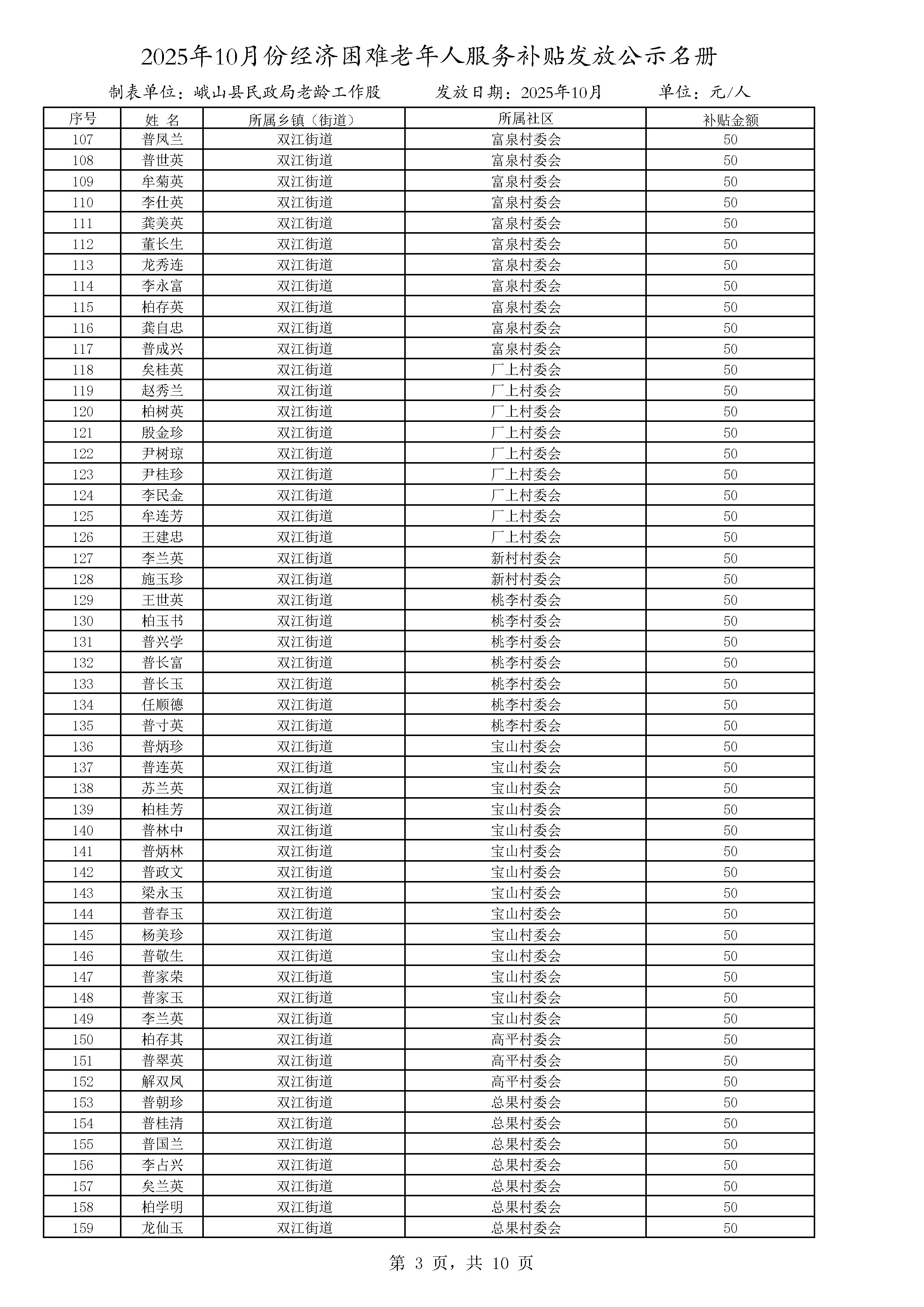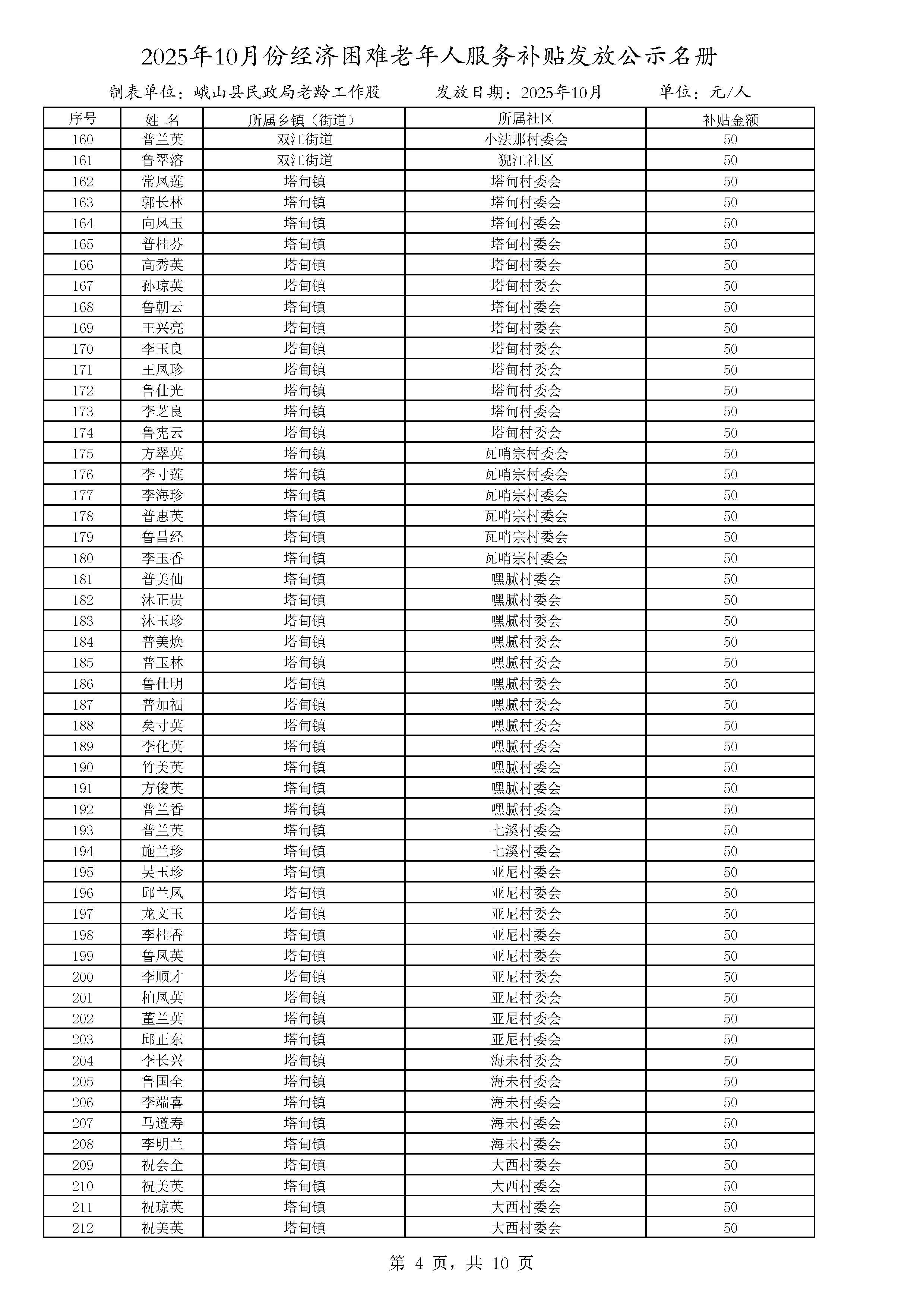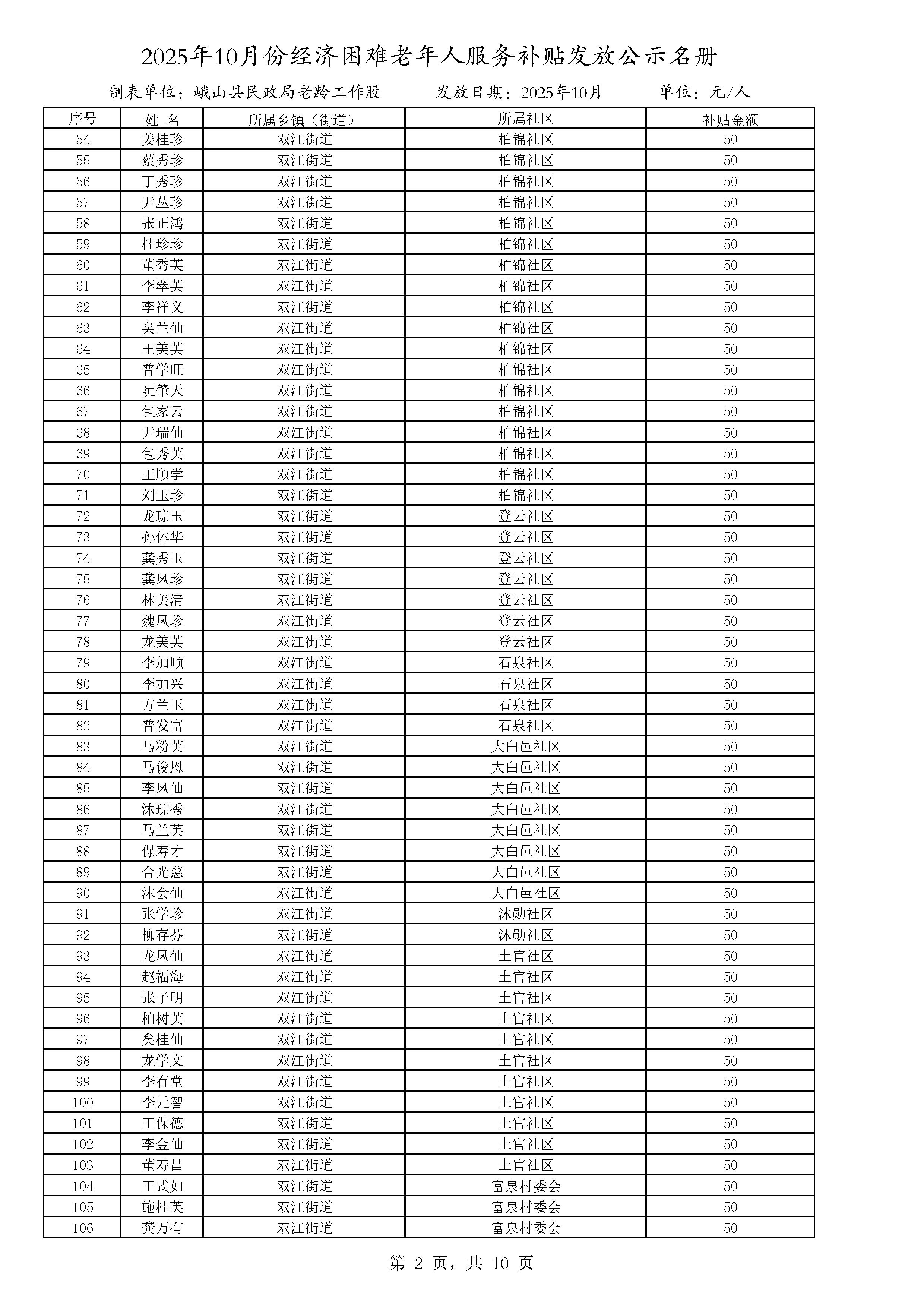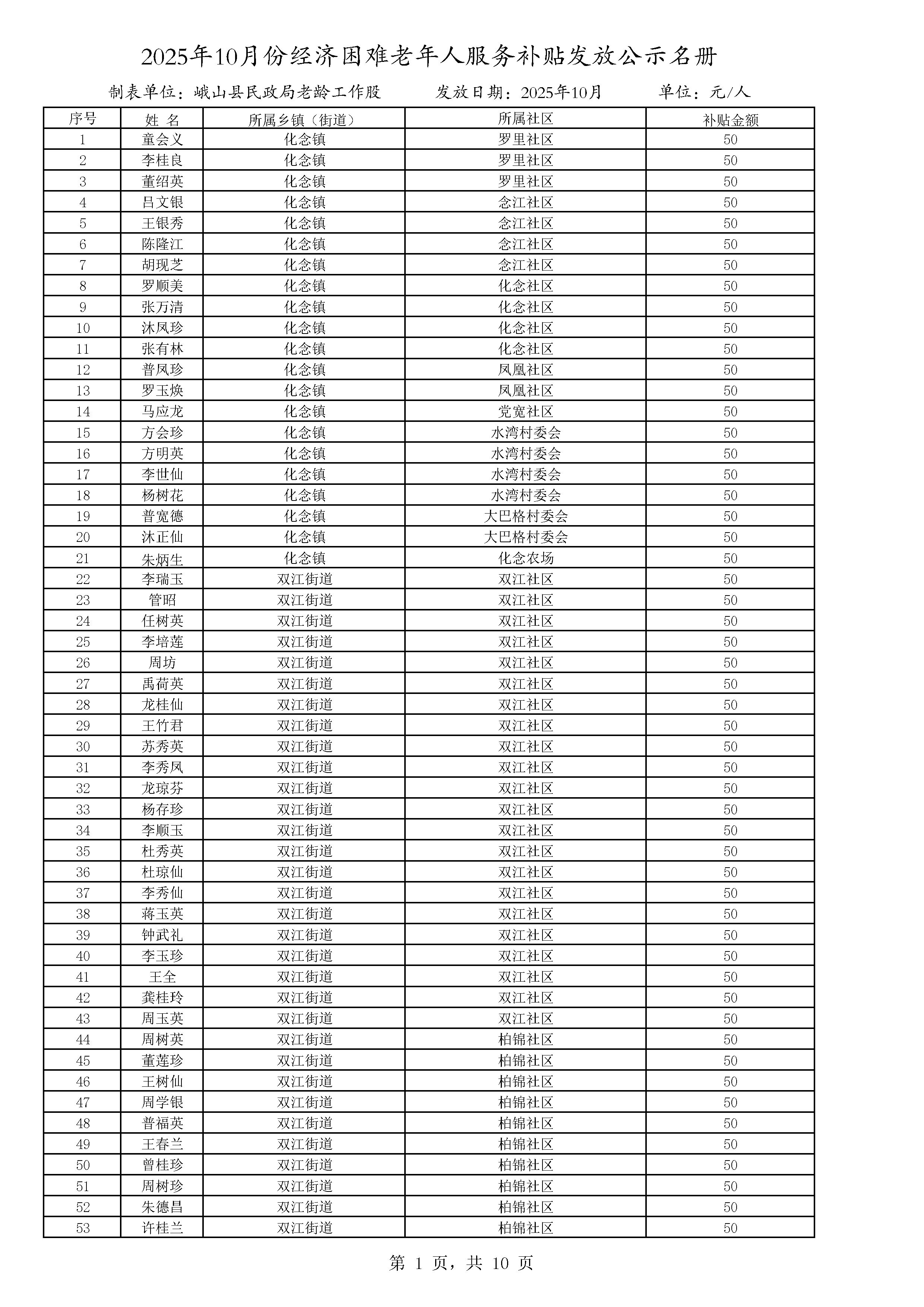 2025年10月份经济困难老年人服务补贴发放公示名册