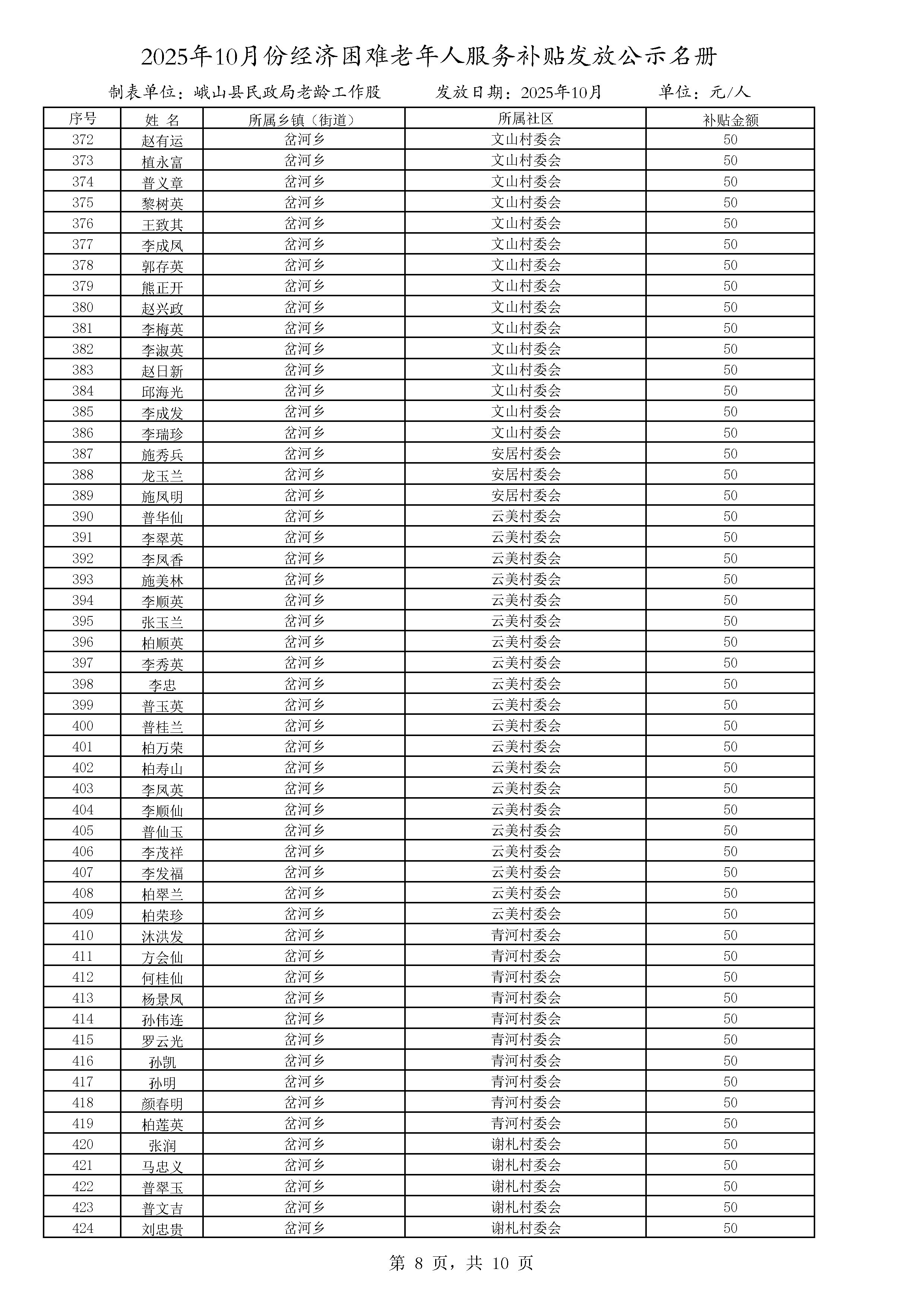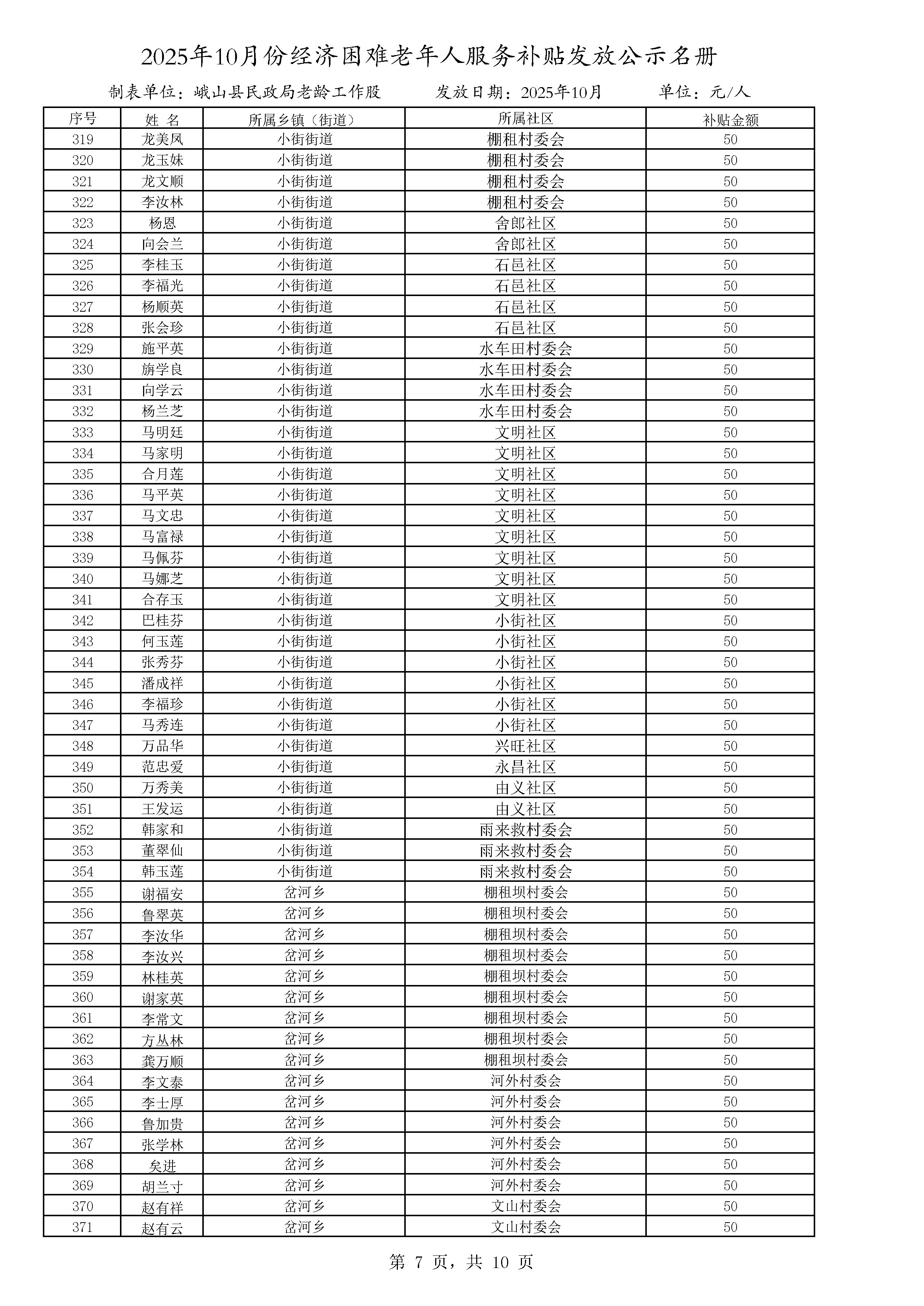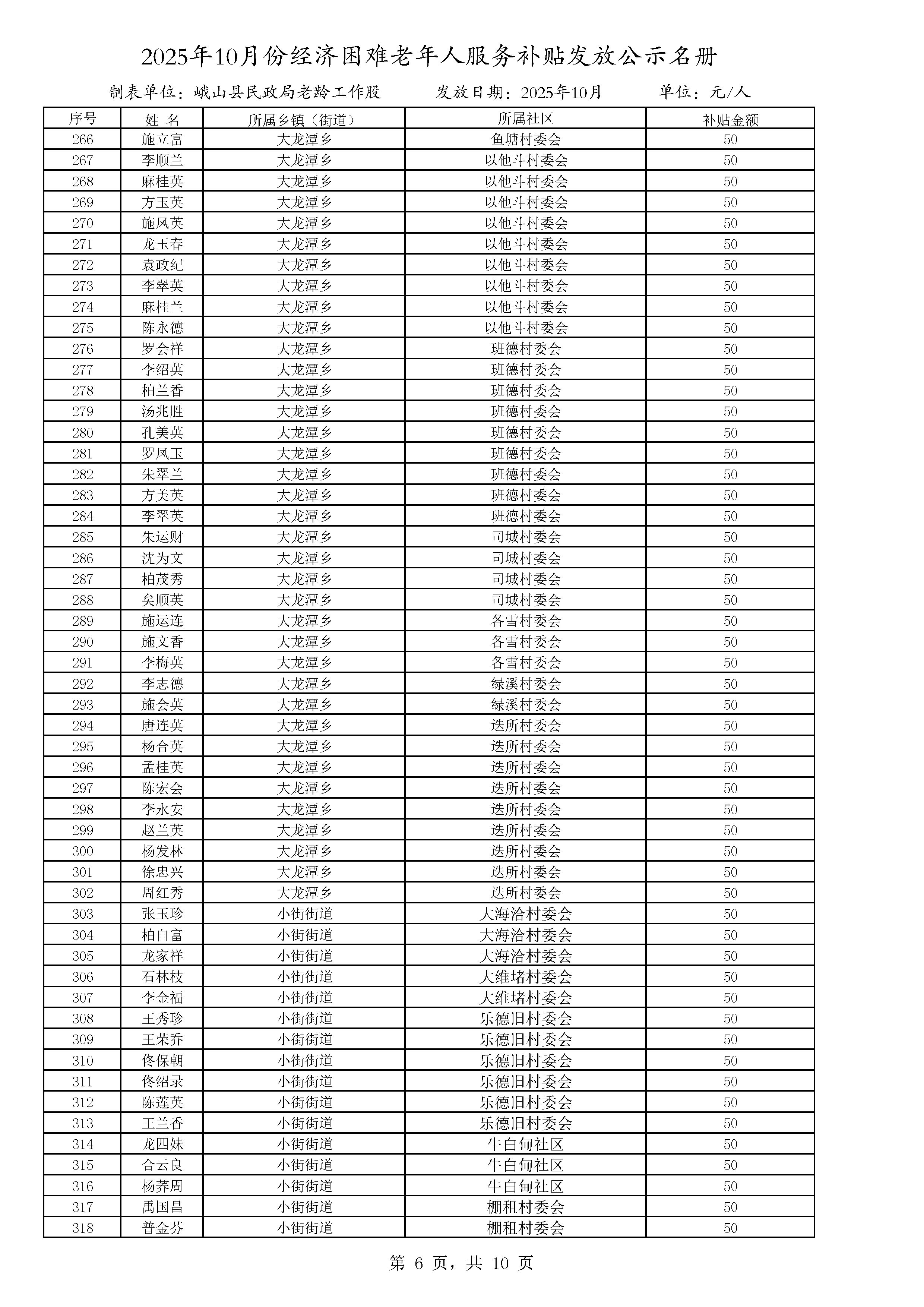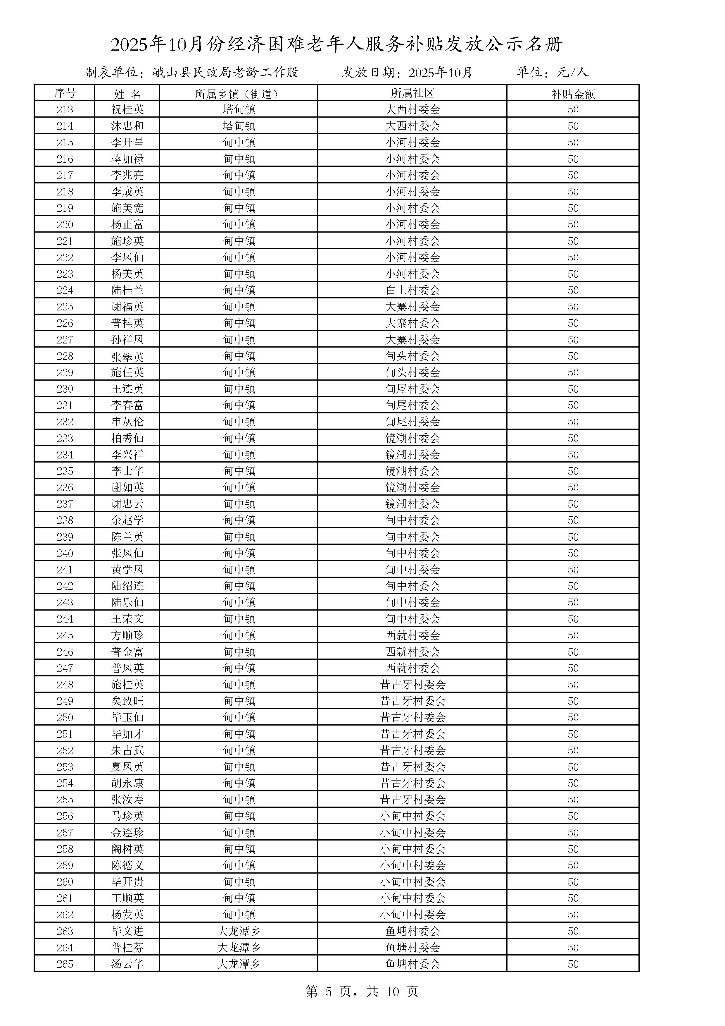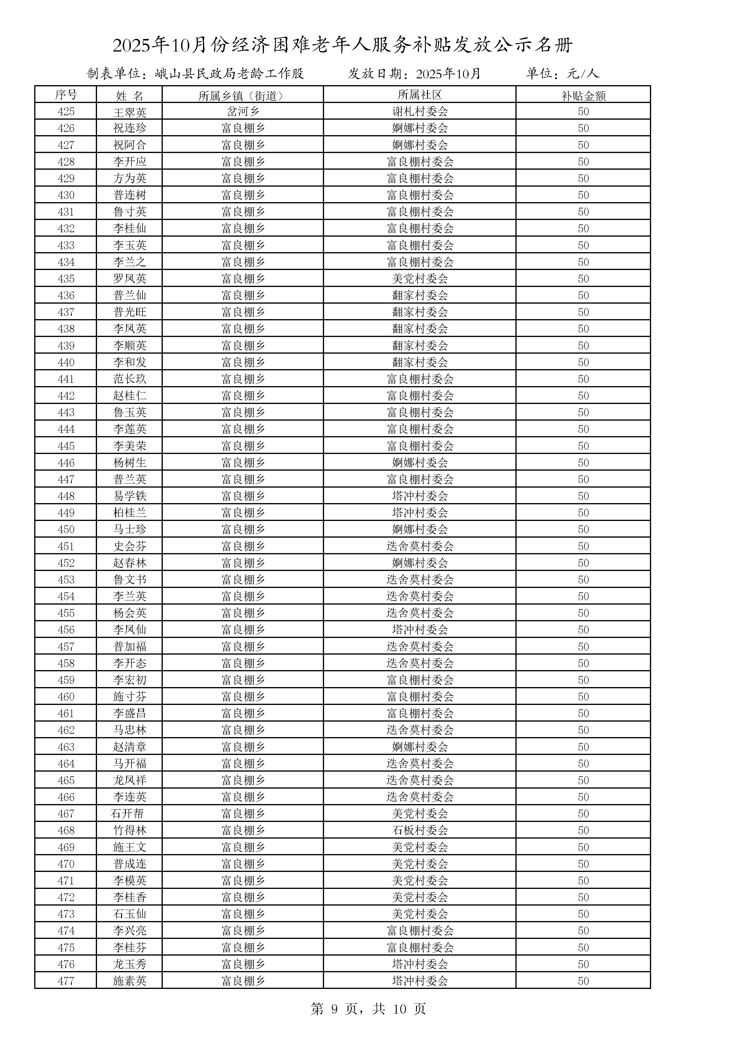 2025年10月份经济困难老年人服务补贴发放公示名册
